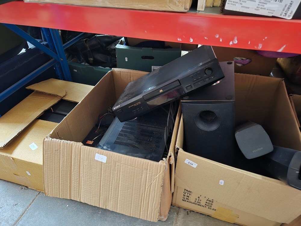 3 boxes containing Sony hi fi separates, Samsung surround system and speakers