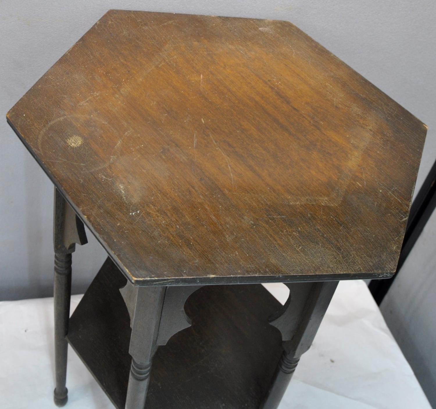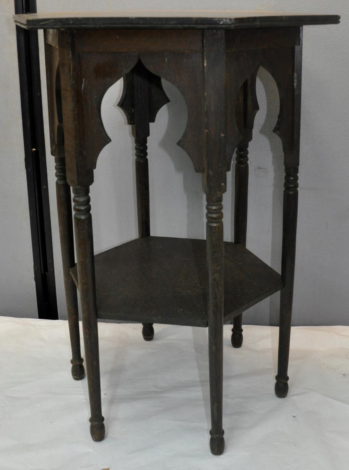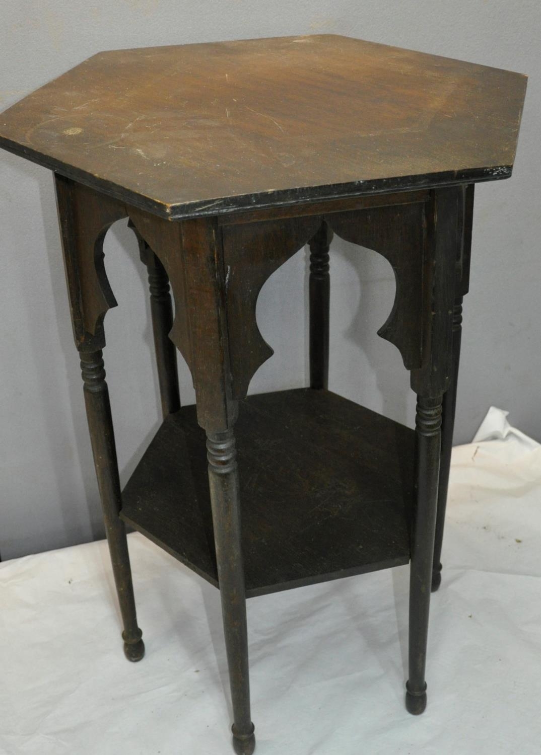 HEXAGONAL OCCASIONAL TABLE ON TURNED SUPPORTS AND UNDERSHELF