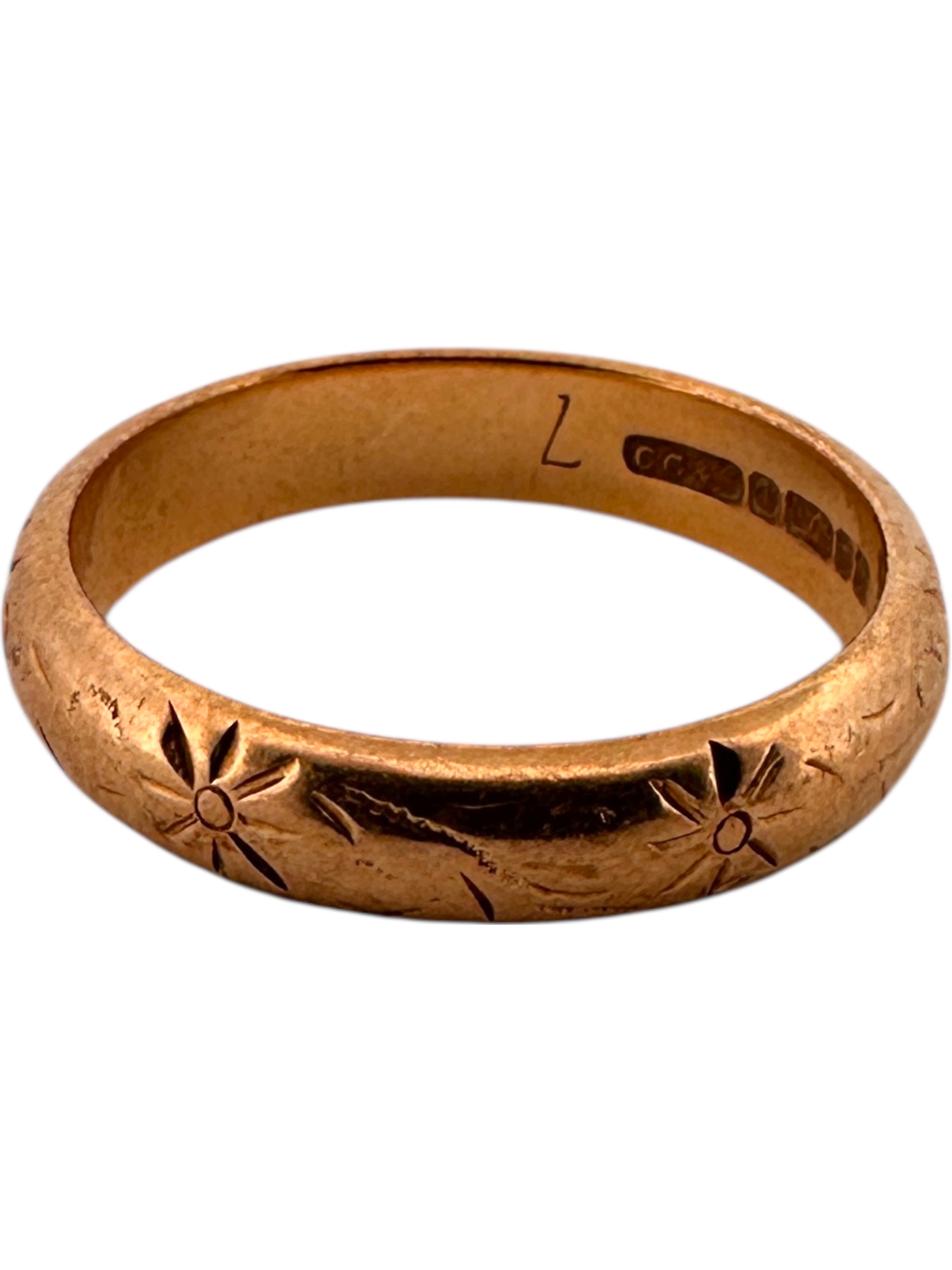 Nine Carat Gold Engraved Band Ring. Full London Hallmarks. Size L. 3g