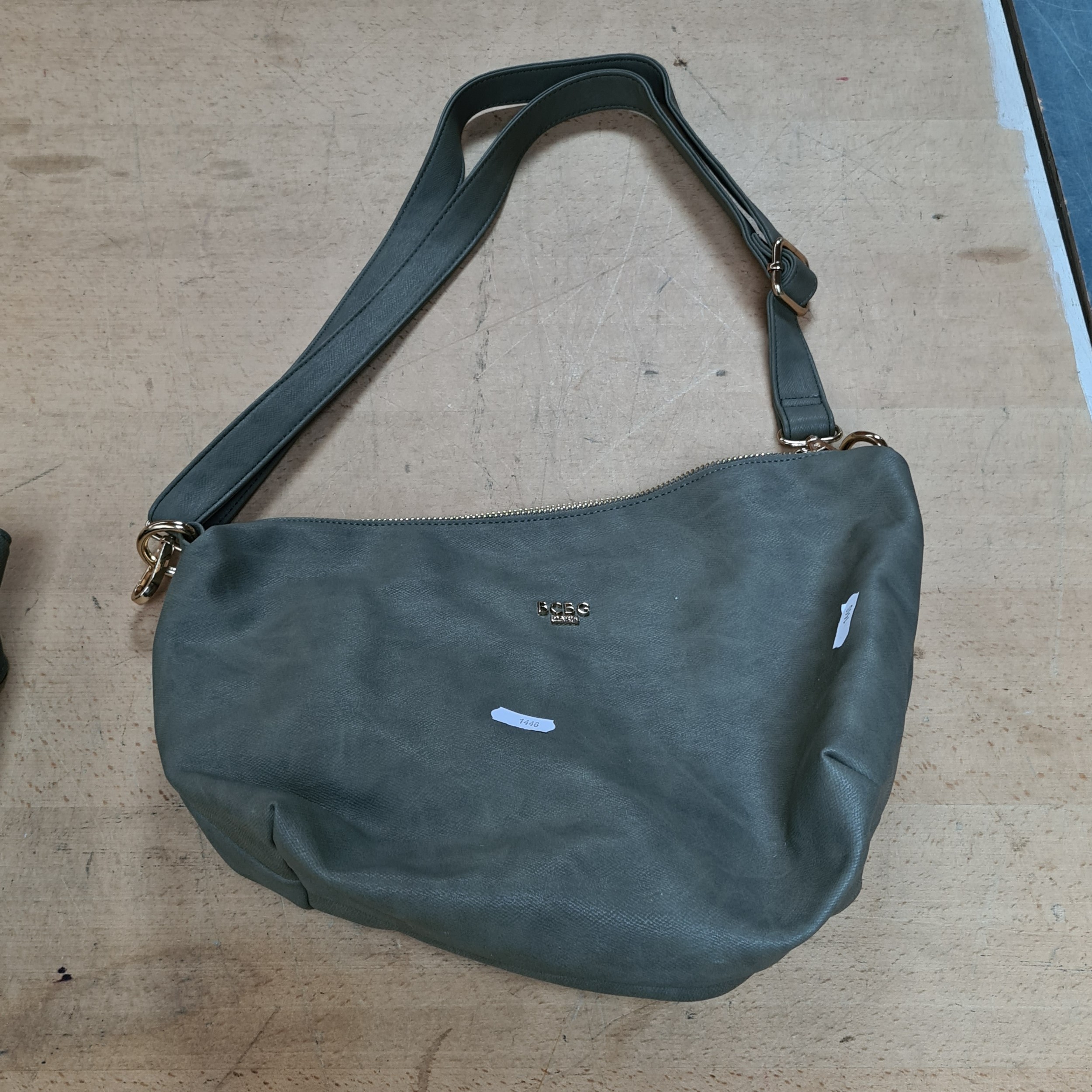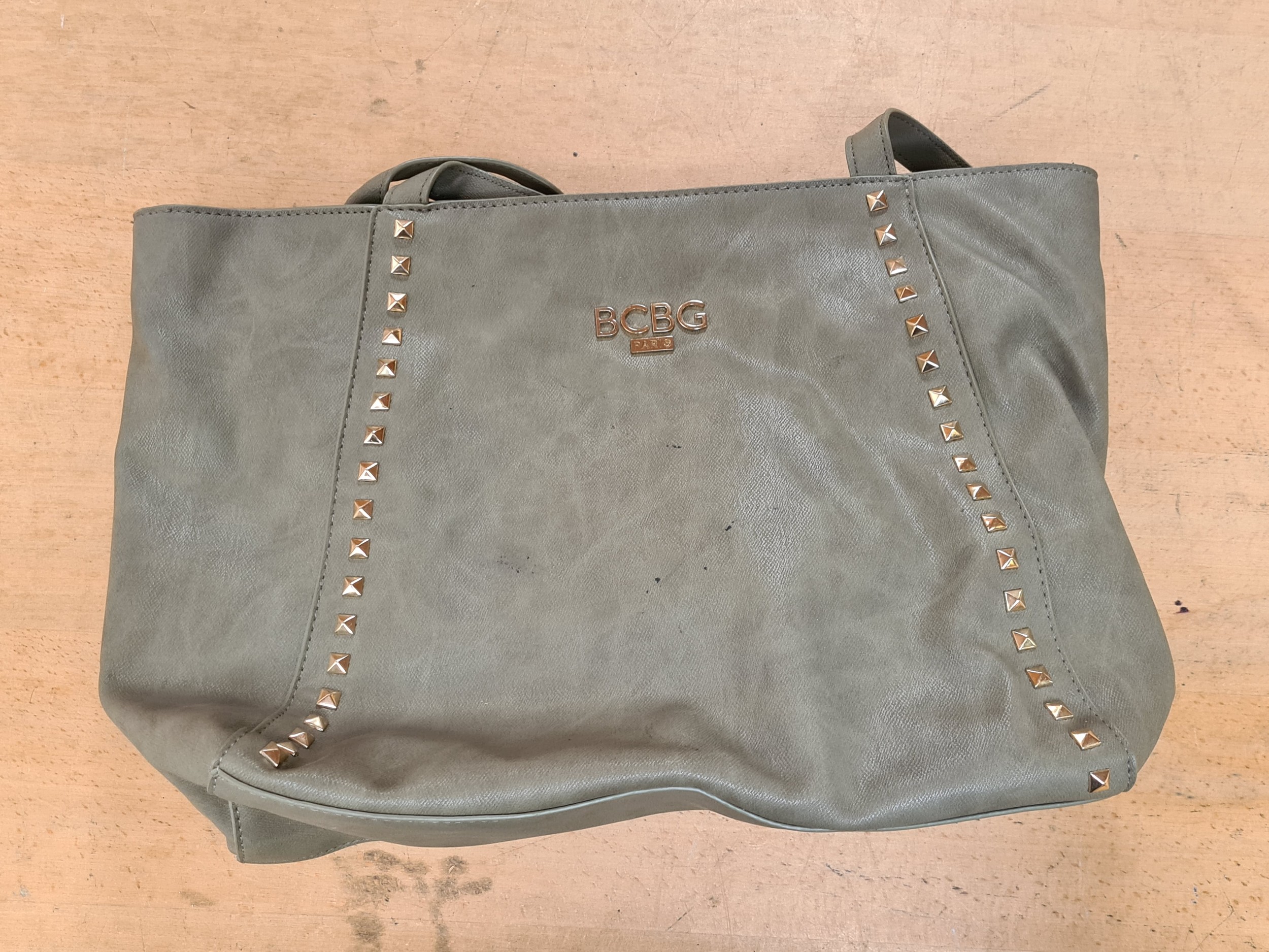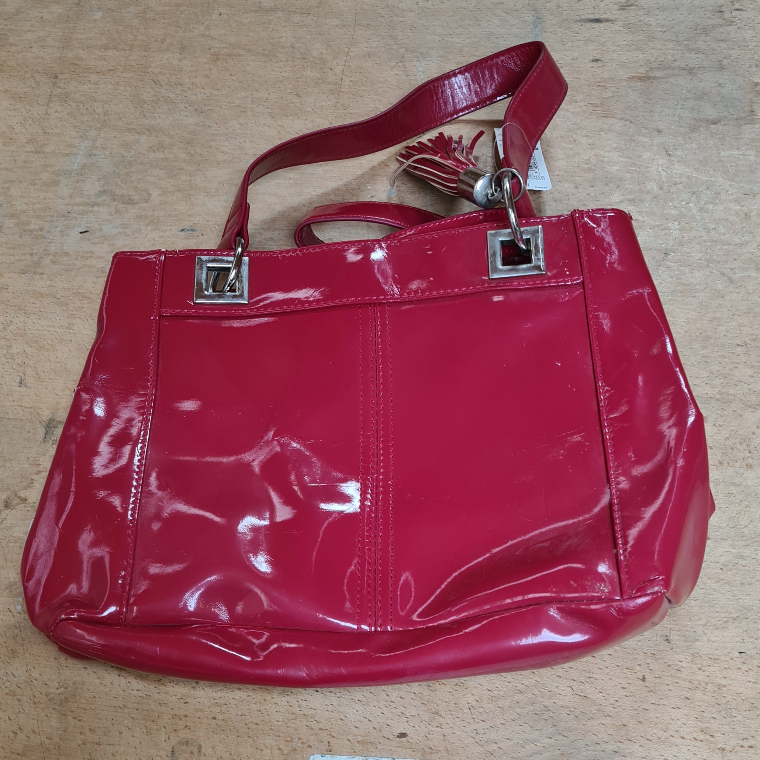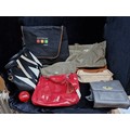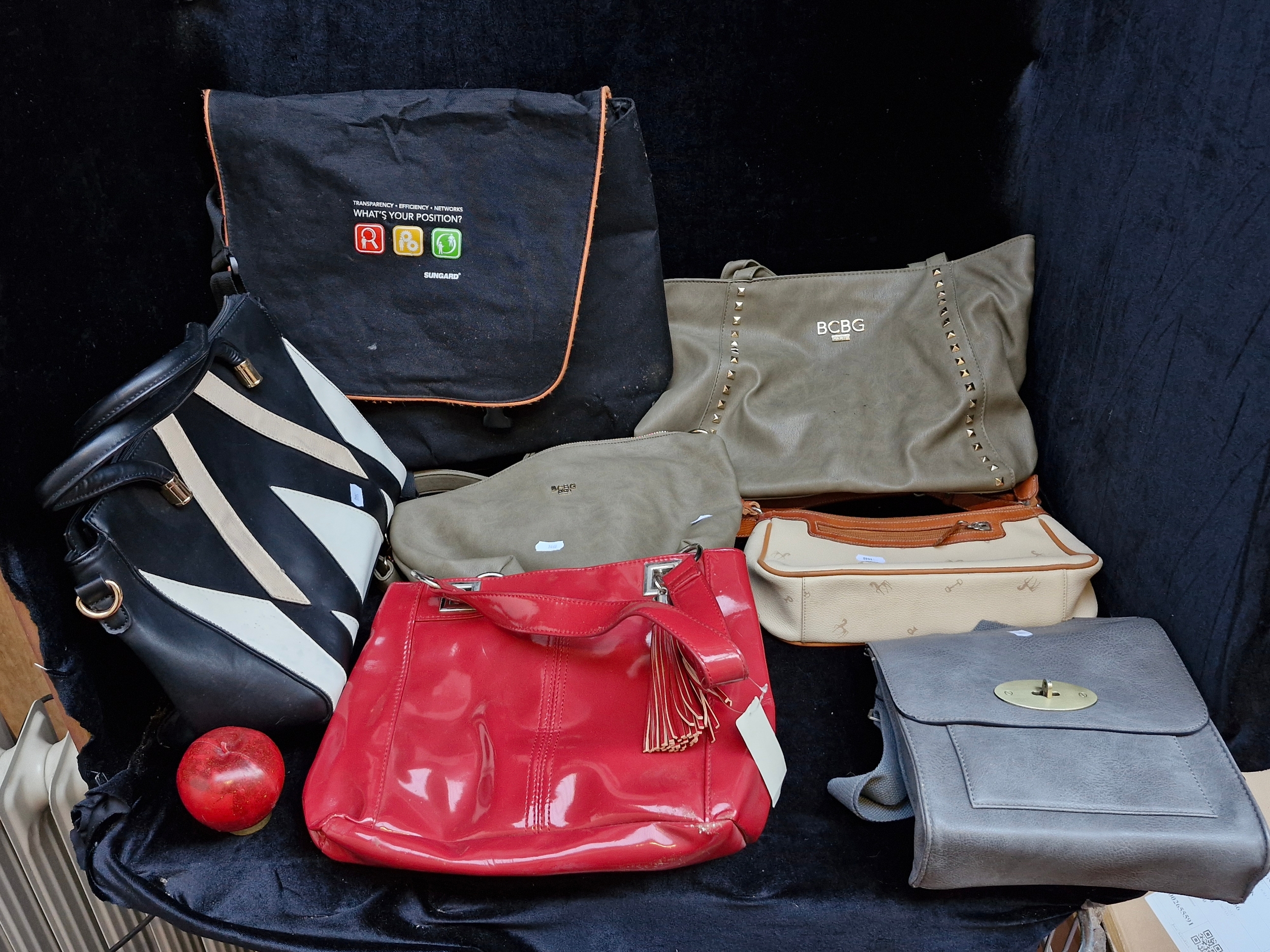 Seven hand bags including a with tags studded BCBG Paris example RRP 109€, a 100% leather shoulder bag and a with tags M & S red vinyl example RRP 34€
