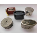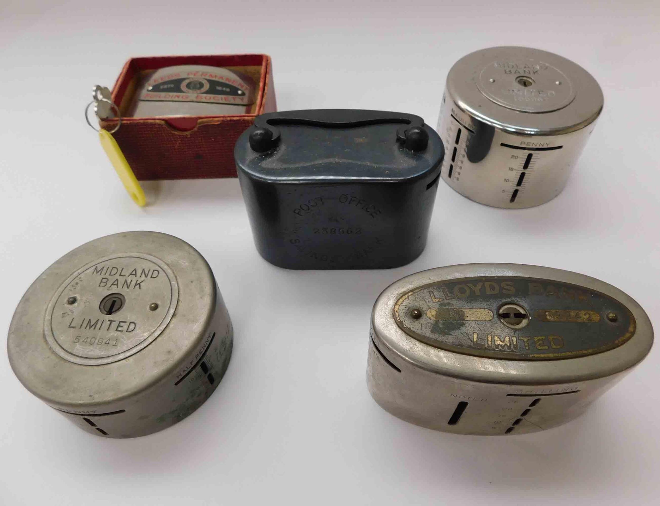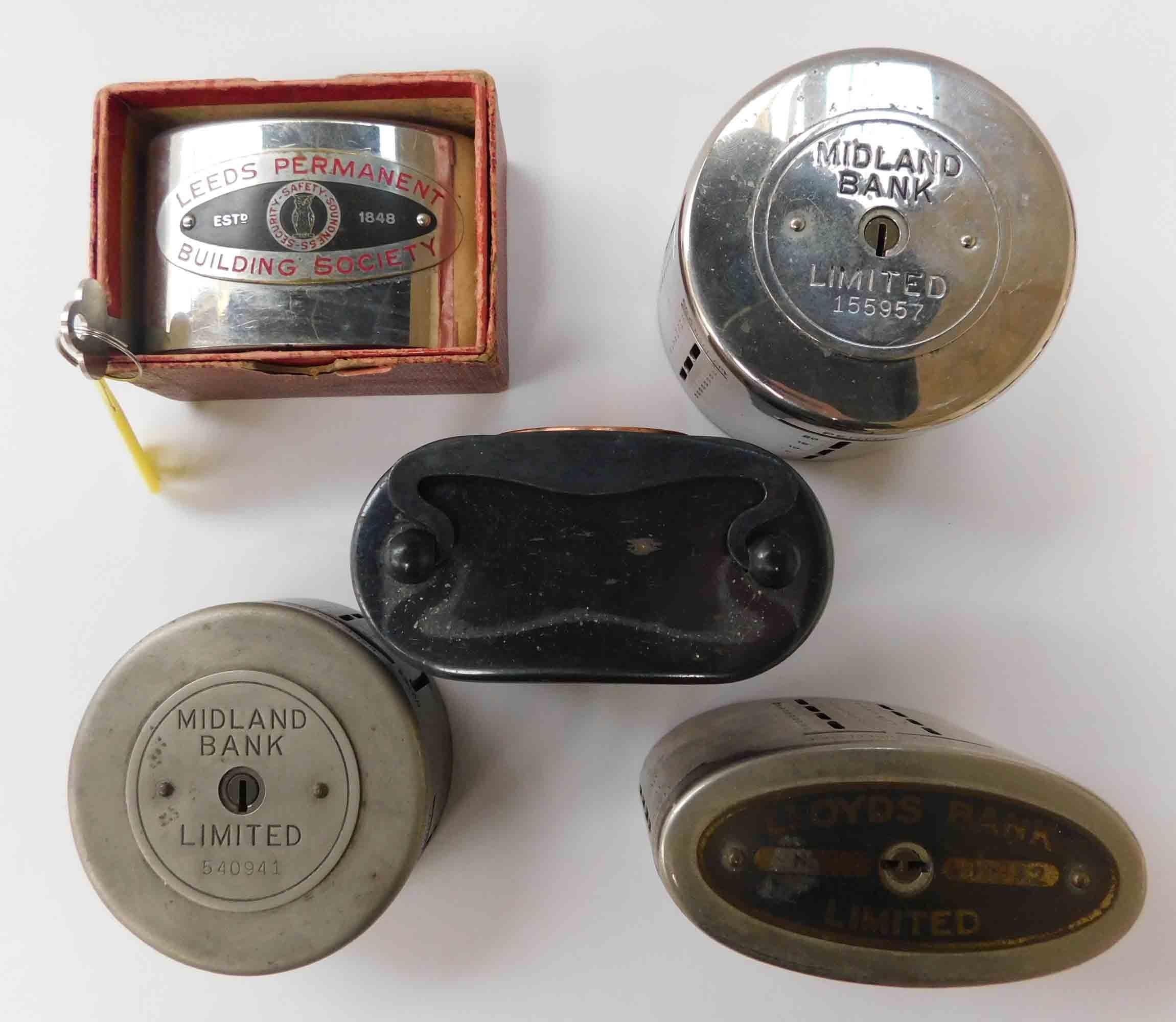 Five - Vintage bank money boxes - including Midlands, P.O, Lloyds & Leeds, plus 3 keys