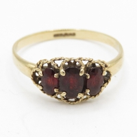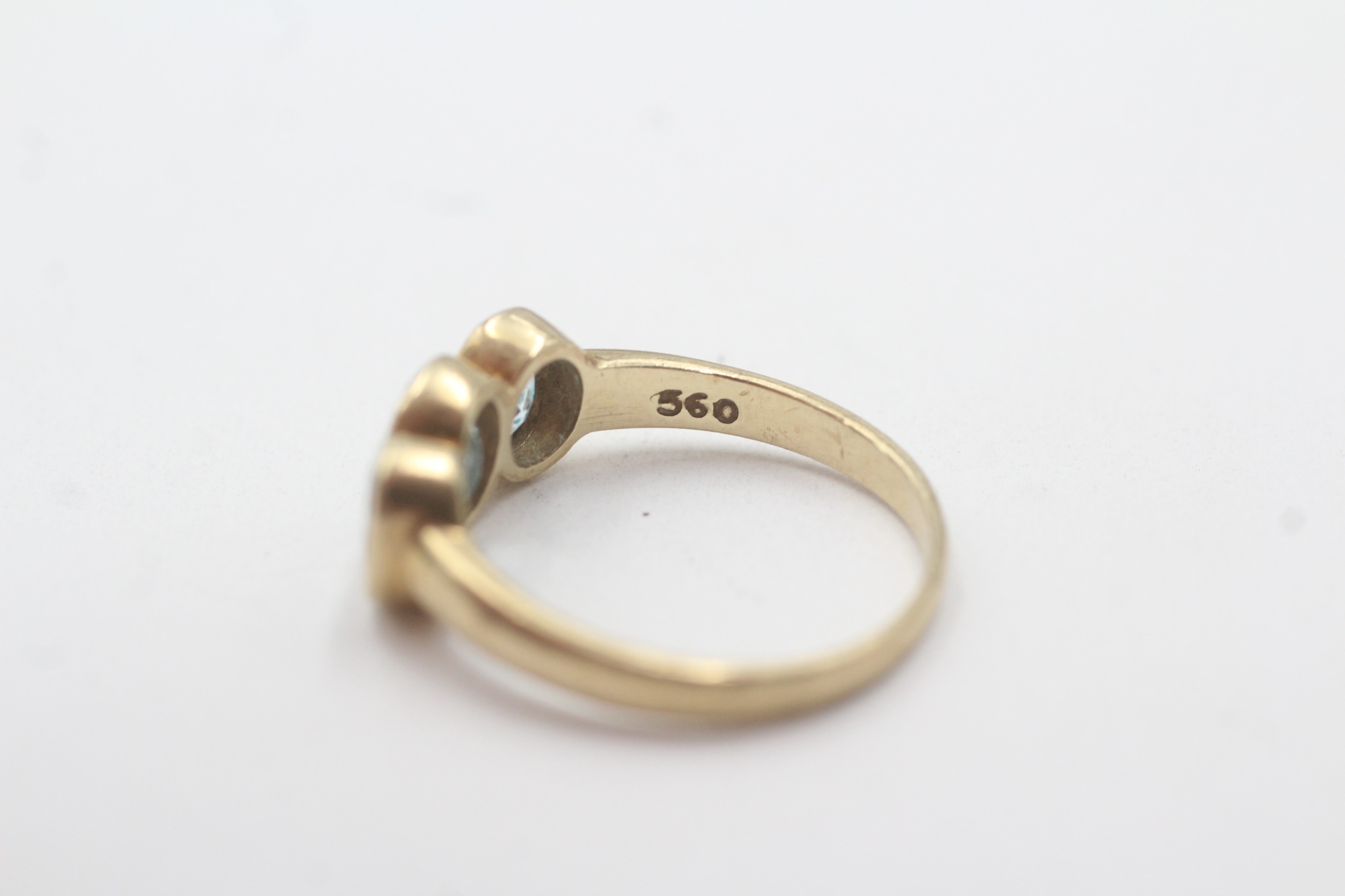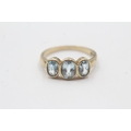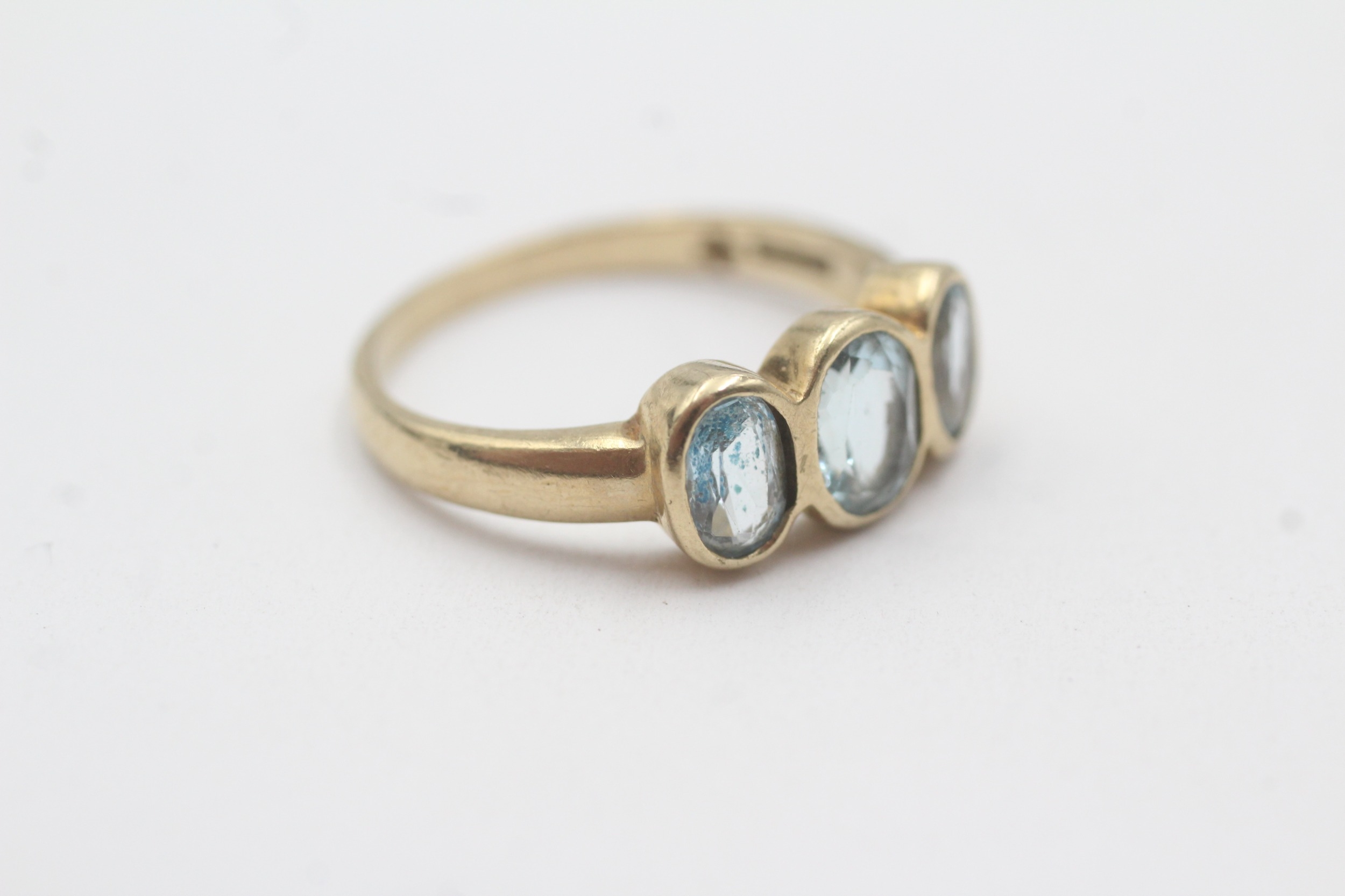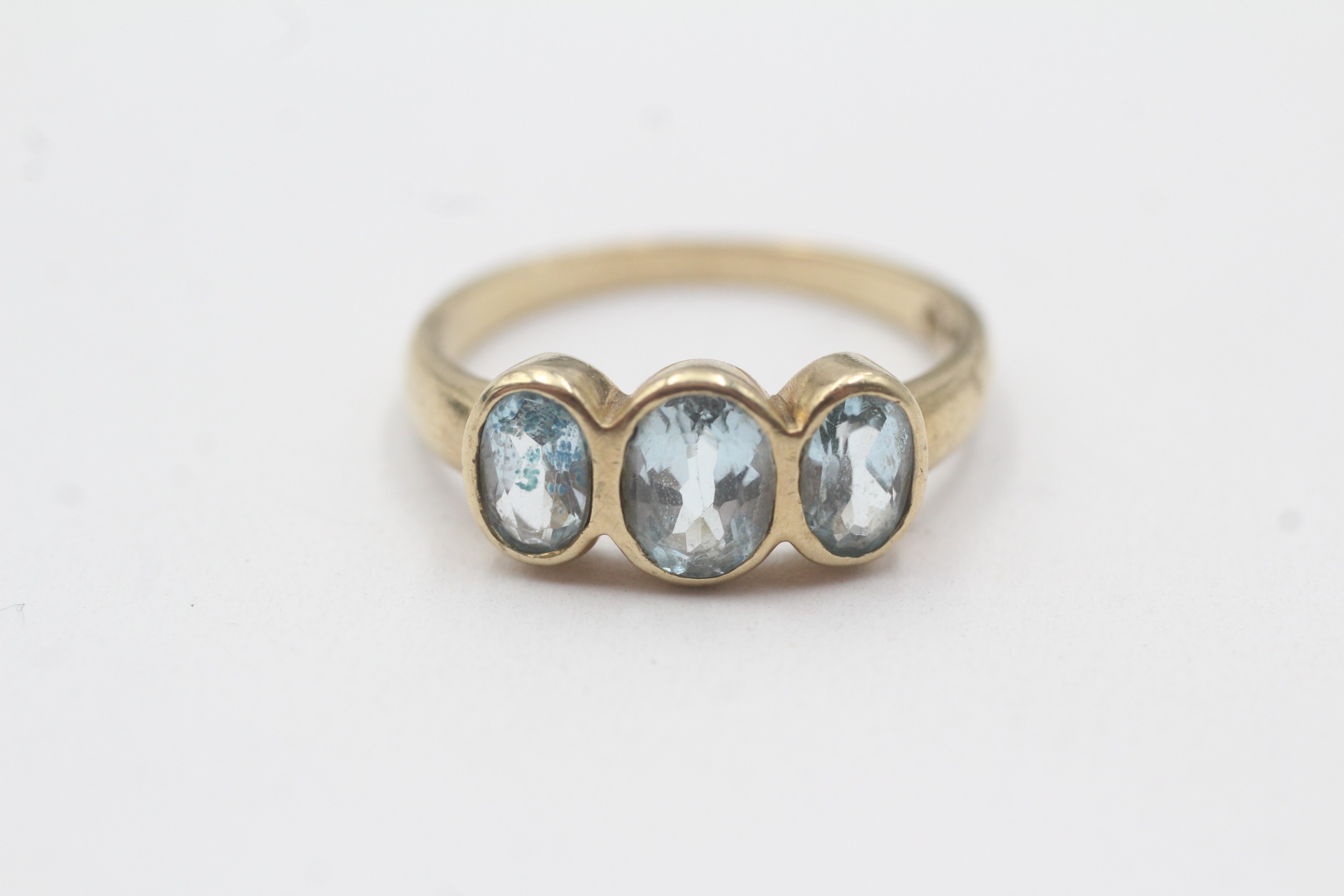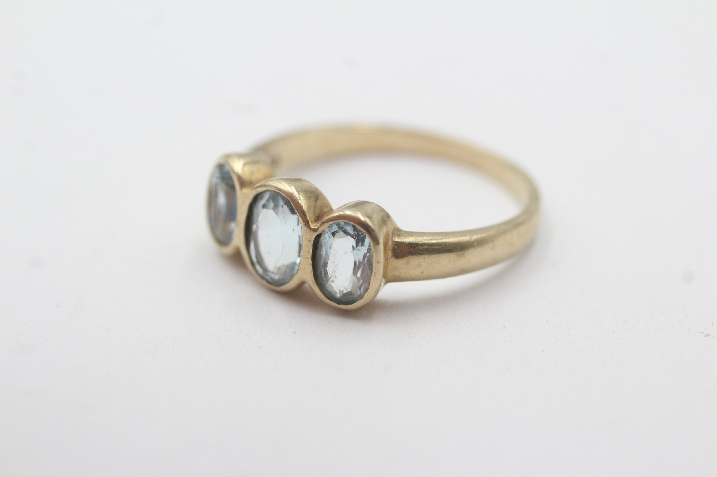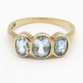 9ct gold bezel set blue topaz trilogy ring (2.9g) Size P