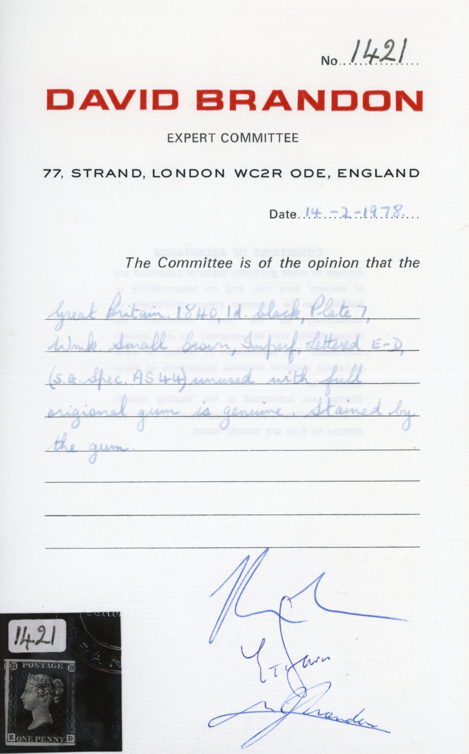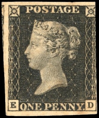 1840 1d black, Pl. 7 (ED), with three fine margins, mint, unmounted o.g. with some slight toning, nevertheless a very respectable example and scarce in this condition. Brandon cert (1978), SG 2, £8,000