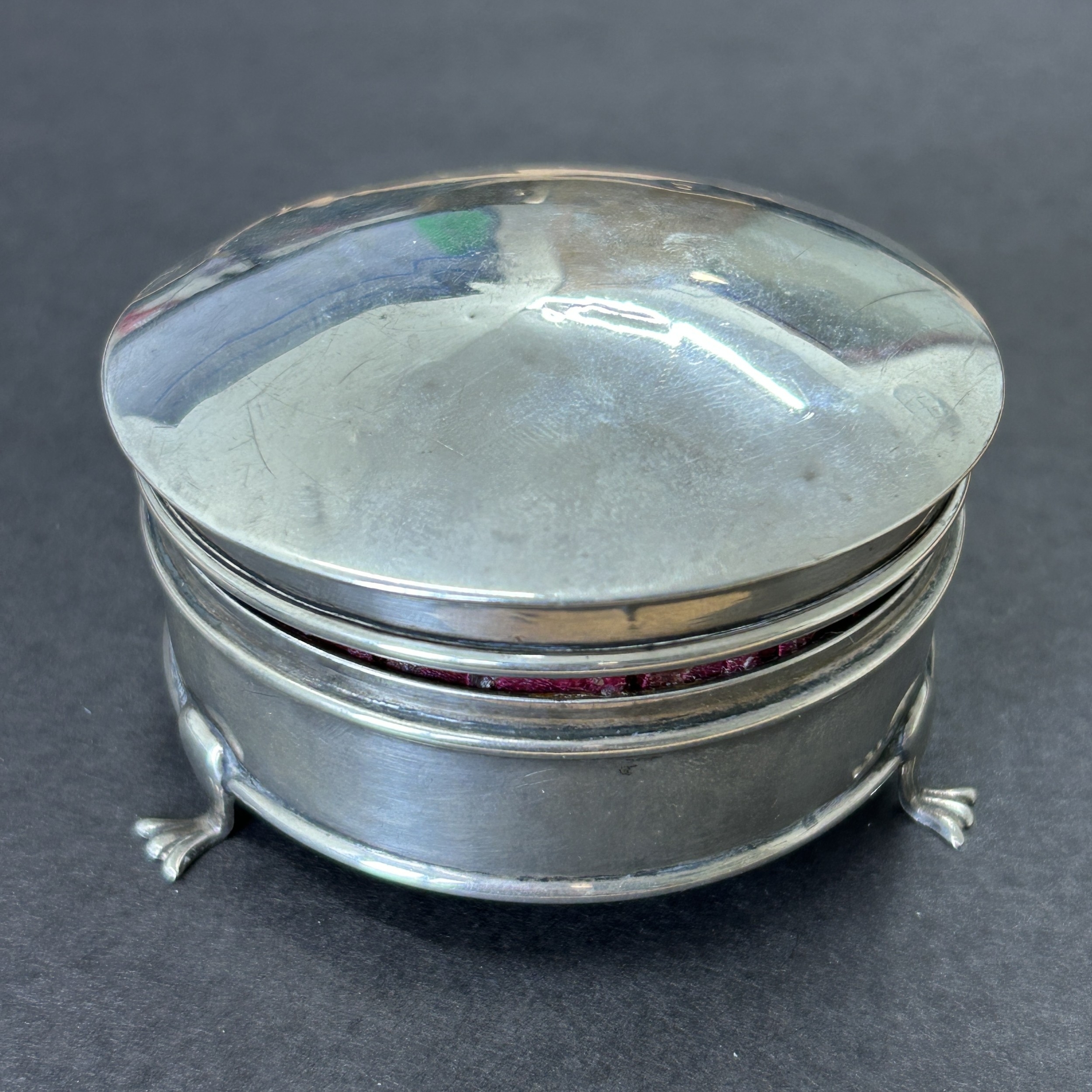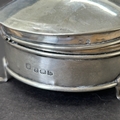 A hallmarked silver and velvet lined trinket pot on three cl...