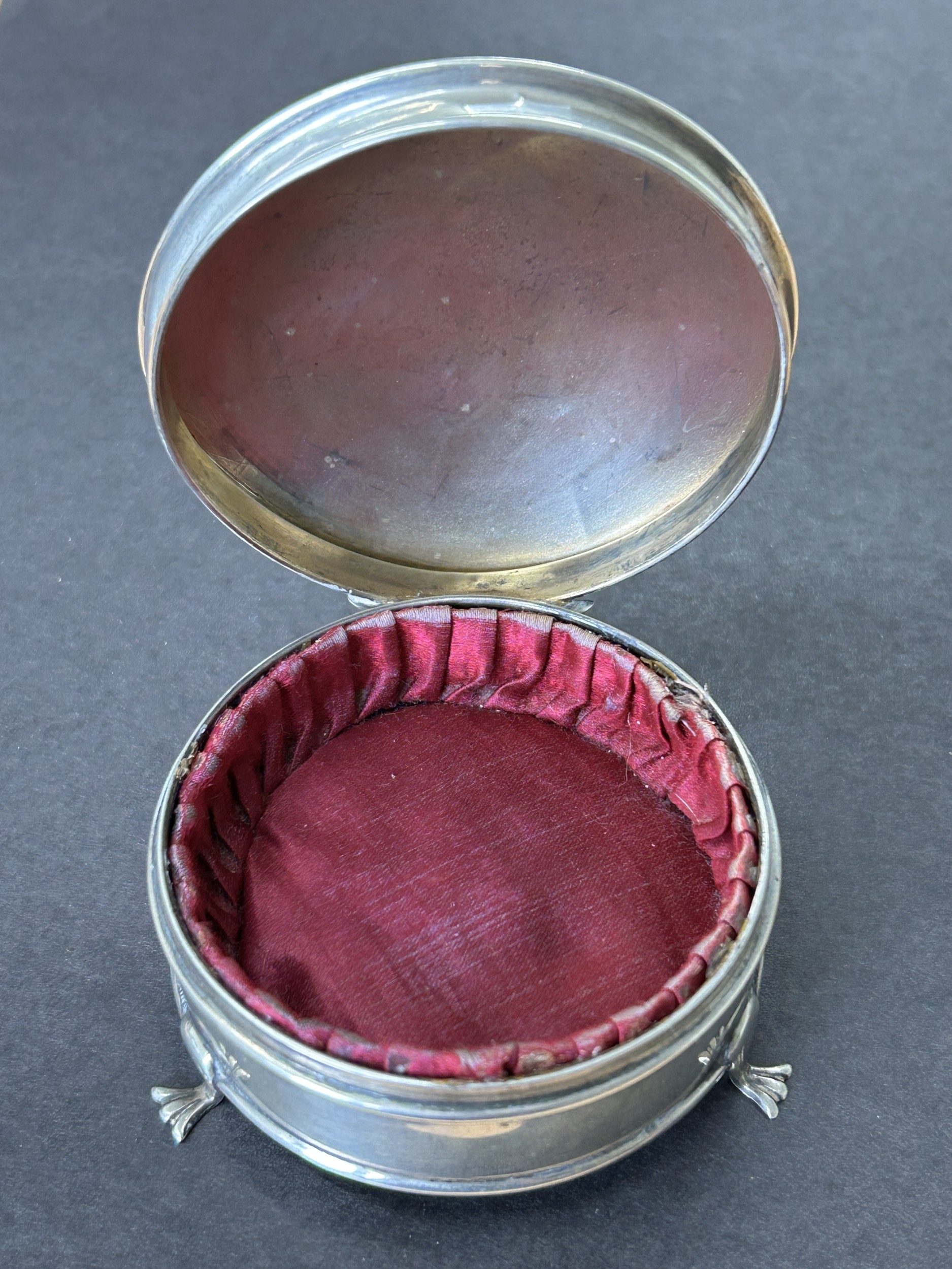 A hallmarked silver and velvet lined trinket pot on three claw feet, weight approx. 35g