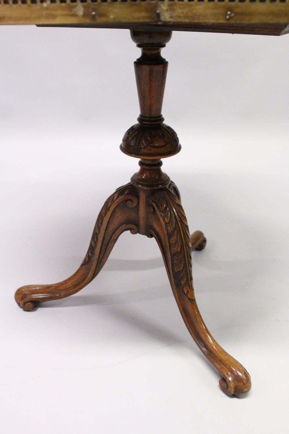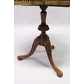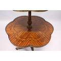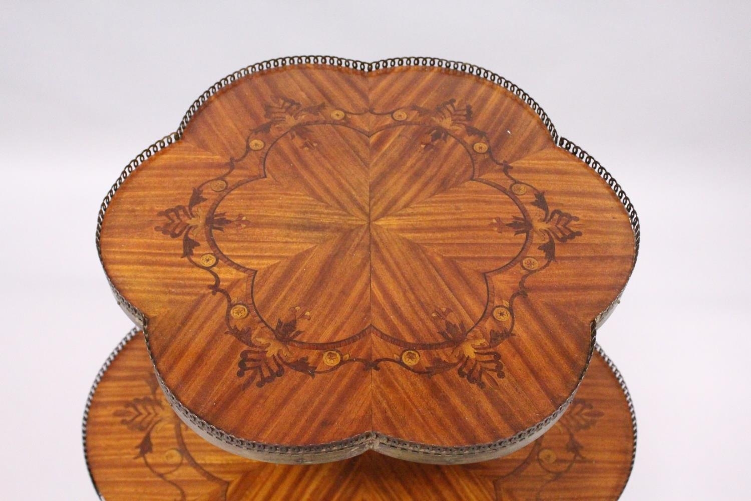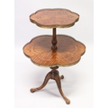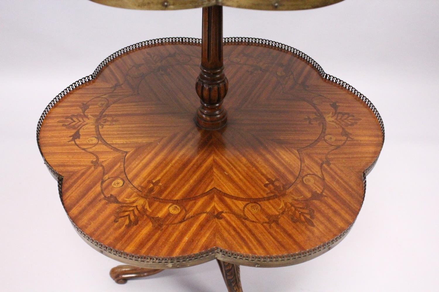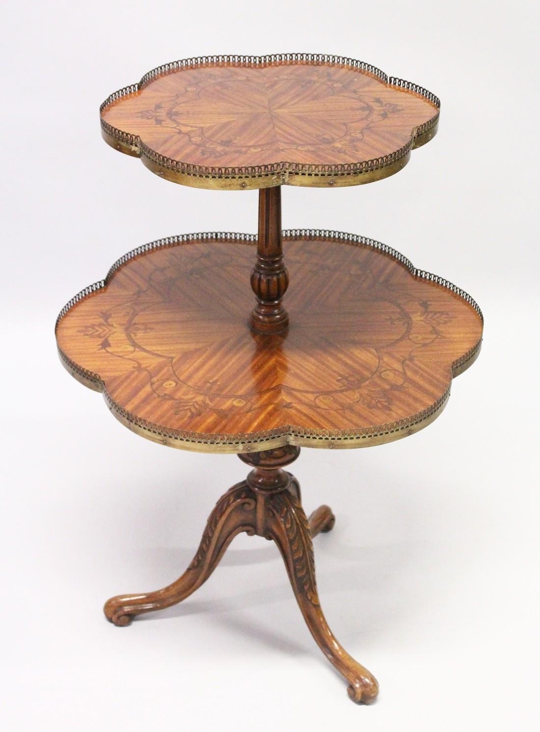 A GOOD SATINWOOD INLAID TWO TIER STAND with brass galley centre pillar on tripod legs.