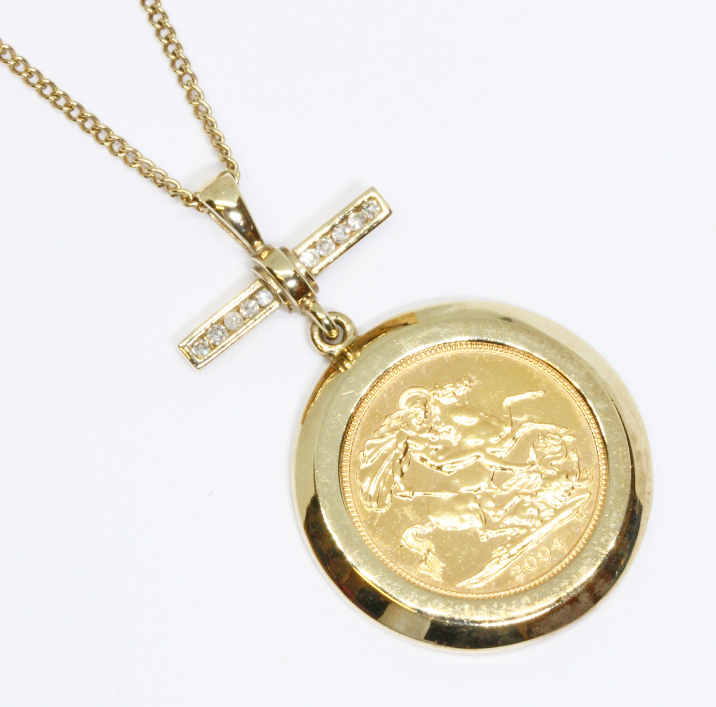 A hallmarked 9ct gold mounted Elizabeth II 2004 half sovereign diamond pendant, length 40mm, suspended on 44cm chain with bolt ring clasp marked '375', gross weight 11.6g.