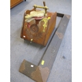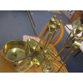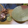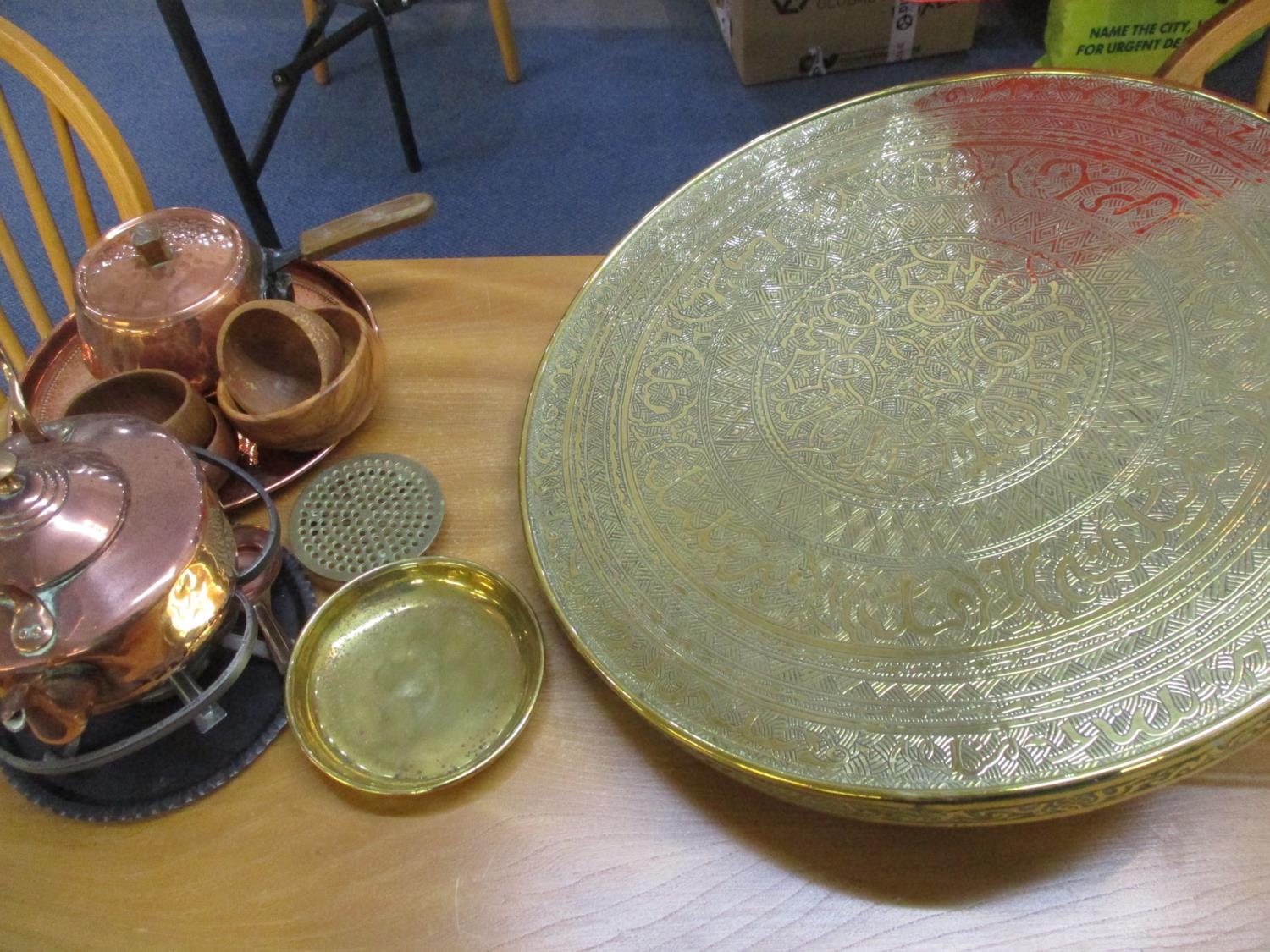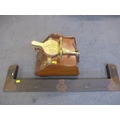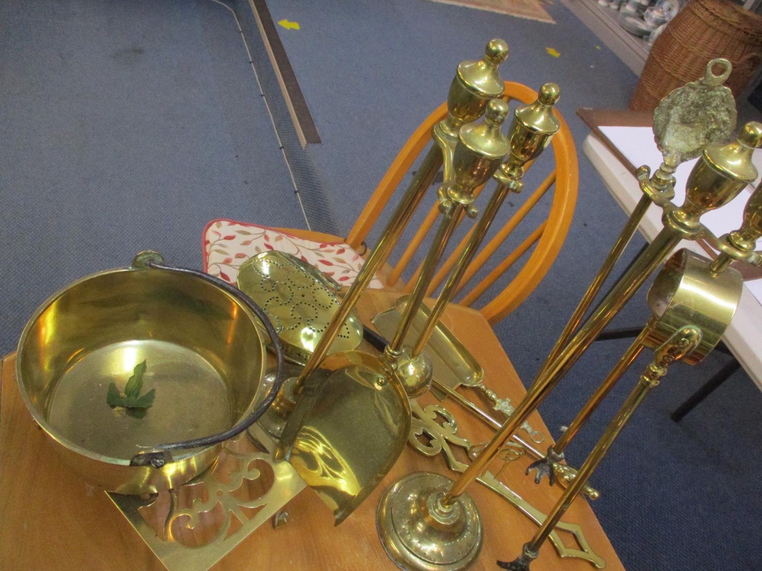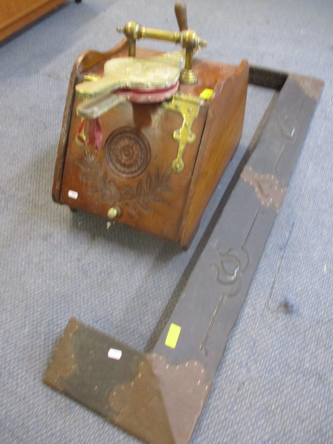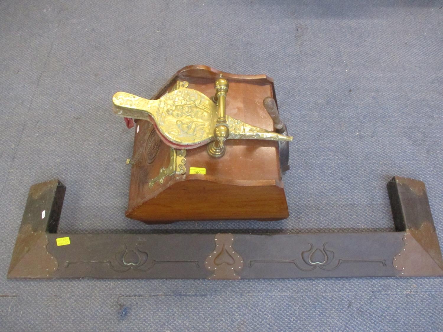 An Art Nouveau copper fire surround, a Victorian walnut coal bucket, bellows and coal shovel together with mixed brassware