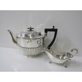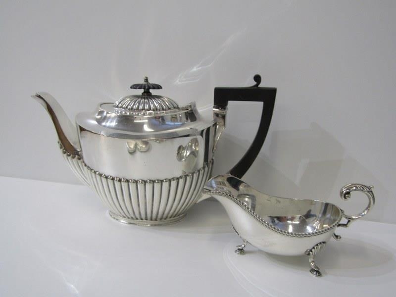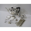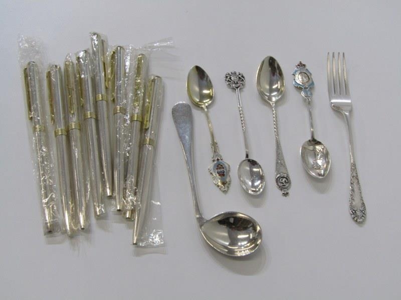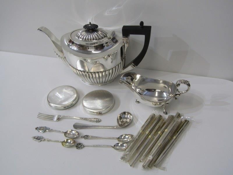 SILVERPLATE, Georgian design plated sauce boat, Victorian teapot, cutlery and new pens etc