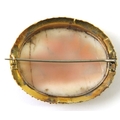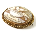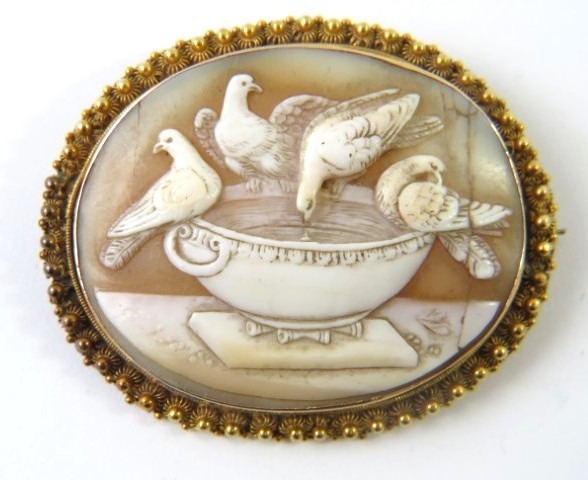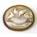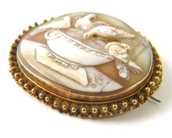 A Grand Tour well carved cameo brooch with an oval panel depicting the Doves of Pliny in a yellow metal brooch mount with Etruscan granulated border, 51mm x 42mm overall, 13.5g gross approx.