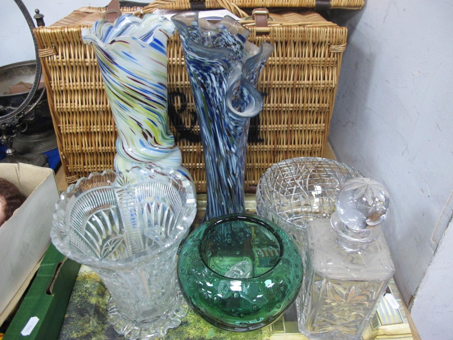 Whitefriars Style Green Glass Bowl, with encased bubble inclusions, 12.5cm high, mottled vases, rose bowl, etc:- One Tray