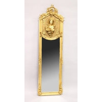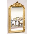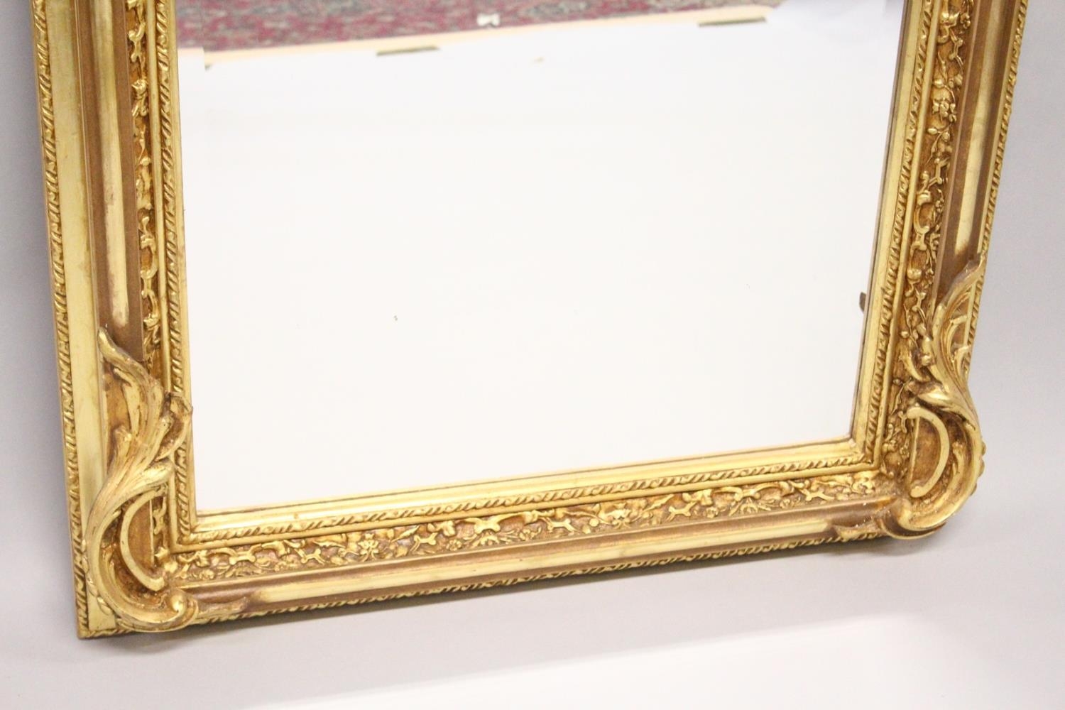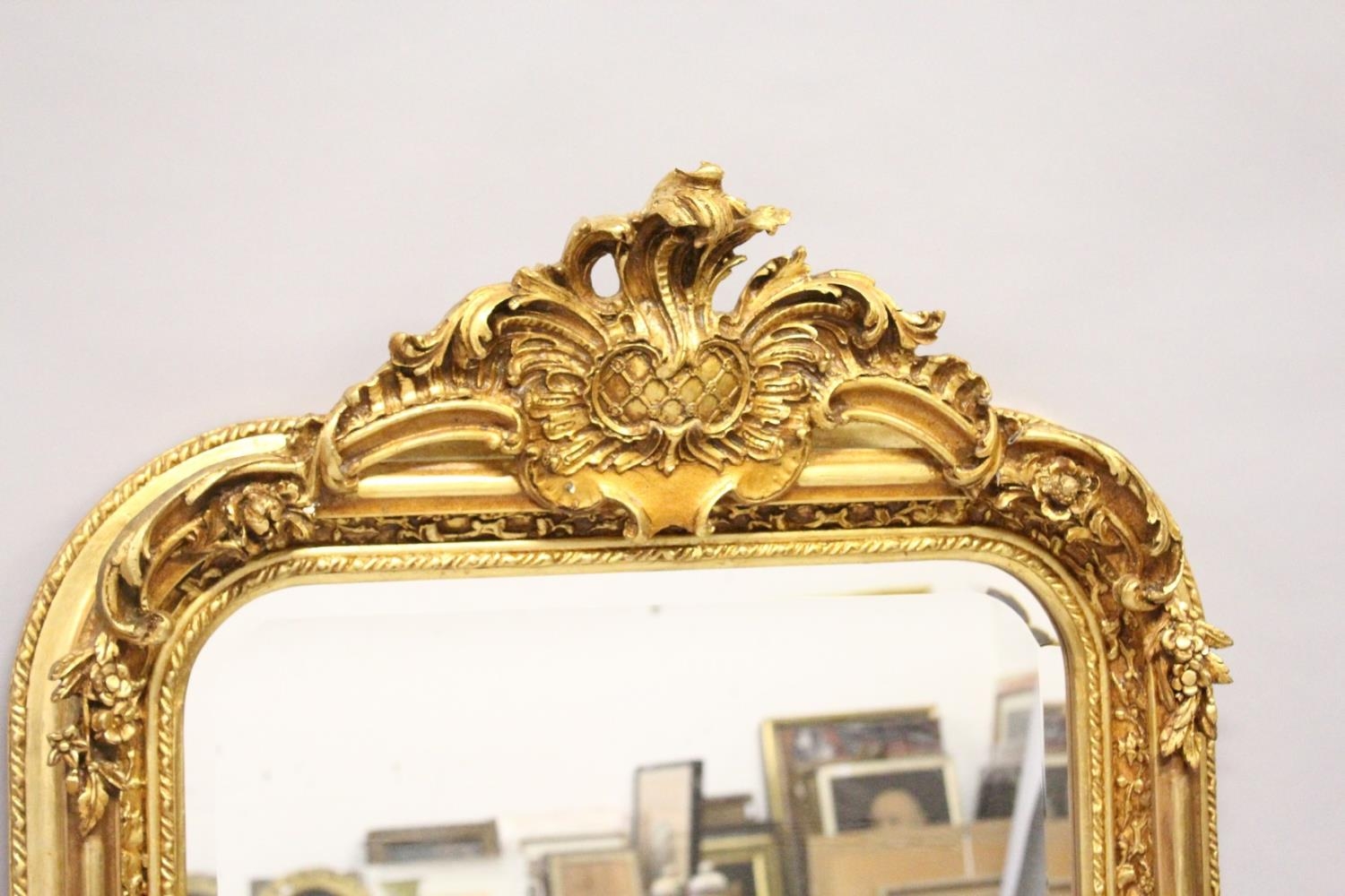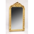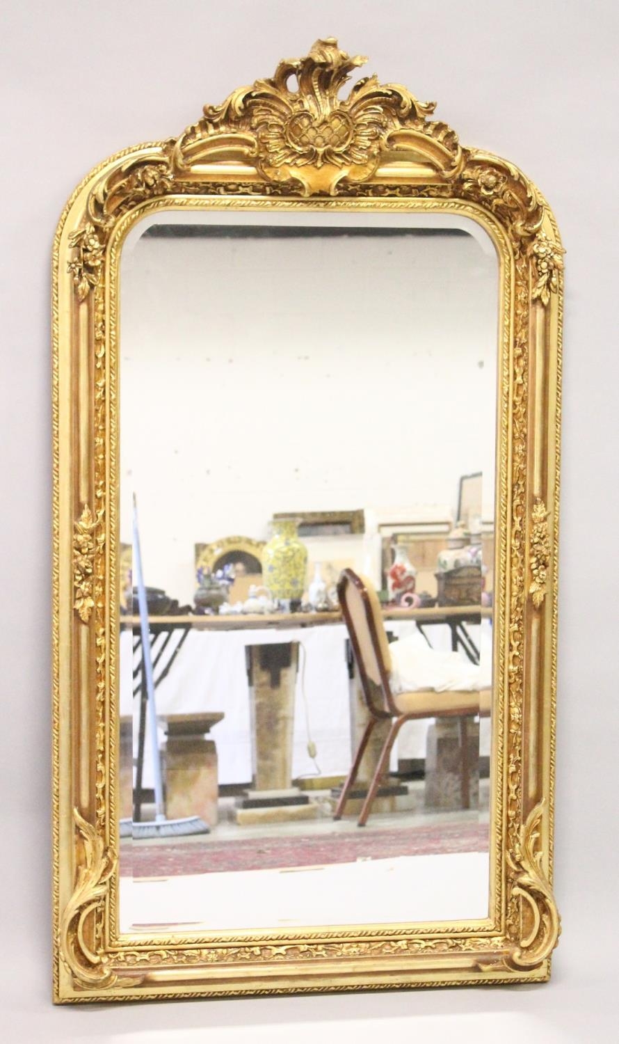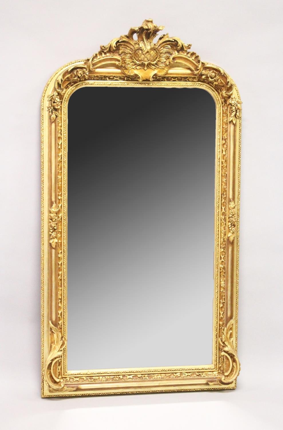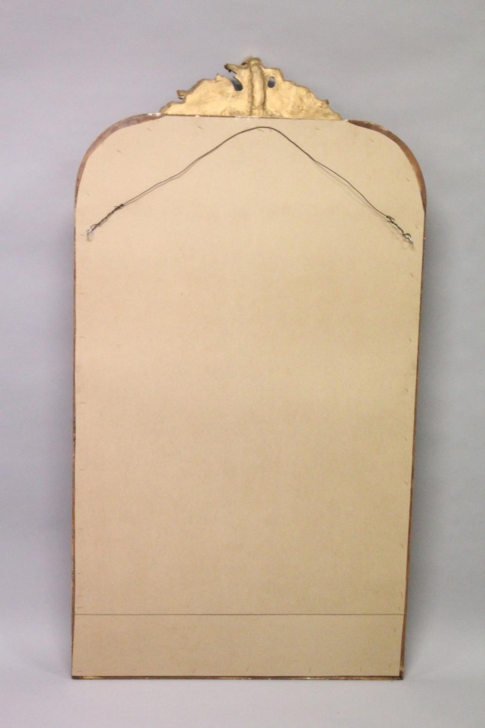A LARGE ORNATE GILT FRAMED ARCH TOP MIRROR, the top with moulded leafwork decoration.