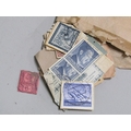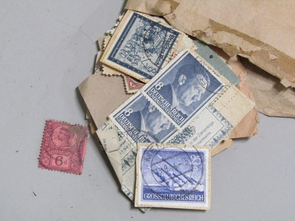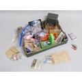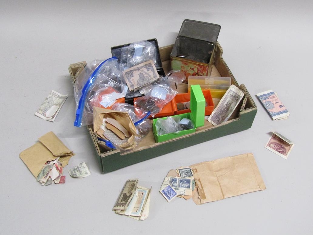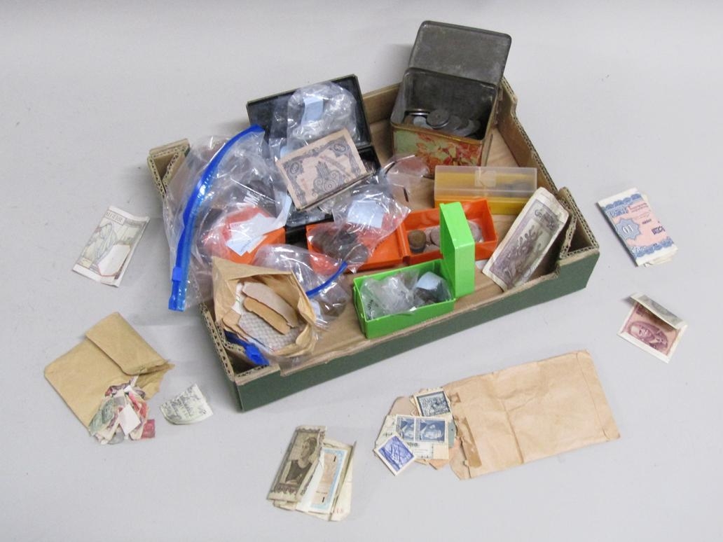 TRAY OF MIXED COINS, STAMPS AND SOME BANKNOTES