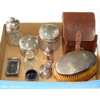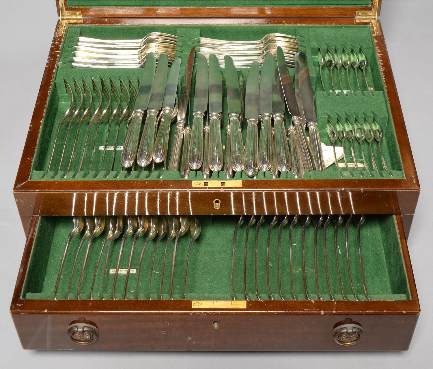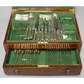 A COMPOSED VICTORIAN SILVER TABLE SERVICE, OLD ENGLISH THREAD PATTERN, LONDON AND EXETER, MAINLY BY CHAWNER & CO., 1845-71, A SET OF FOUR SCOTTISH SILVER TABLE SPOONS WITH LATER EMBOSSED SHELL BOWL, EDINBURGH 1791, TWO SAUCE LADLES, A TODDY LADLE, TWO SETS OF ELIZABETH II SILVER HAFTED TABLE AND CHEESE KNIVES AND SEVERAL PLATED ARTICLES, IN A MAHOGANY CANTEEN, 126OZS 8DWTS WEIGHABLE (91)