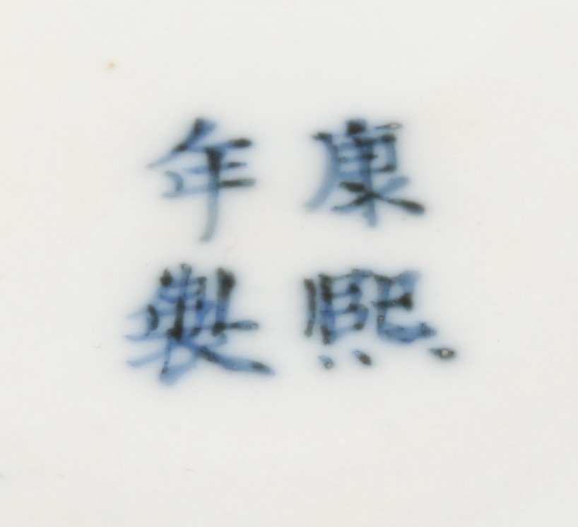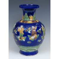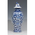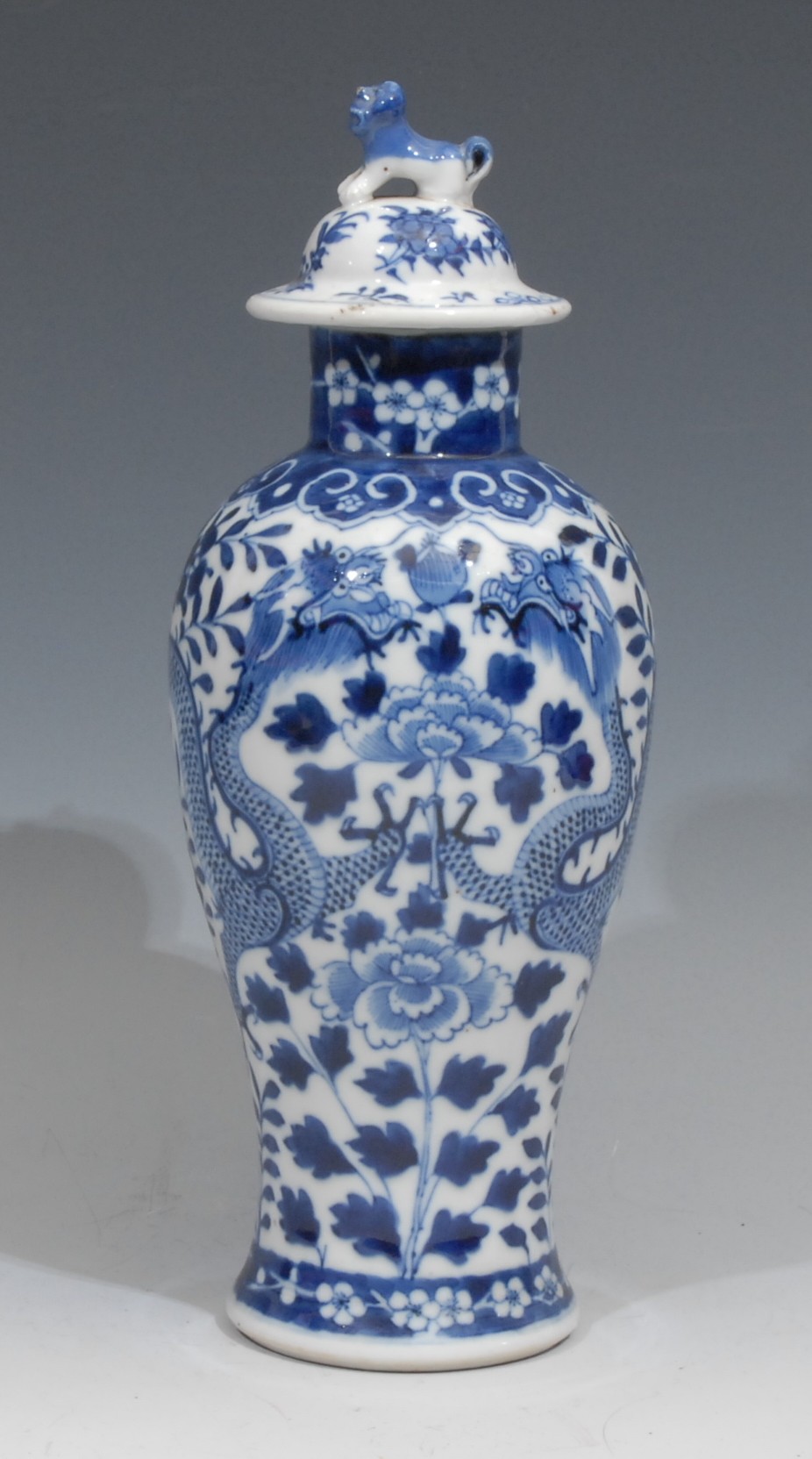 A Chinese ovoid vase and cover, painted in tones of underglaze blue with dragons amongst flowers and foliage, temple lion finial, 29.5cm high, four character mark, 19th century
