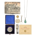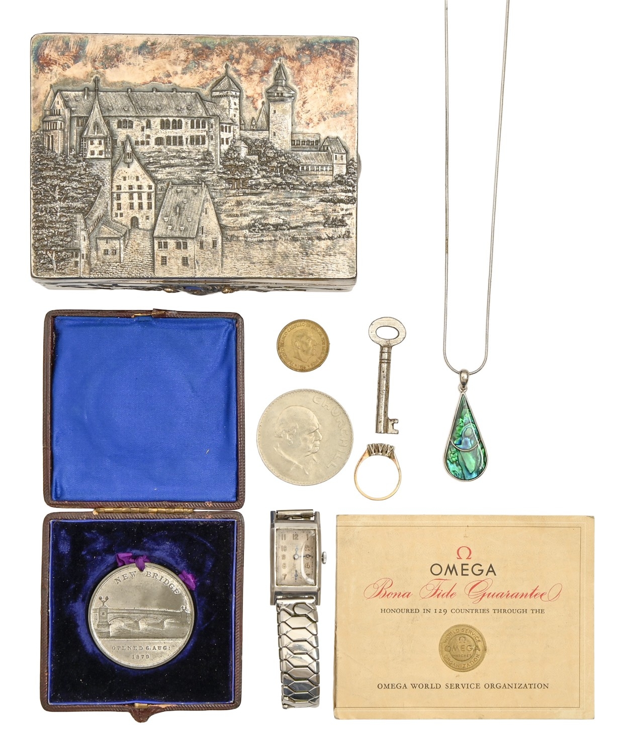 Commemorative medal. New Bridge, Maidstone 1879 [Eimer 1644], white metal, 41mm, cased, a cubic zirconia ring, in 9ct gold, 1.7g, size L, a rectangular stainless steel gentleman's wristwatch, Hamilton Calcutta and a Continental plated trinket box, etc