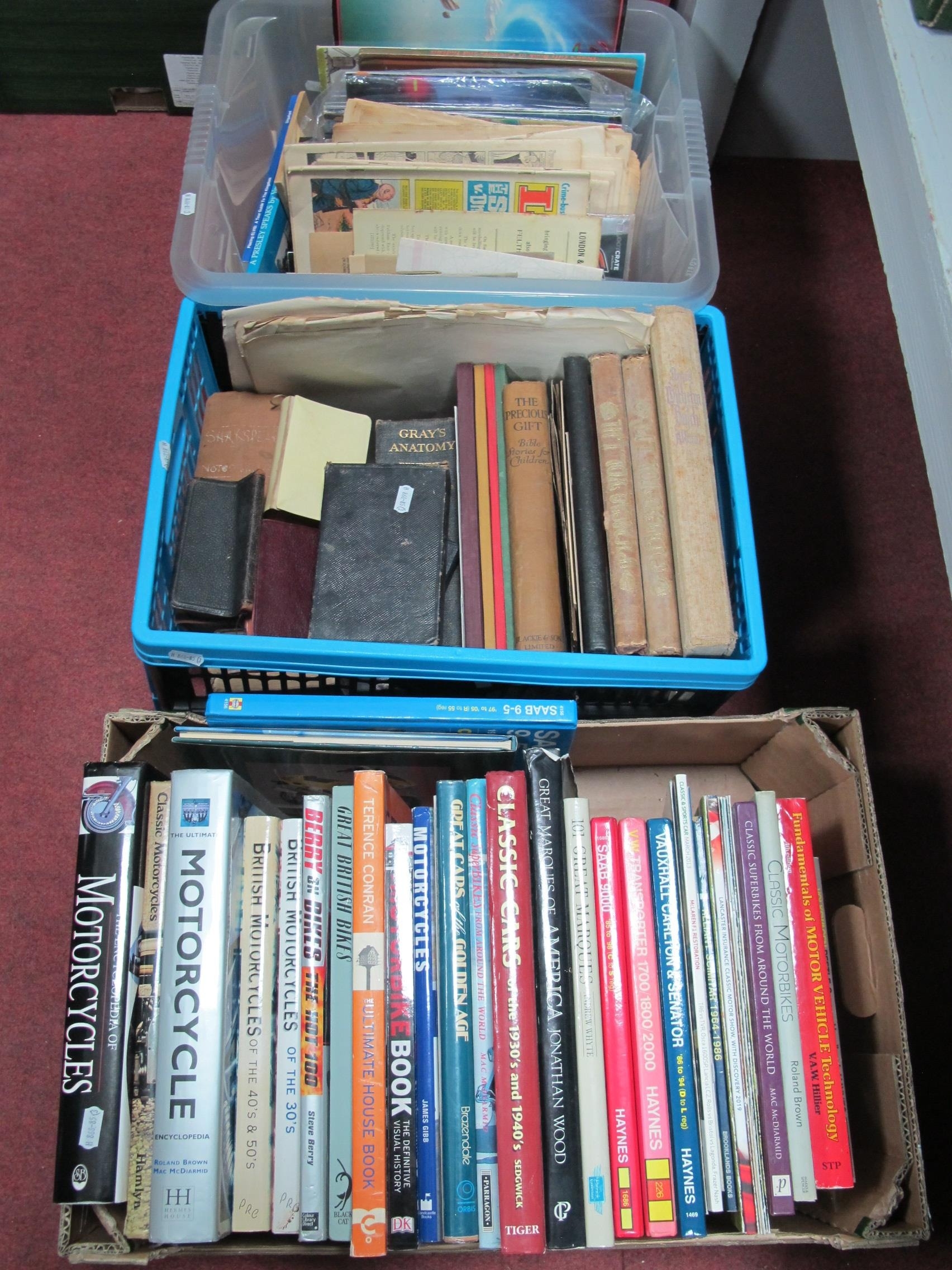 Books, in large quantity, including vintage and antique examples: motorcycle collection, film and comic magazines, bibles and antique books etc. Three boxes.