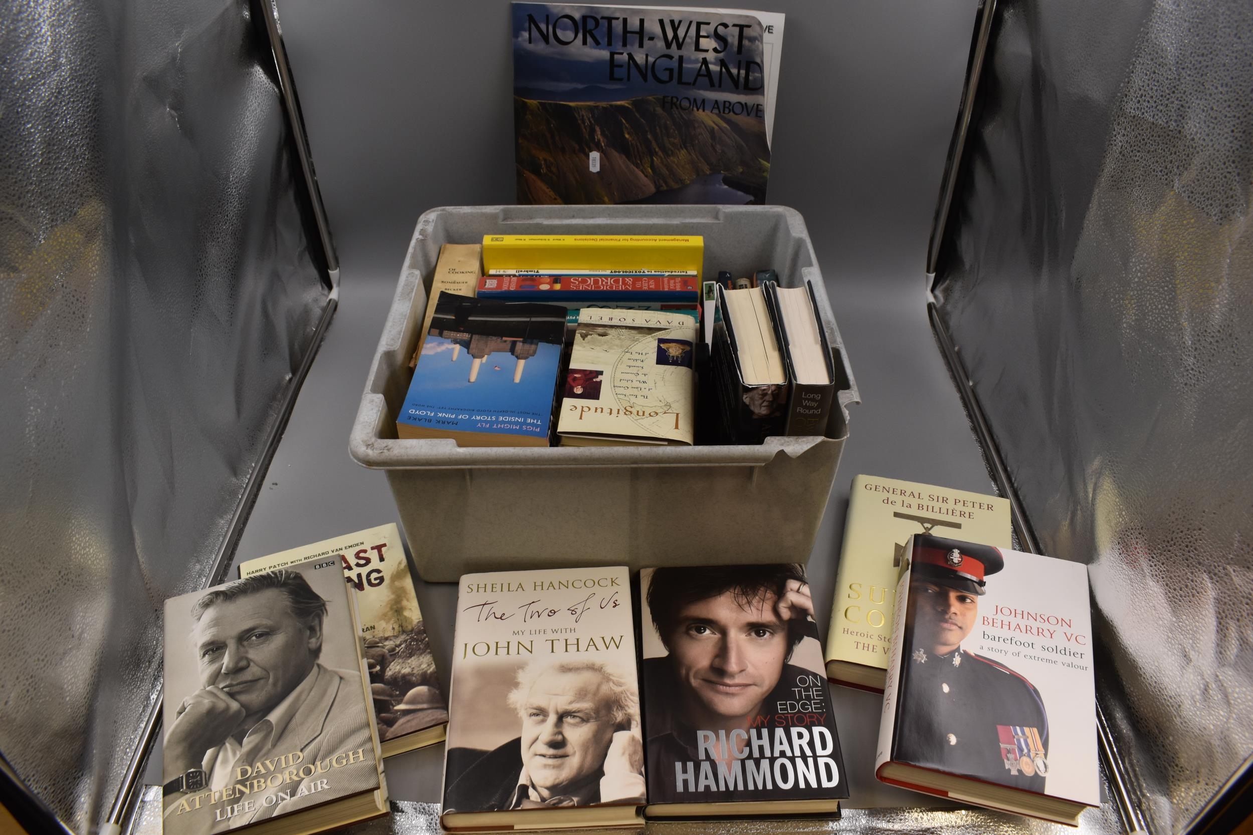 Selection of hard and soft back books to include novels , medical and aerial photos of the north west.