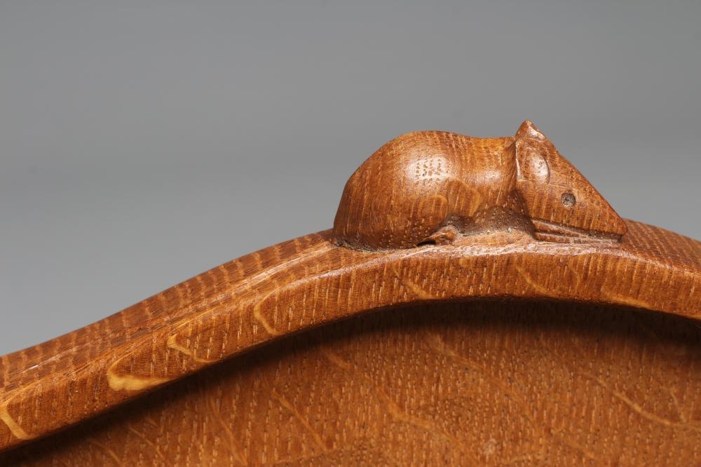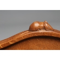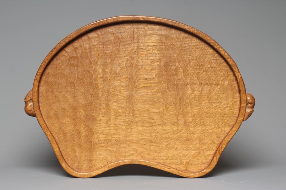 A ROBERT THOMPSON KIDNEY SHAPED OAK TRAY with carved mouse handles, 13 1/2" x 18 1/2" (Est. plus 24% premium inc. VAT)