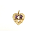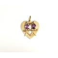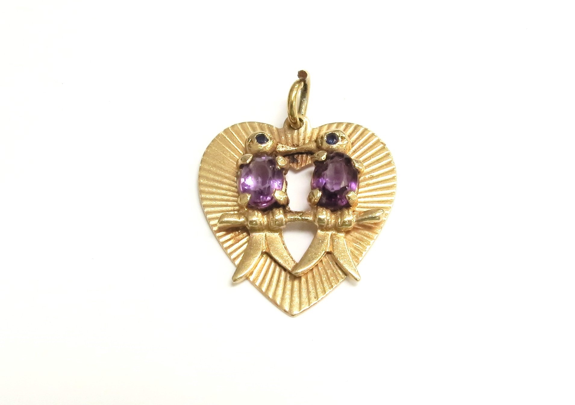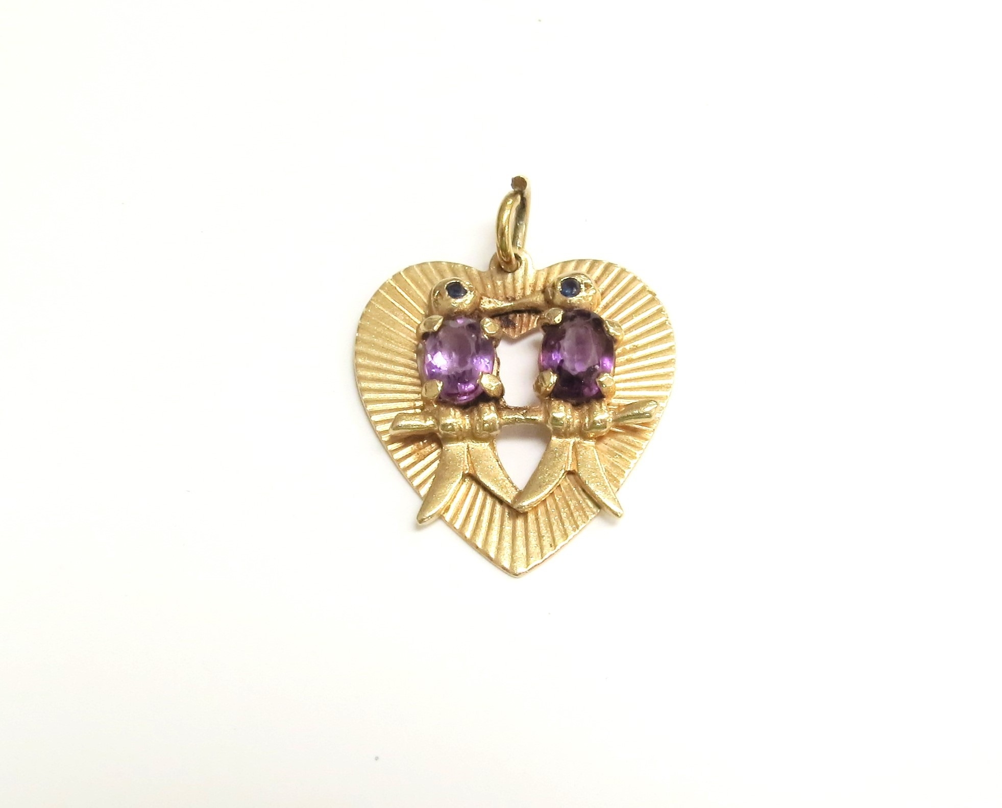 A gold heart shaped pendant with two birds to centre with sapphire set eyes and amethyst bodies, stamped 14k, 4.7g