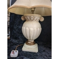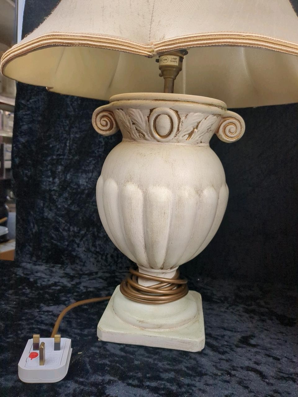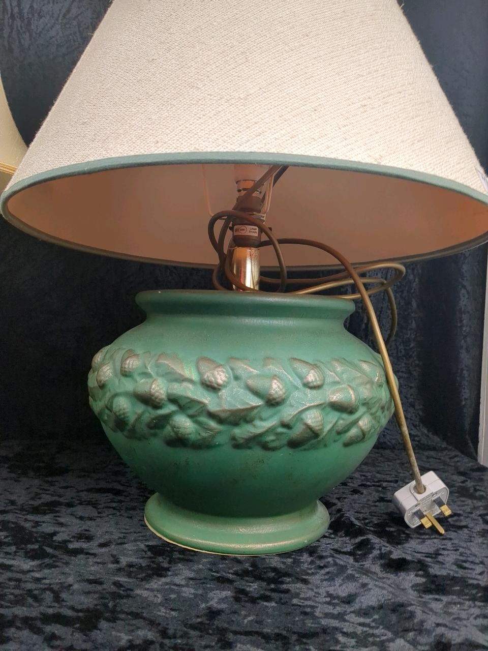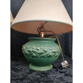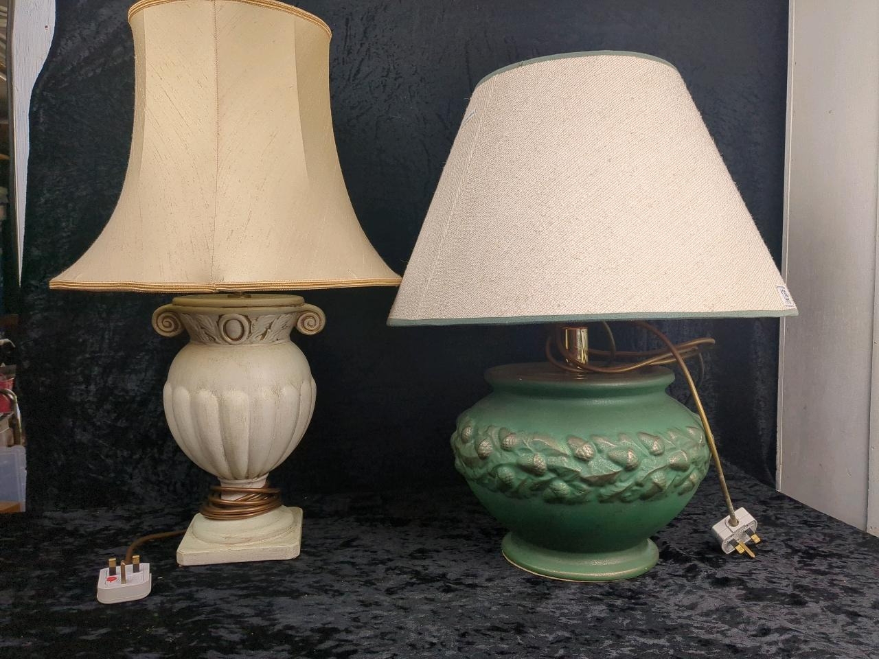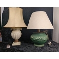 Large green ceramic lamp base with matching shade along with a cream urn style lamp base and shade.