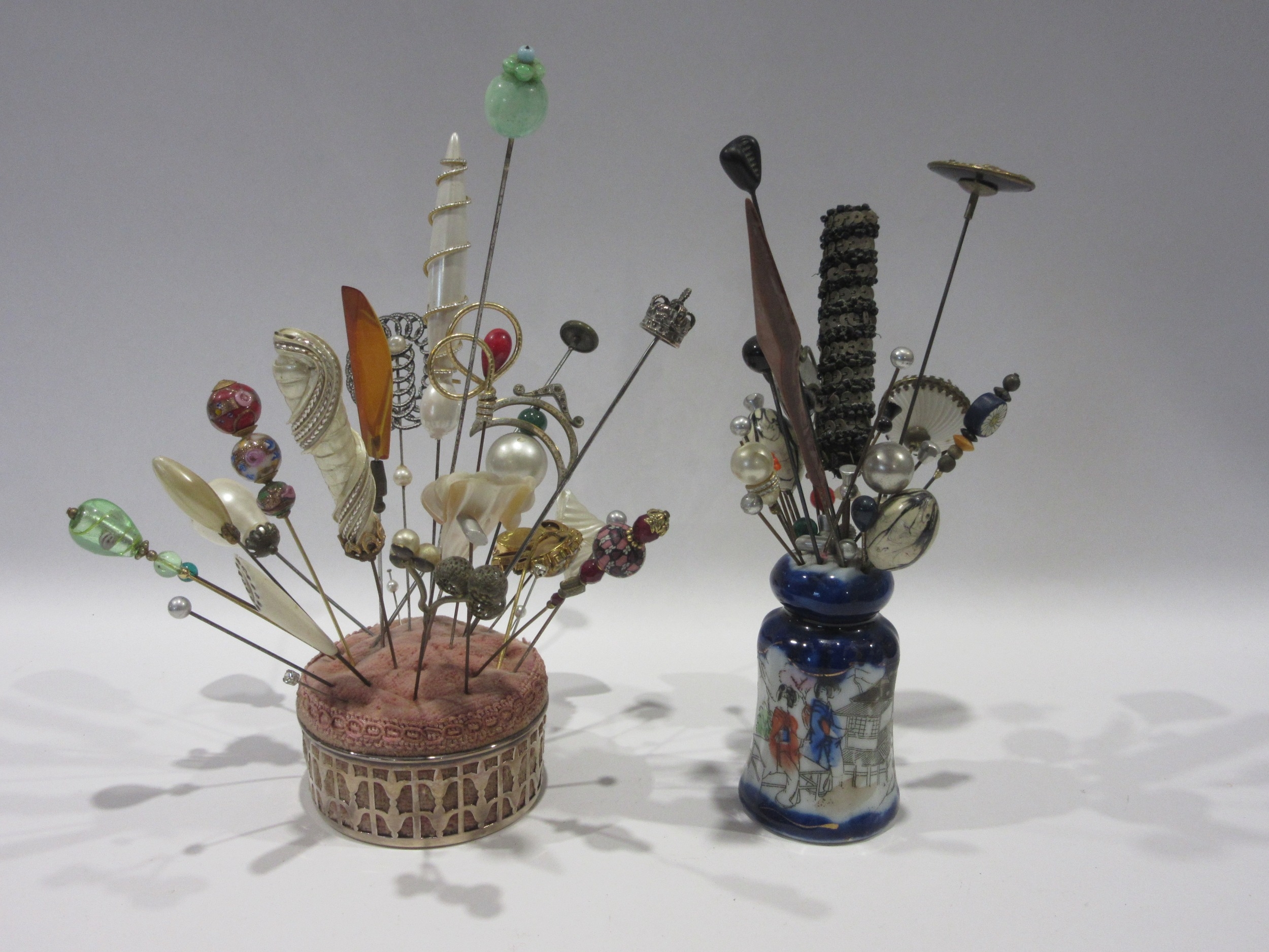 A collection of hat pins on stands