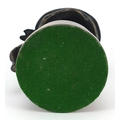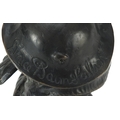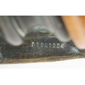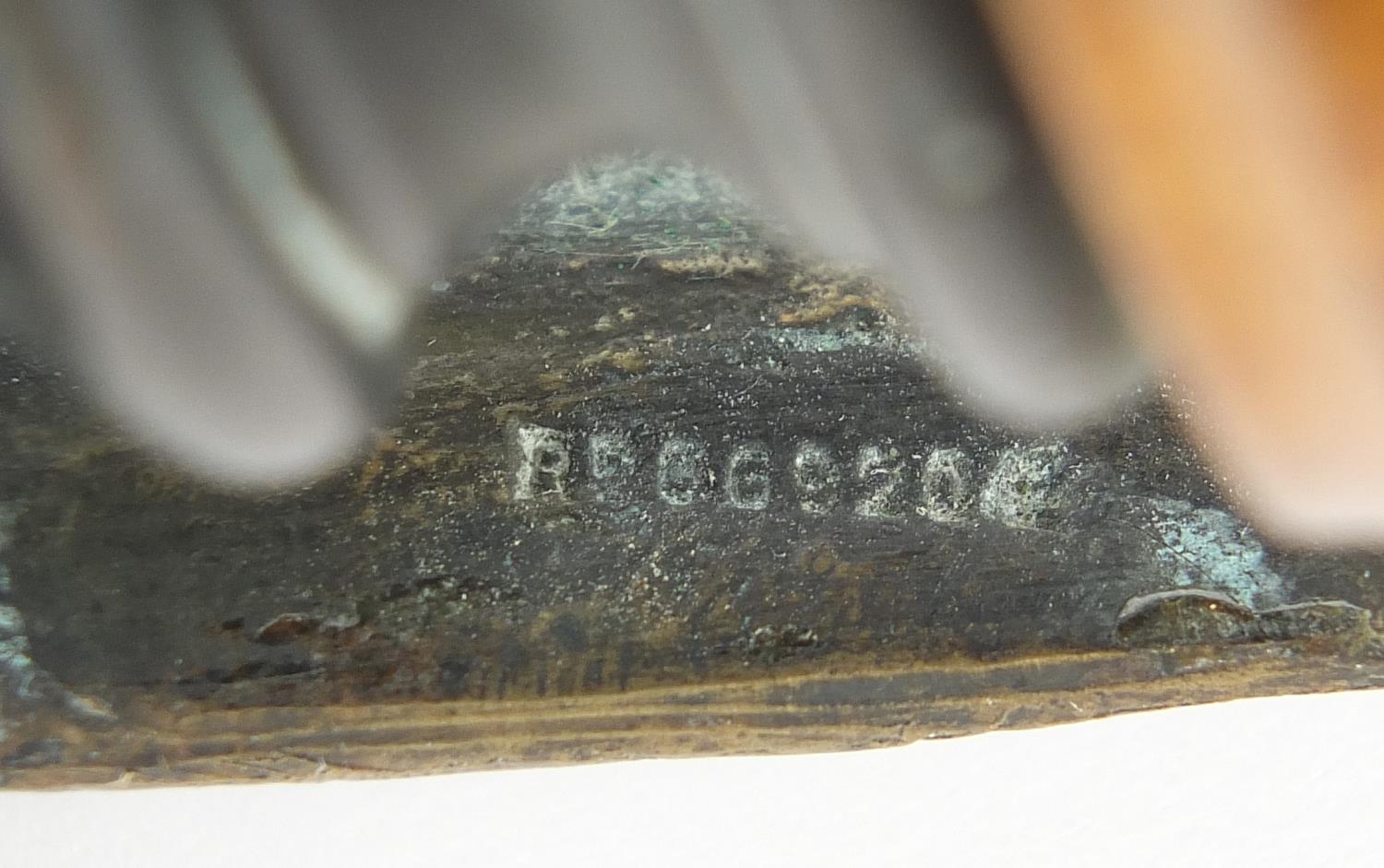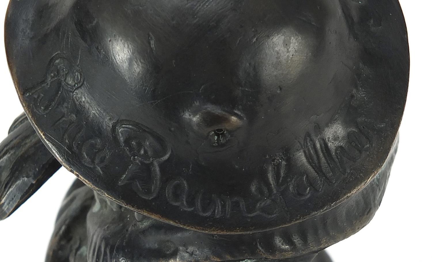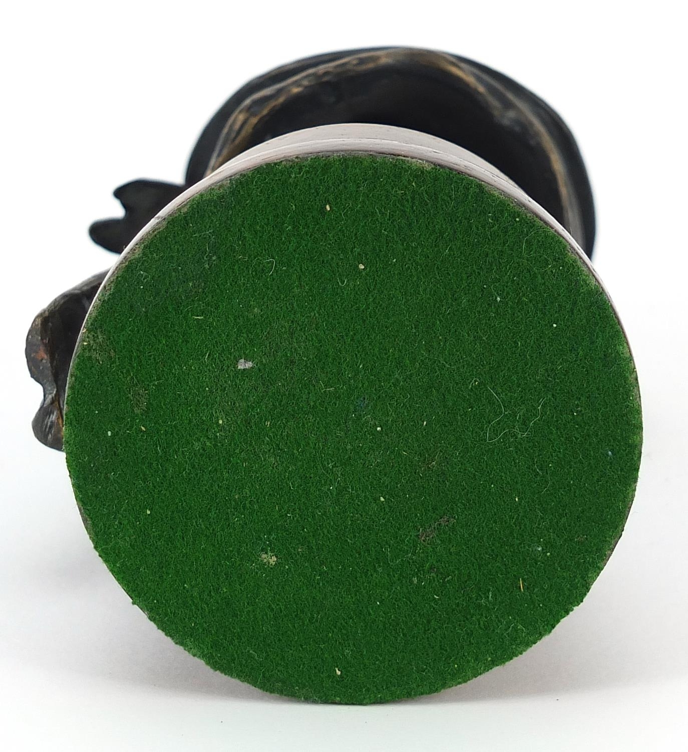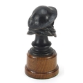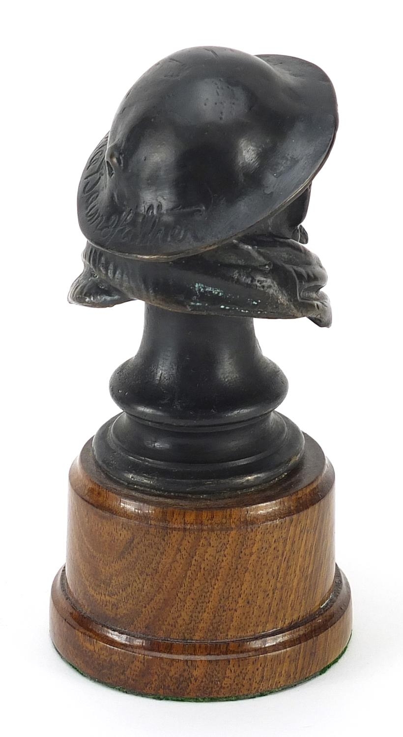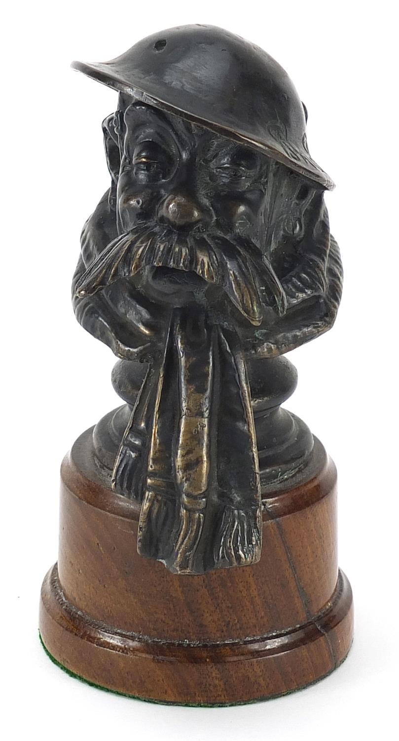 Motoring interest patinated bronze Bruce Bairnsfather Old Bill car mascot raised on later turned wood base, 14.5cm high