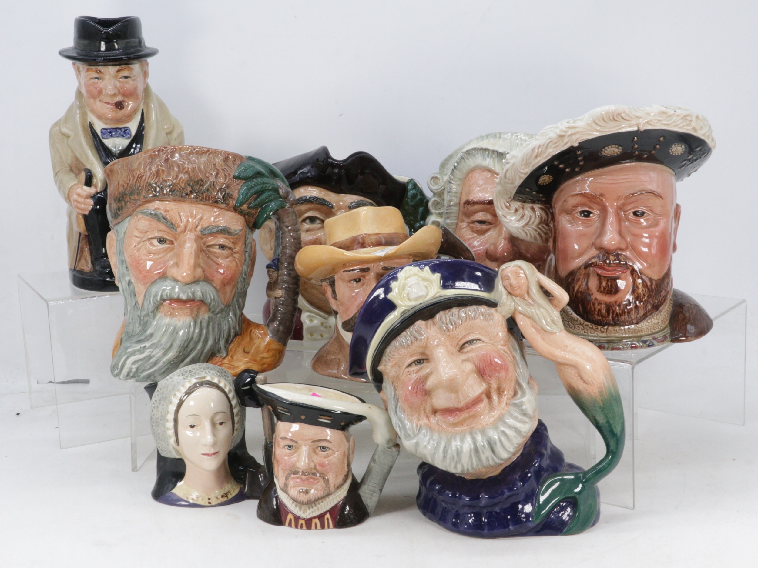 A selection of Royal Doulton character jugs to include Robinson Crusoe, The Lawyer, Mine Host, Anne Boleyn, Wyatt Earp, Winston Churchill, Henry VIII, Old Salt and Beswick Henry VIII