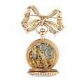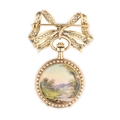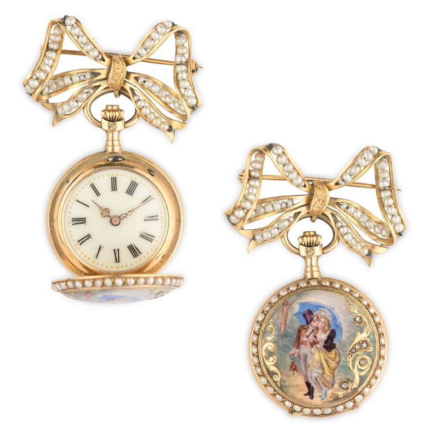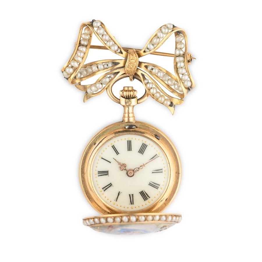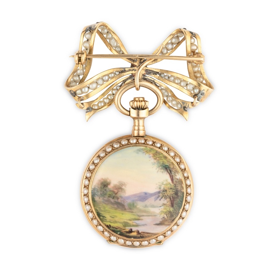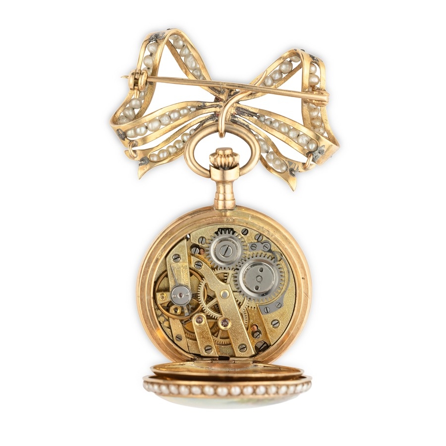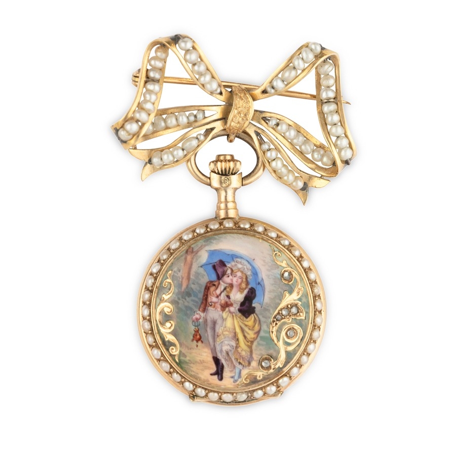 JACKET POCKET WATCH WITH BROOCH, MICRO-PEARLS AND POLYCHROME ENAMELS, SWITZERLAND FOR THE GERMAN MARKET, CIRCA 1900