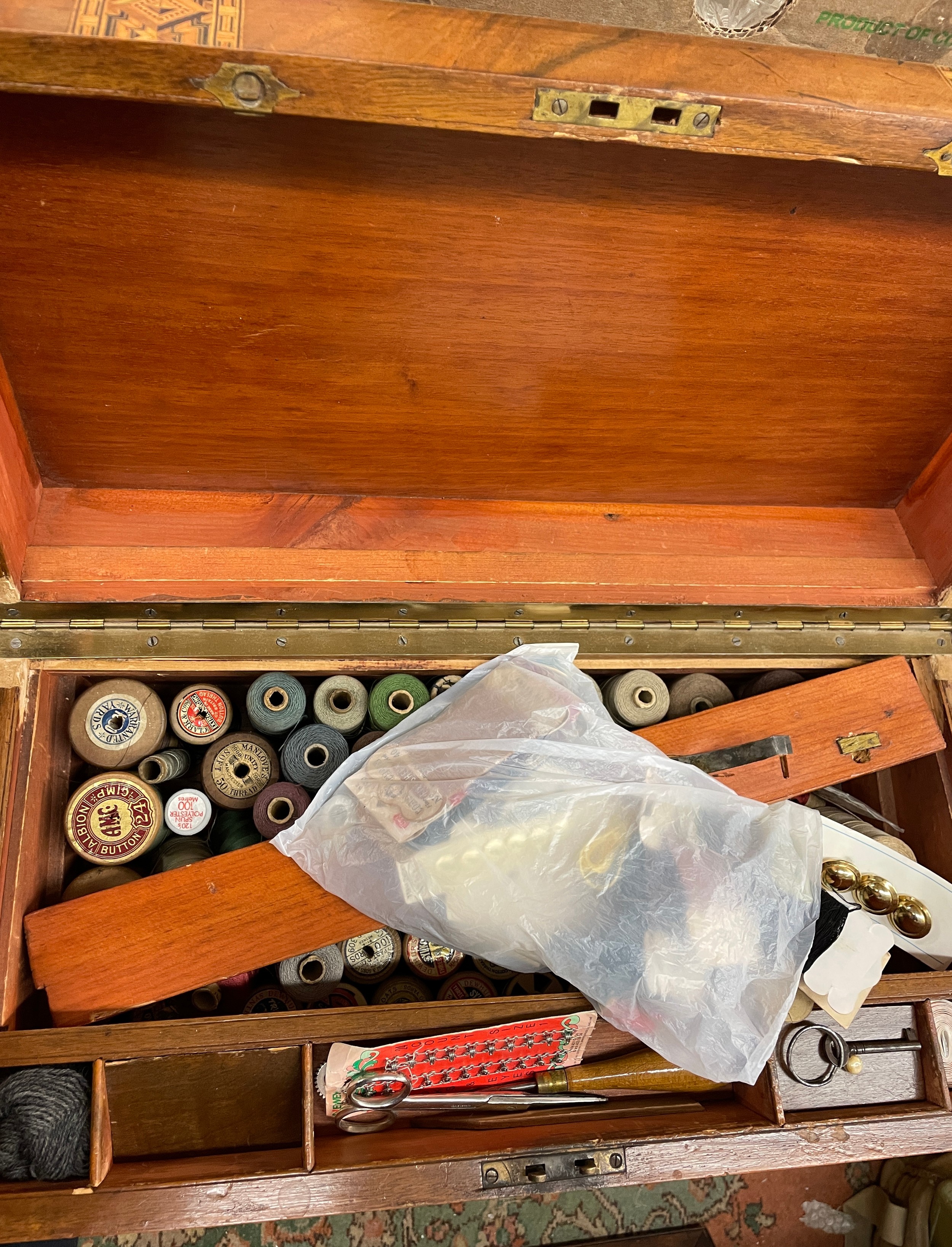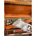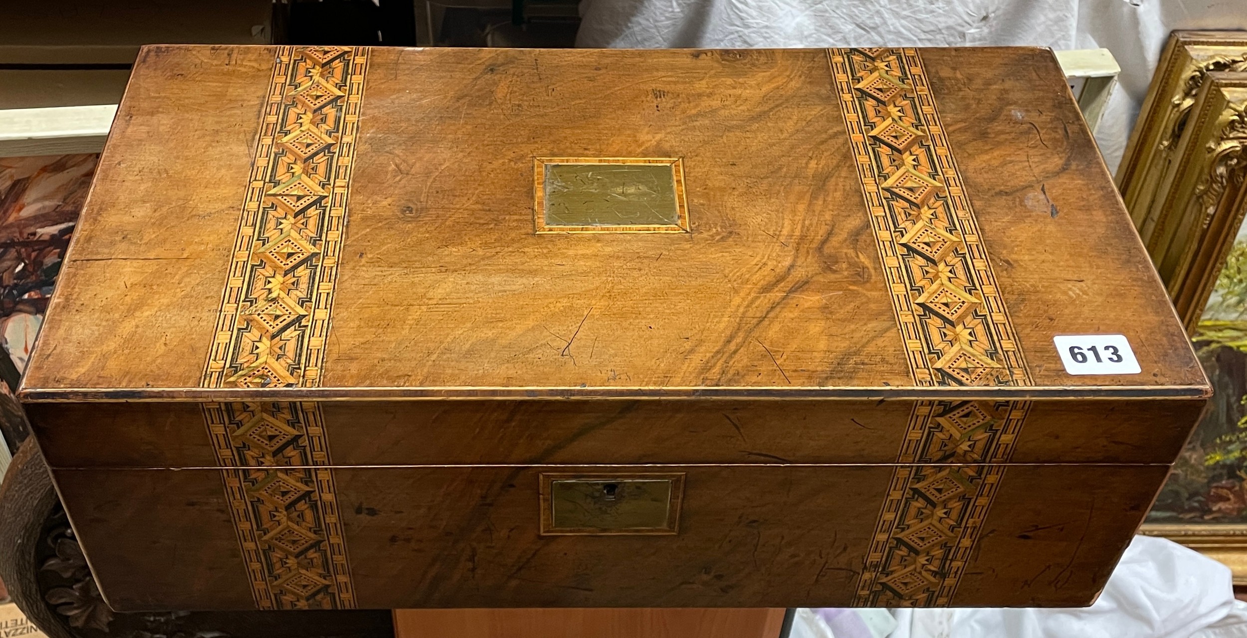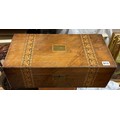 VICTORIAN WALNUT TUNBRIDGE BANDED WRITING BOX CONTAINING HABERDASHERY