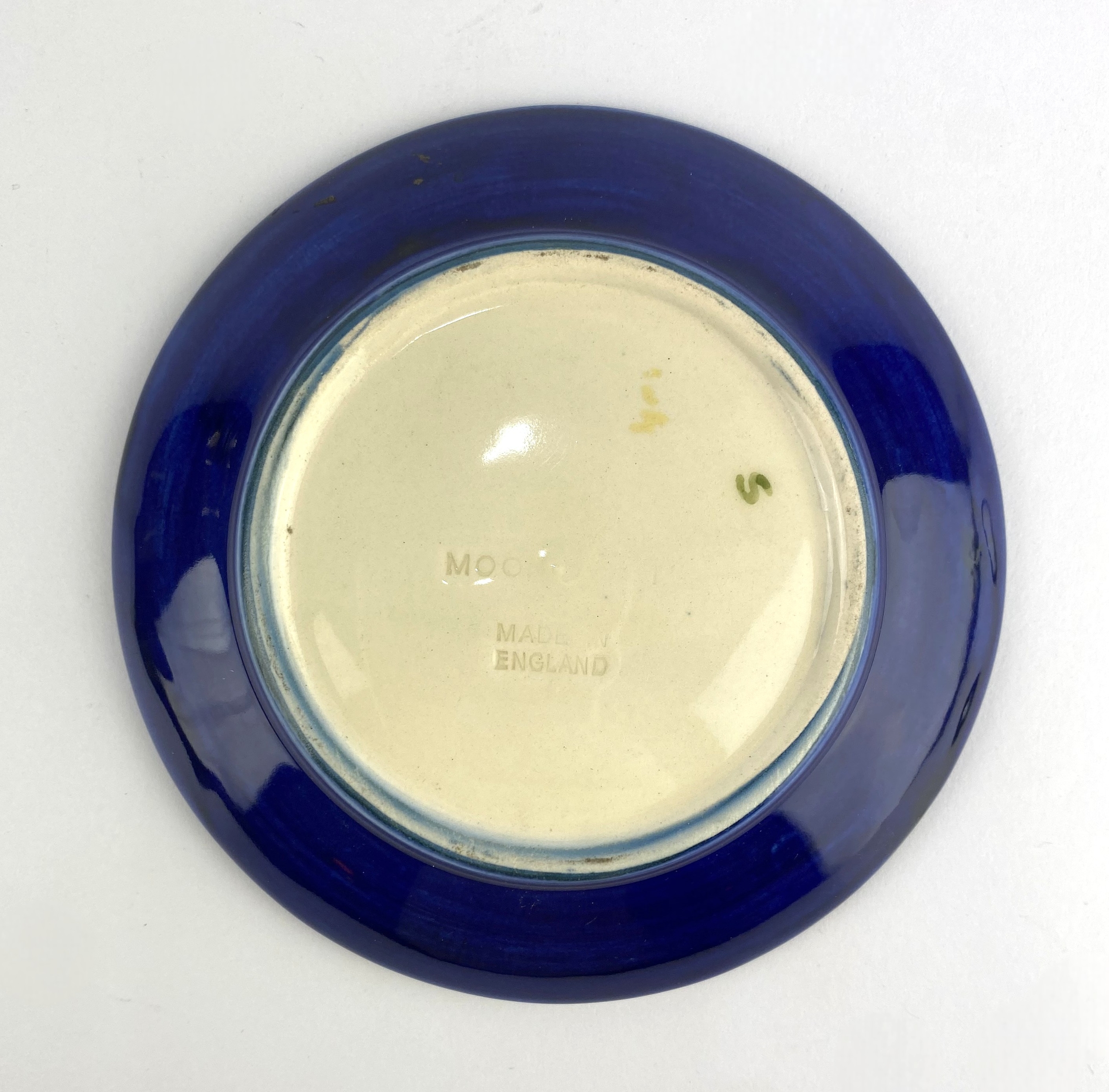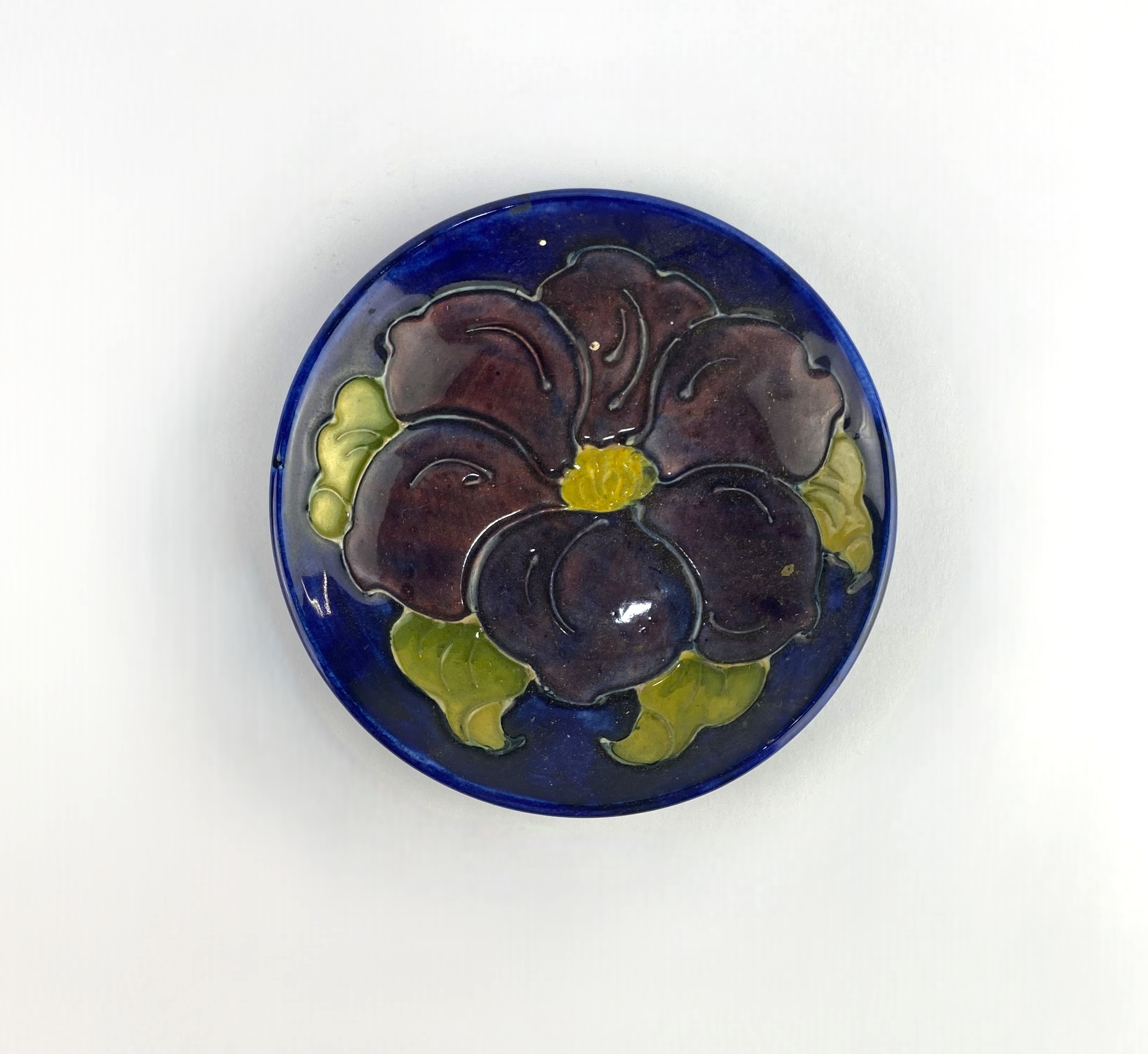 A Moorcroft 'Clematis' pattern trinket/ pin dish, decorated against the dark blue ground, impressed makers mark to base, diameter 12cm