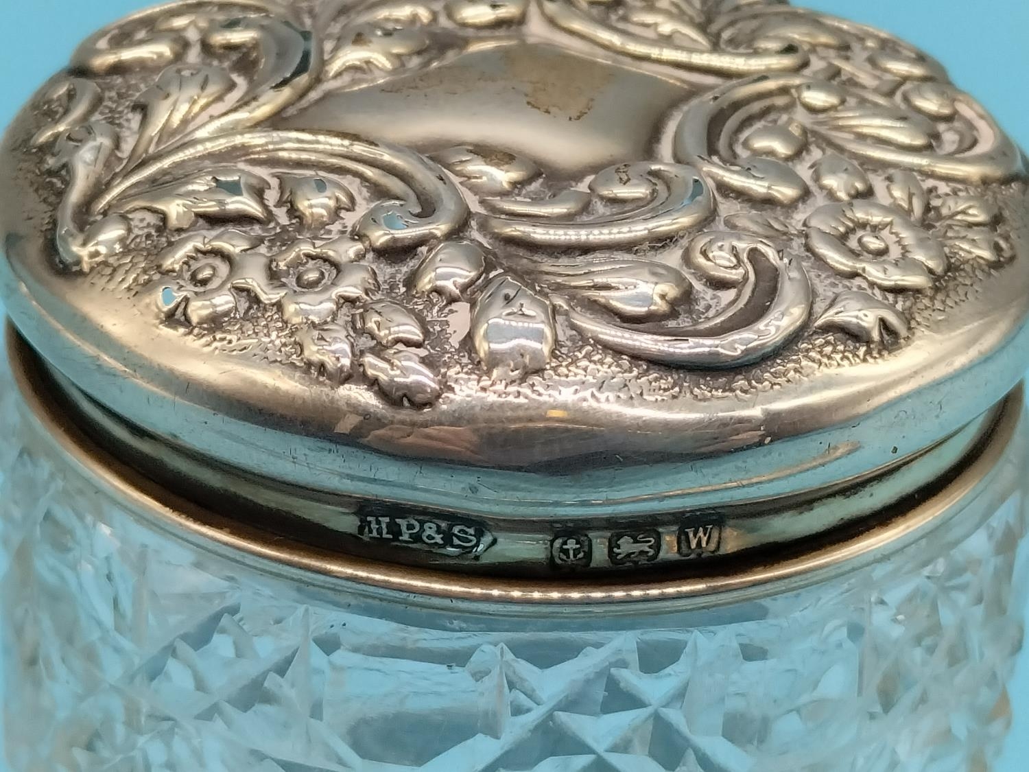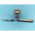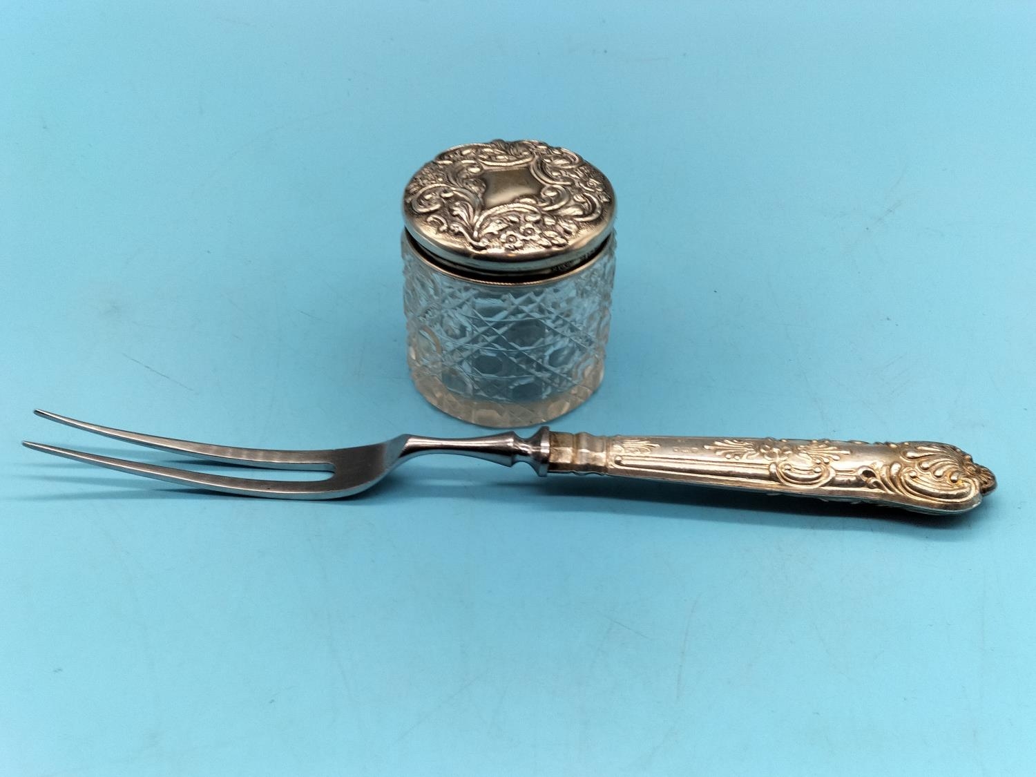 Hallmarked Silver Topped Cut Glass Jar and Silver Handled Carving Fork.