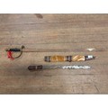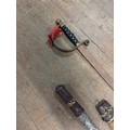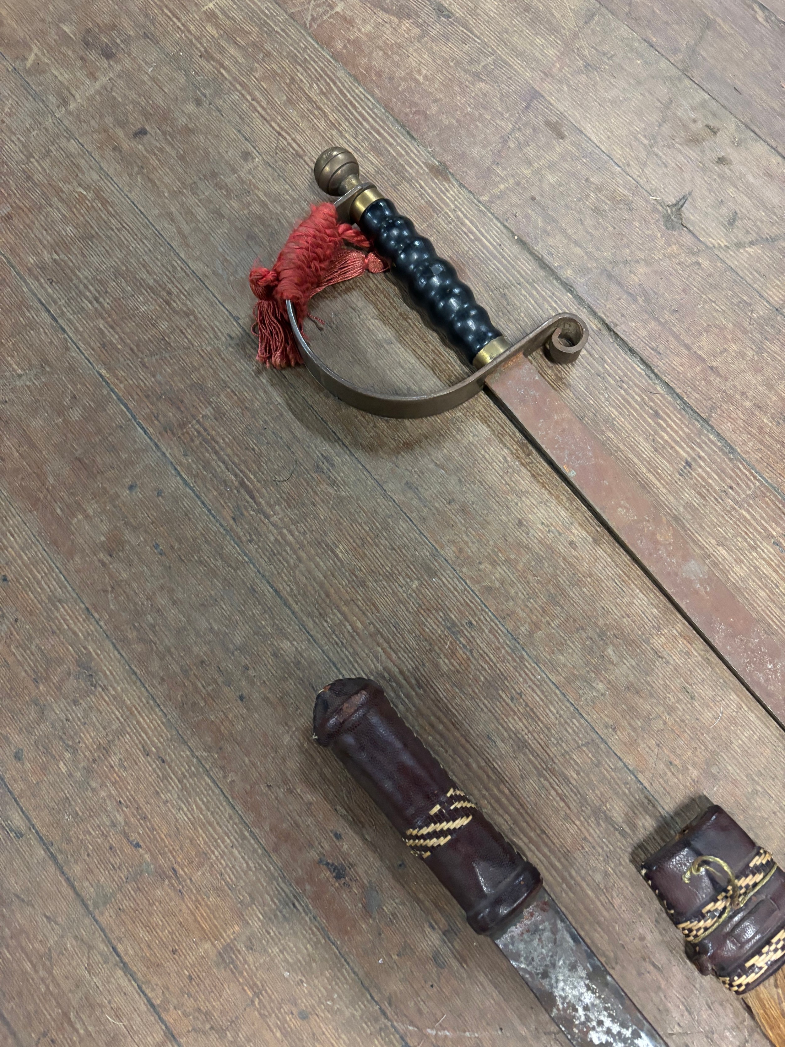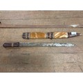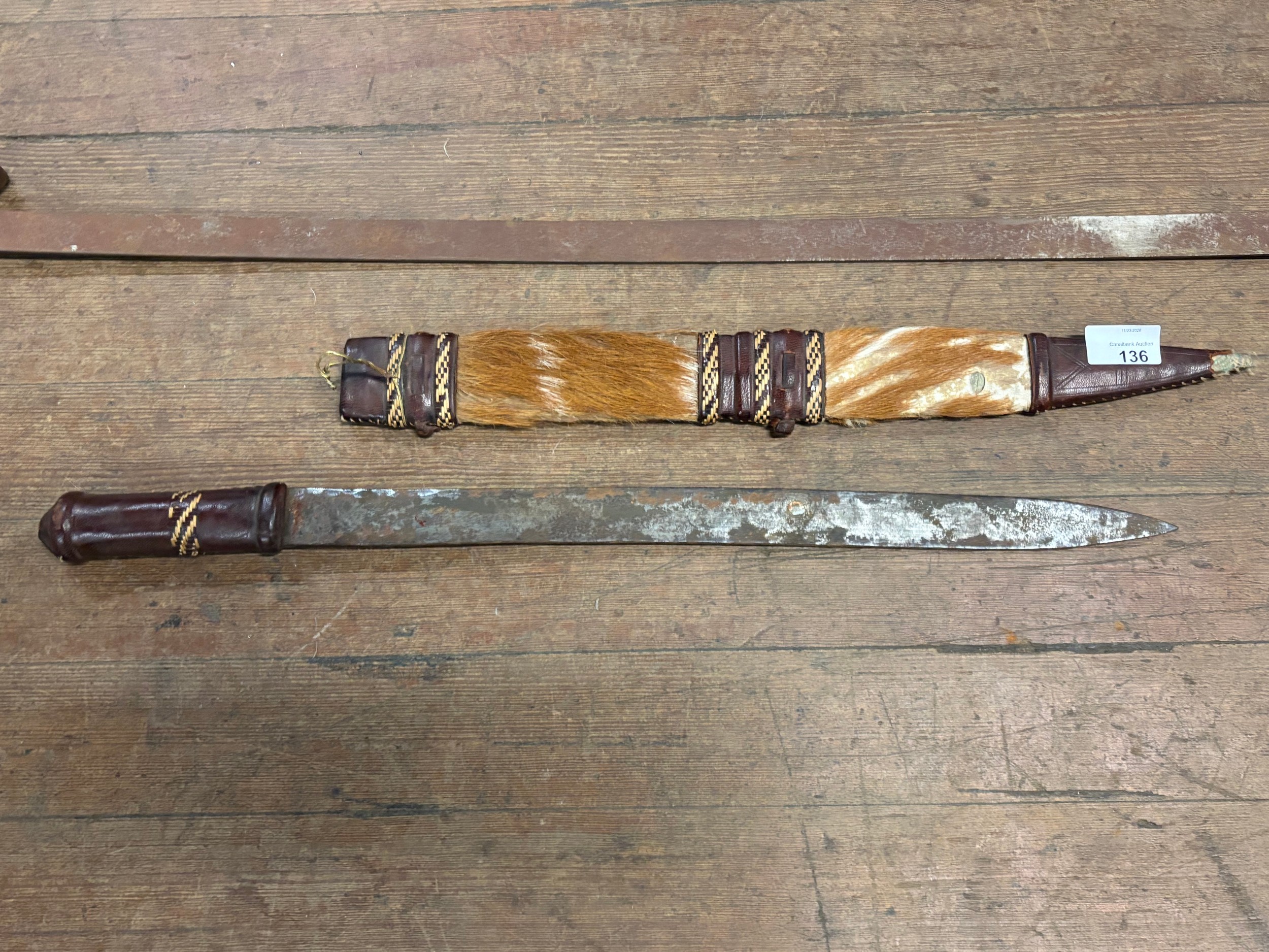 African tribal knife with leather and animal hair sheath 24" long along with a 19th century British pattern sword 39" long.