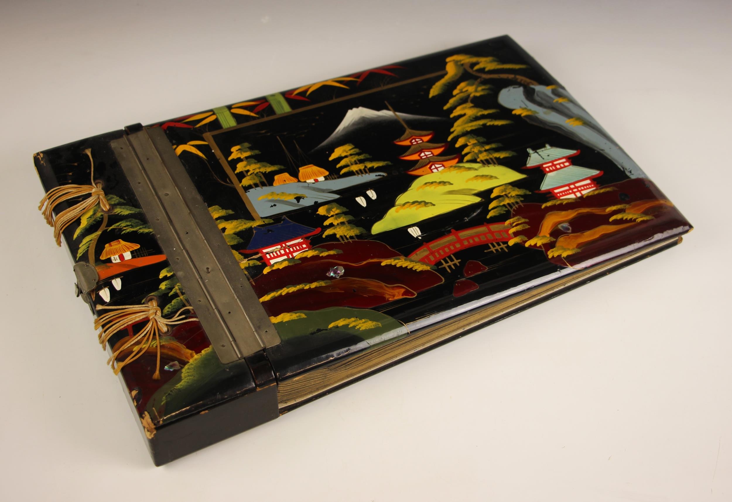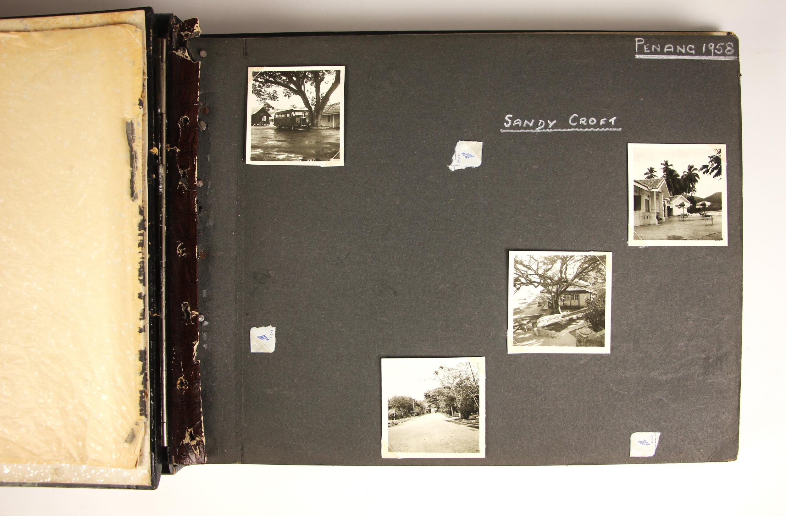 A collection of approximately sixty black and white photographs depicting Penang and Singapore in 1958, to include topographical and architectural scenes, and scenes of military life, all to a lacquered and painted photograph album (at fault)