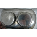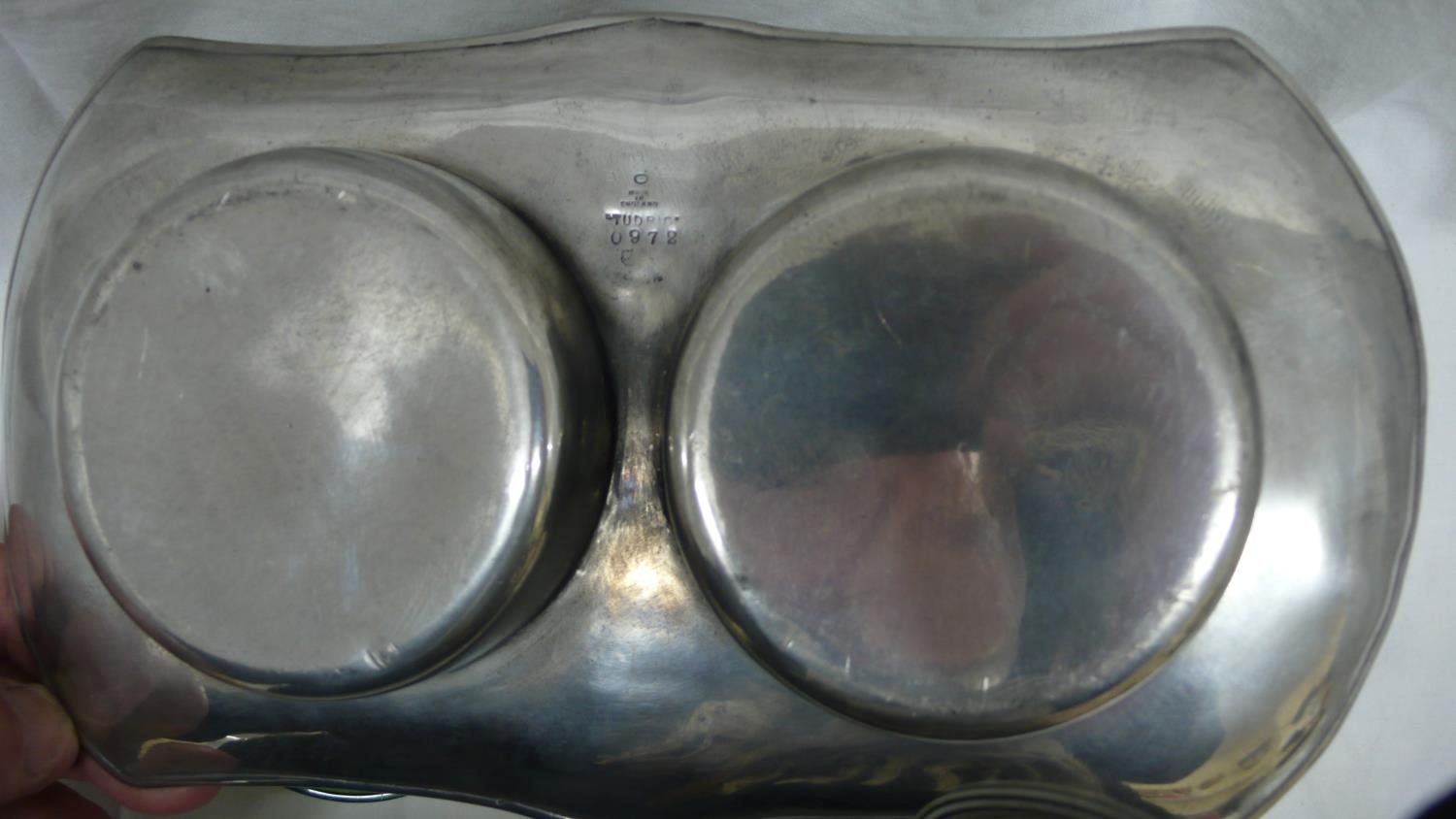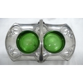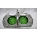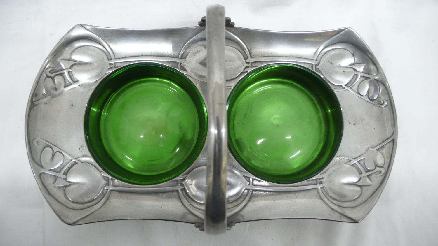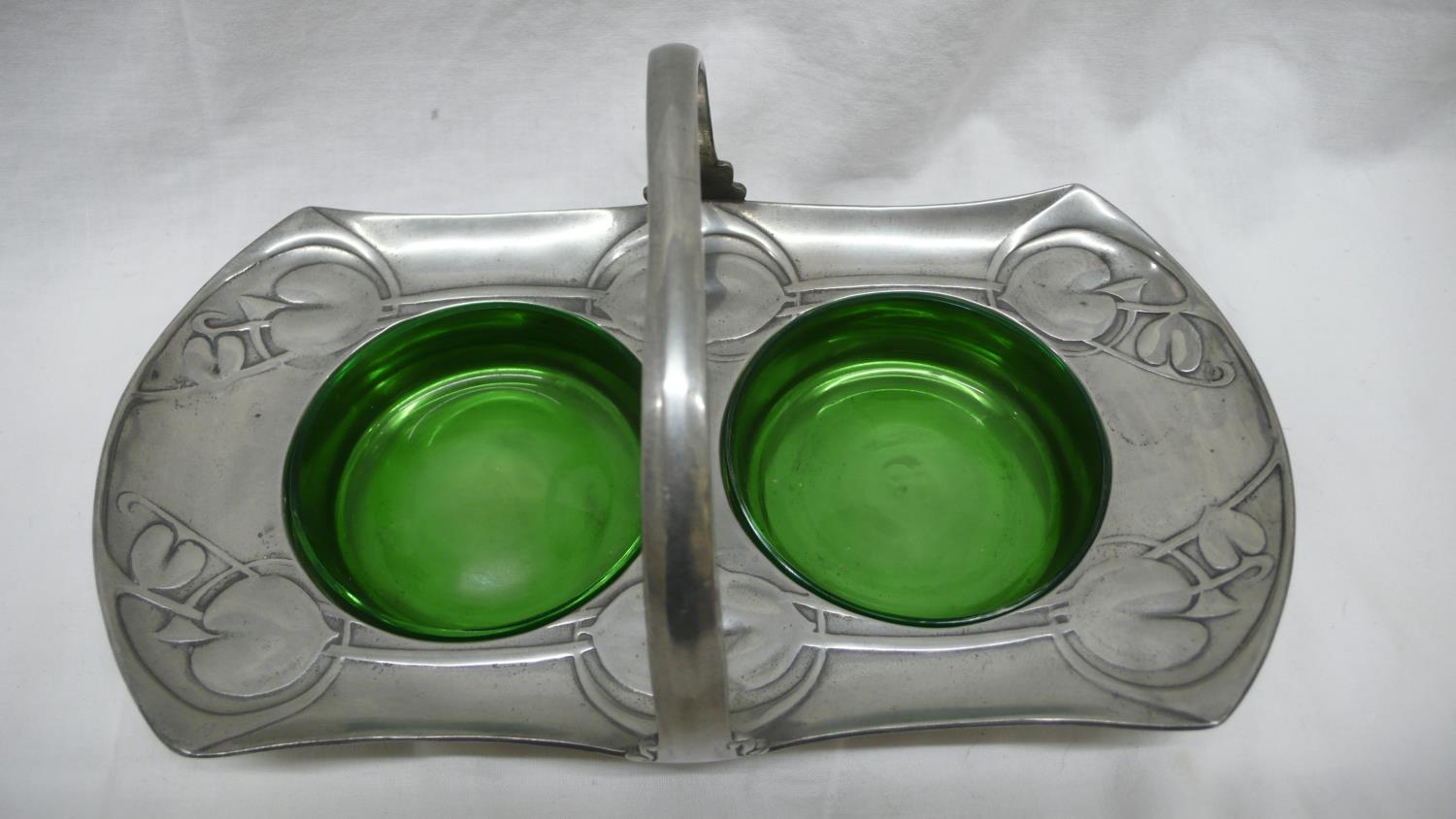 Archibald Knox Liberty & Co. - A Tudric pewter preserve dish with handle two green glass bowls and stylized leaves and stem decoration, No. 0972, length 26 cms