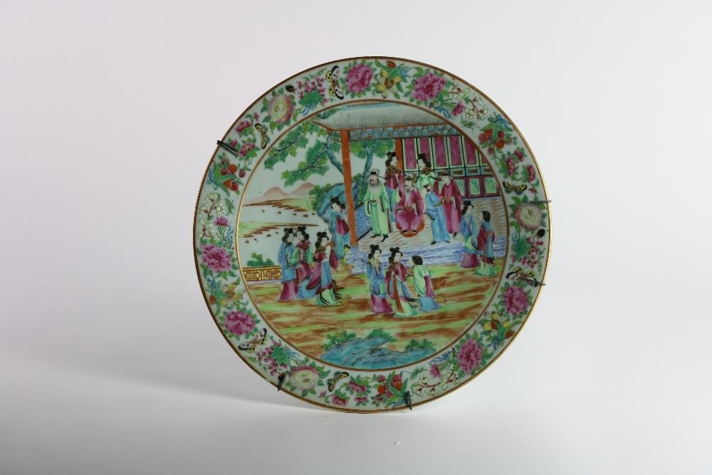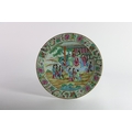 A large 19th Century Cantonese porcelain Saucer Dish, decorated with numerous figures around a pagoda, the wide border decorated with fruit, flowers and insects, 37cms (14 1/2"). (1)