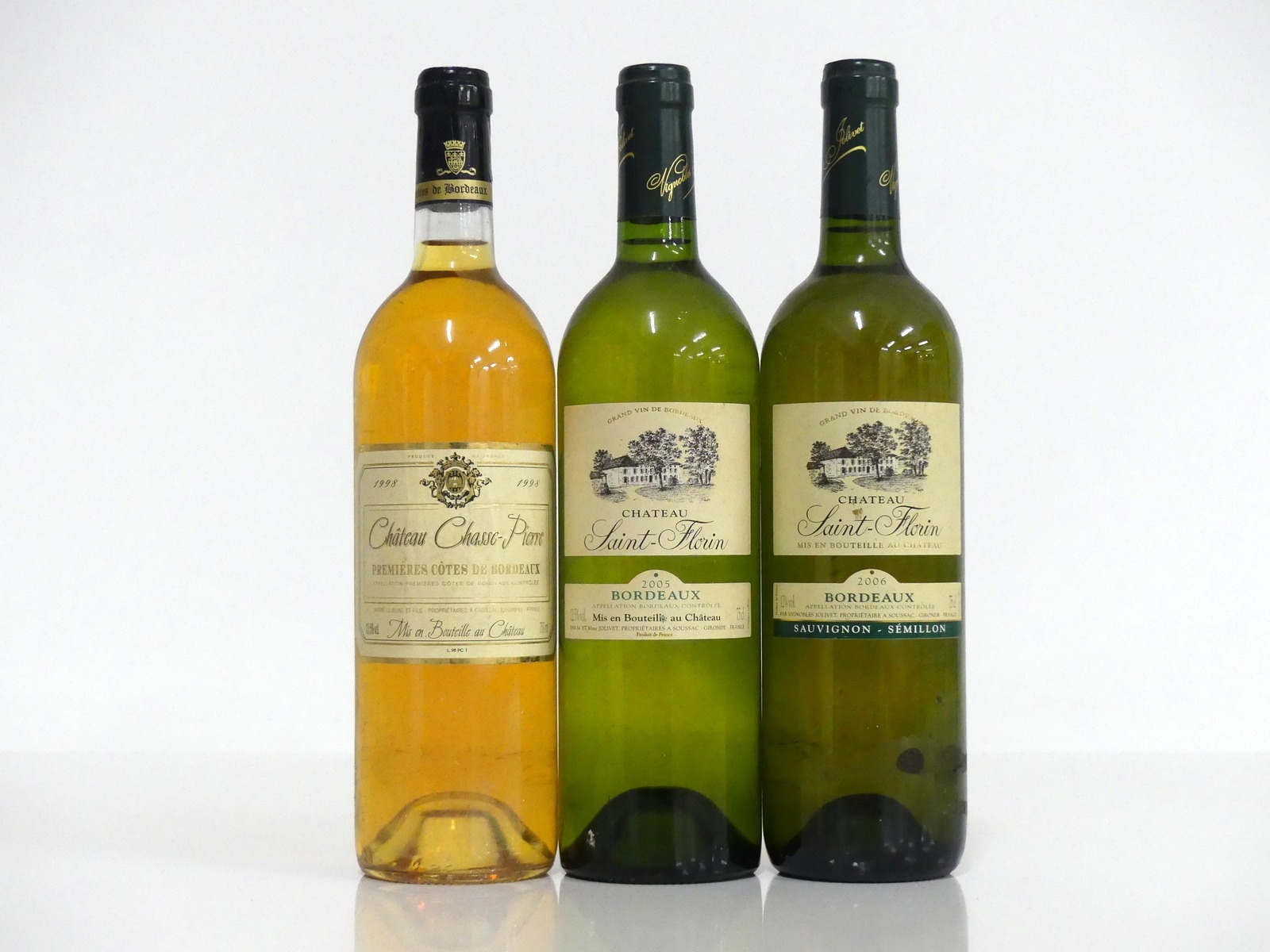 1 bt Ch. Chasse-Pierre Premières Côtes de Bordeaux 1998 i.n, sl bs 1 bt Ch. Florin 2005 Bordeaux i.n, vsl bs 1 bt Ch. Florin 2006 Bordeaux i.n, vsl bs Above 3 bottles