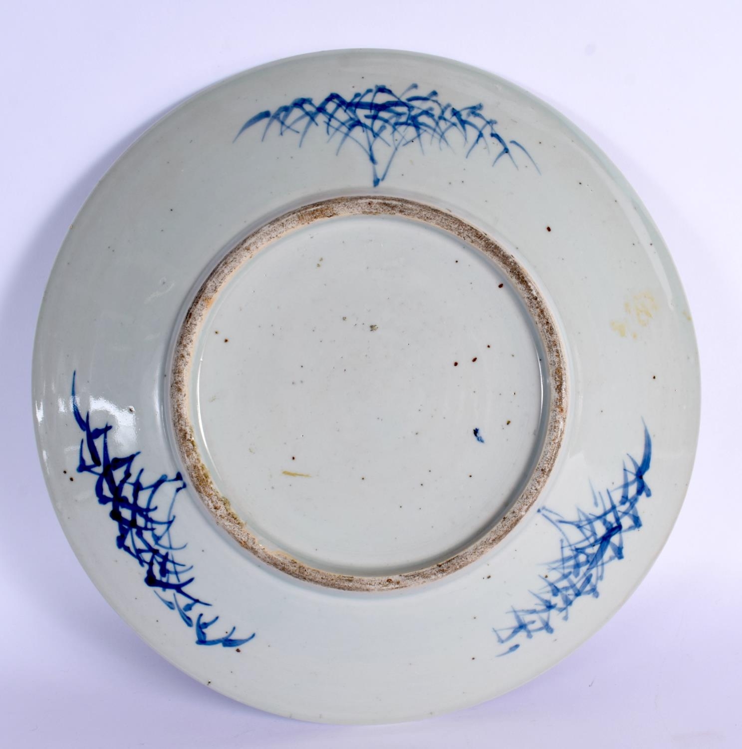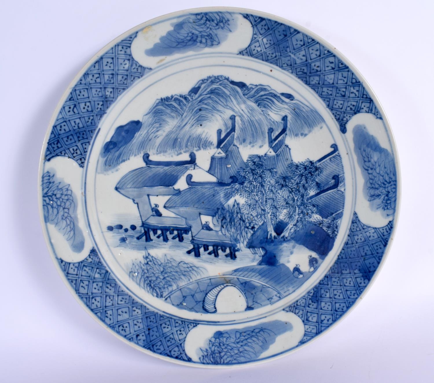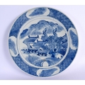 A LARGE 19TH CENTURY CHINESE BLUE AND WHITE PORCELAIN DISH Qing painted with landscapes. 28.5 cm diameter.