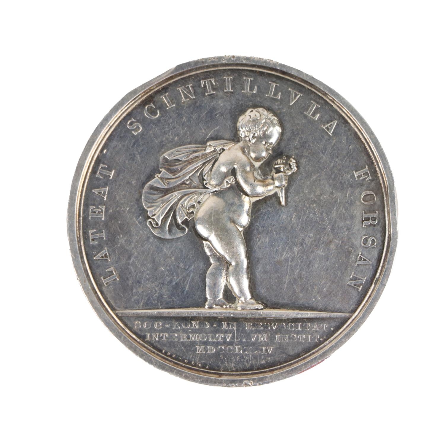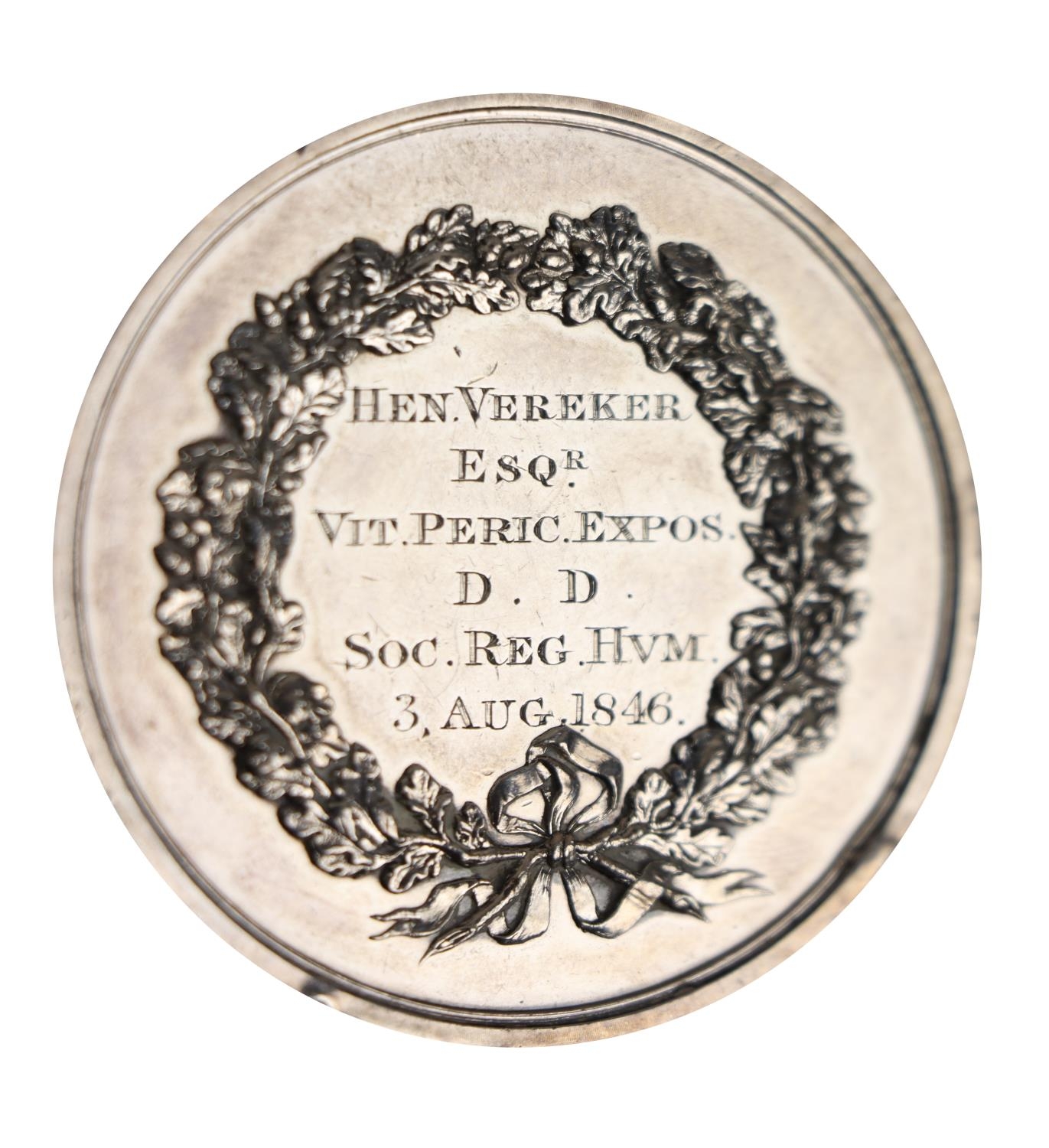 Medal: [Irish Interest] A silver circular Medal, the obverse with central cherub and inscribed 'Lateat Scintillula Forsa - Soc. in Resuscitat Intermortu Vm Instit. 1774,' the reverse inscribed 'Hen Vereker Esq. vit Peric Expos D.D. Soc. Reg. Hym, 3 Aug. 1846' inside floral garland. (1)