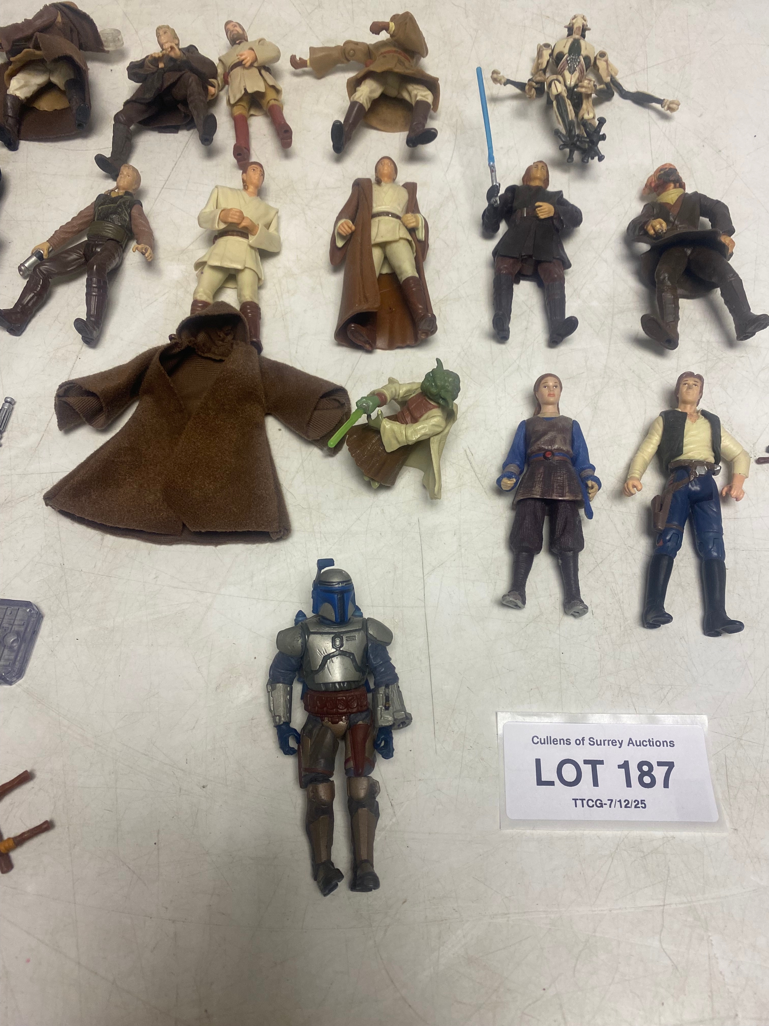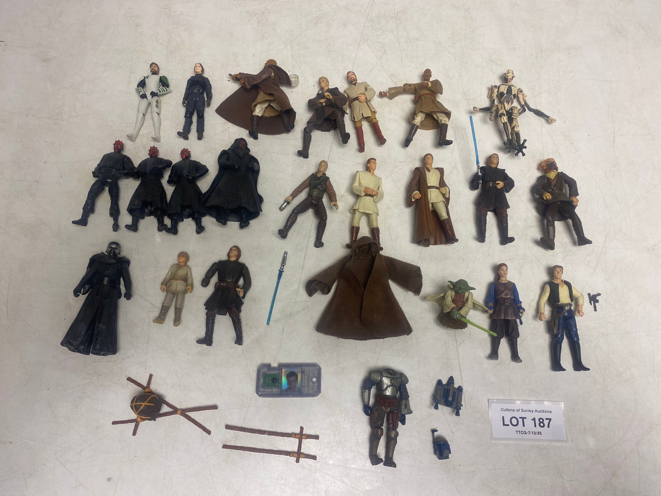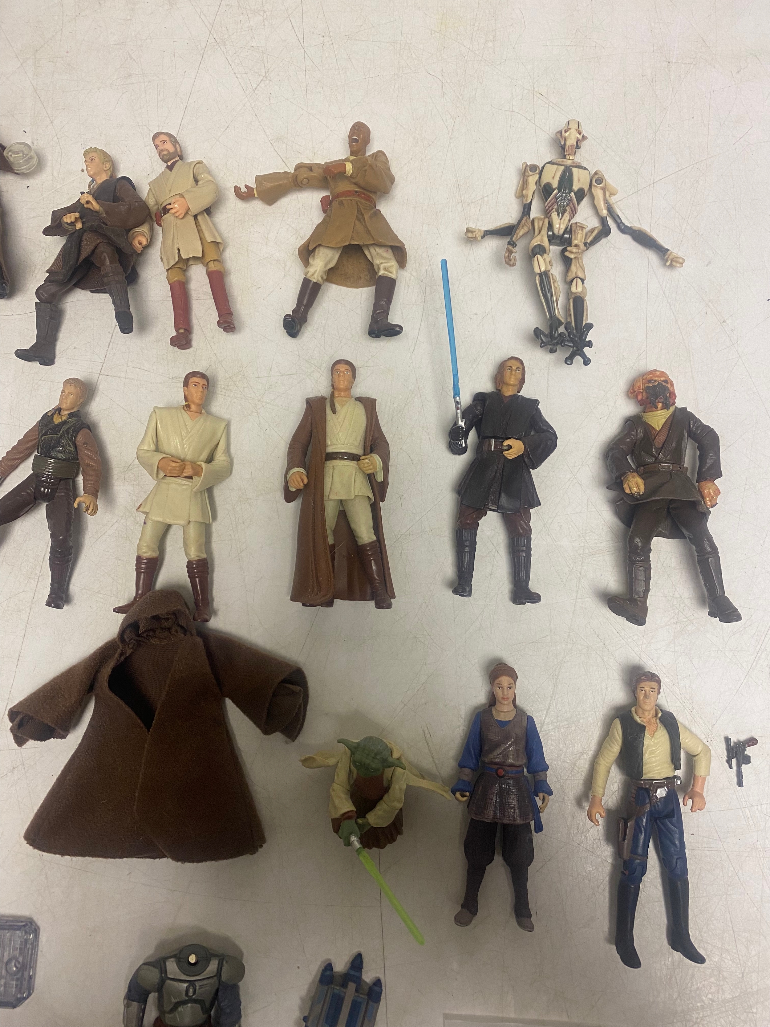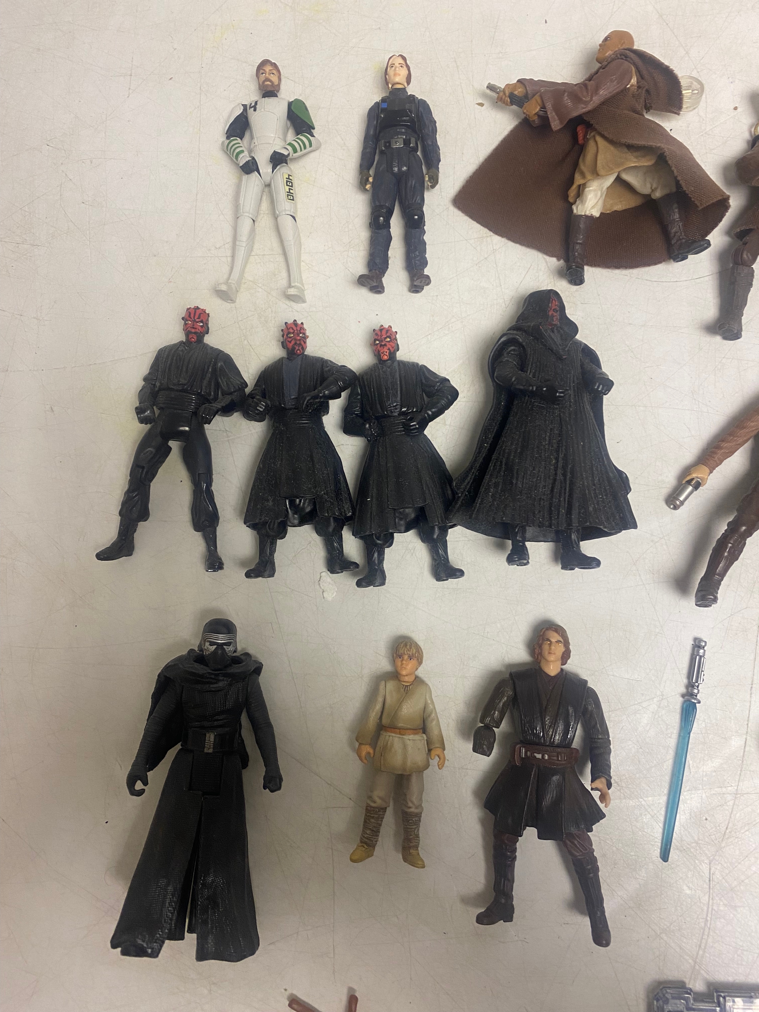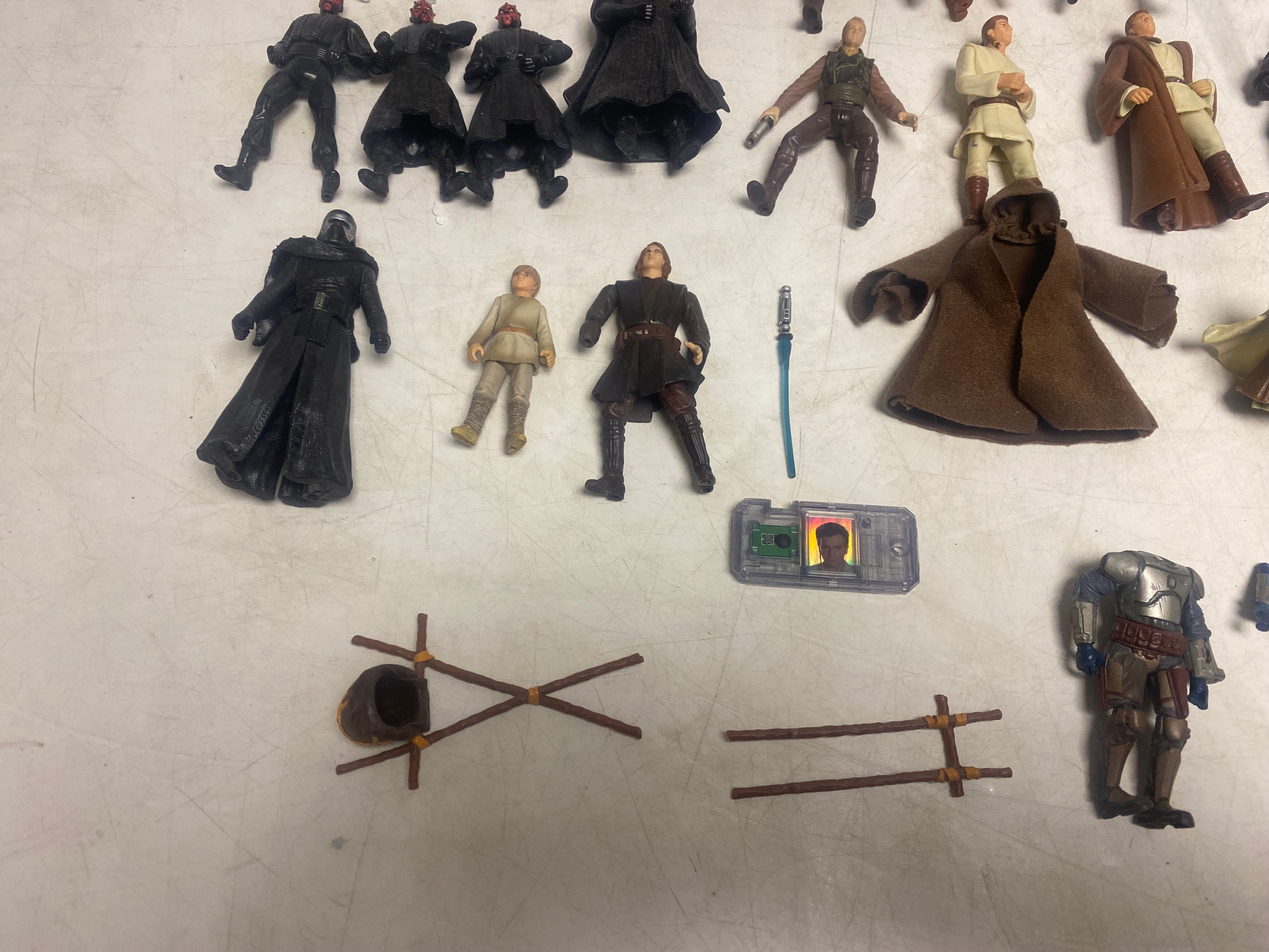 An Assortment of Star Wars Figures including, removable magnetic head Jango Fett, Anakin Skywalker, Obi-Wan Kenobi, Mace Windu, Han Solo, Yoda, General Grevious, Clone Wars Obi-Wan, Darth Maul and Kylo Ren