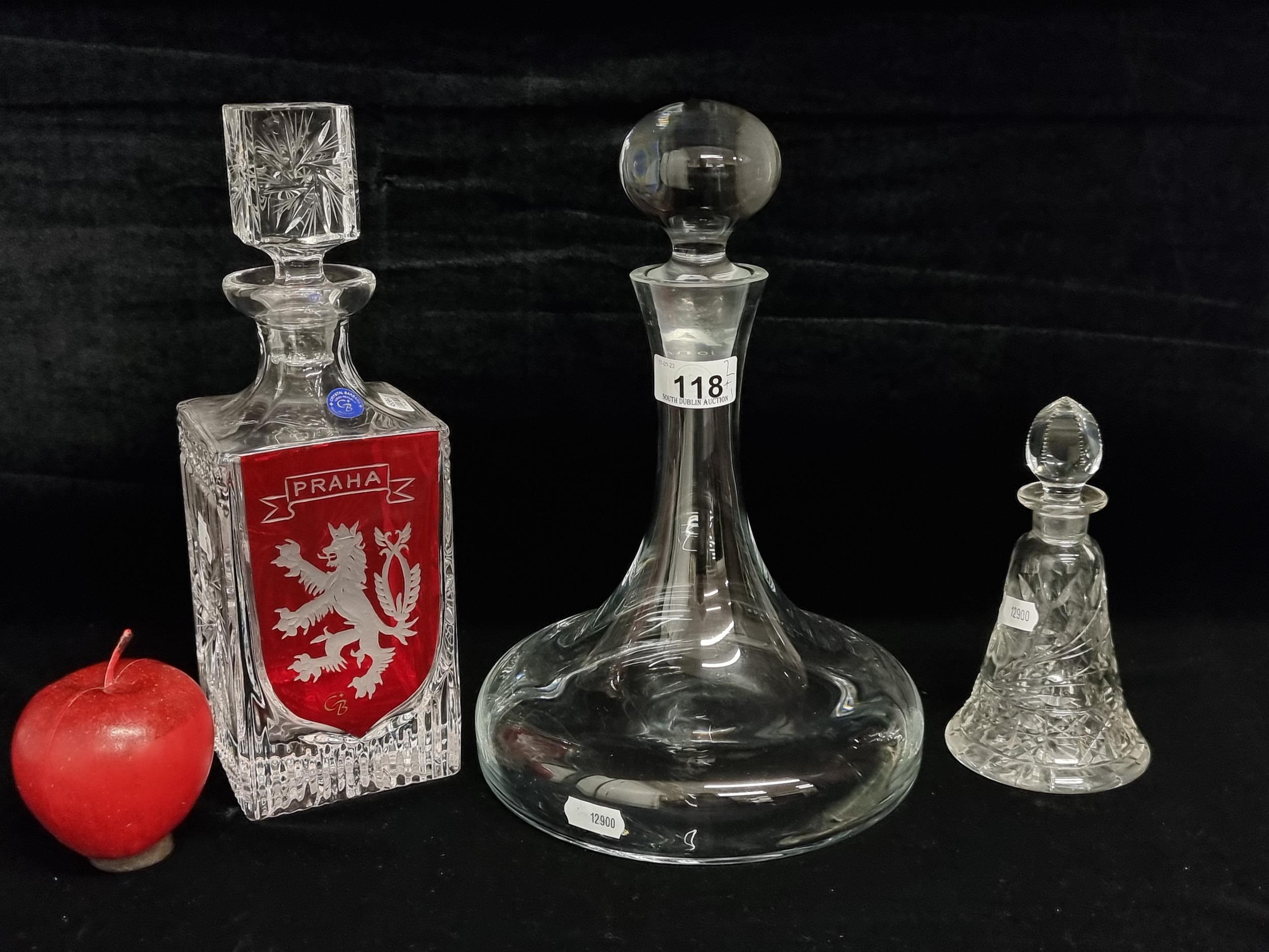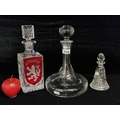 A selection of three elegant cut crystal and glass decanters in varying sizes and shapes. Including a ships decanter by LSA International in the 'Bar' model (RRP: £100 on lsa-international.com) and a Bohemia Crystal hand made 'Barbara' decanter with an etched lion and brand sticker. Along with a neatly proportioned perfume example with a floral pattern and an unusual notched stopper. All in very good condition.