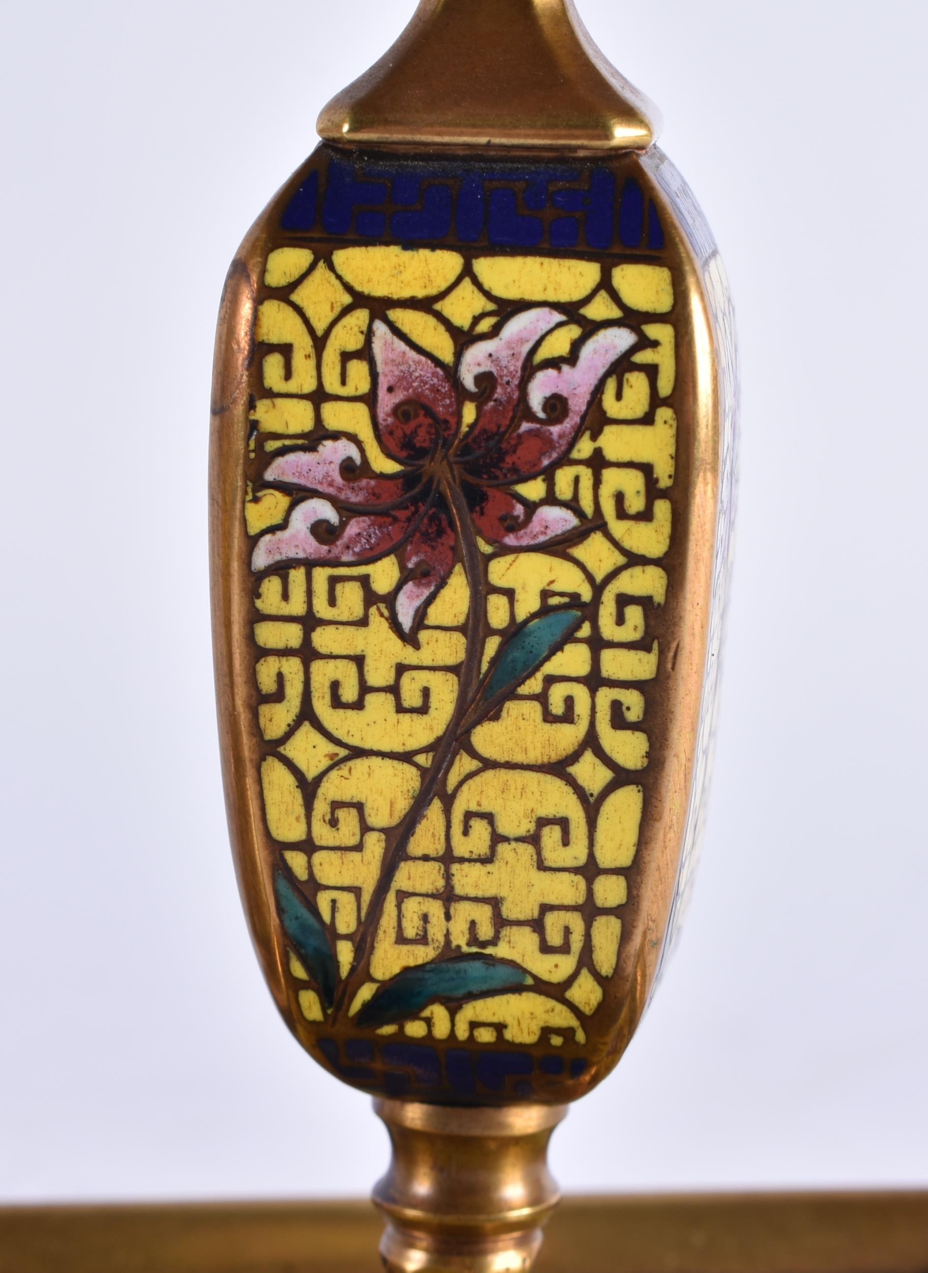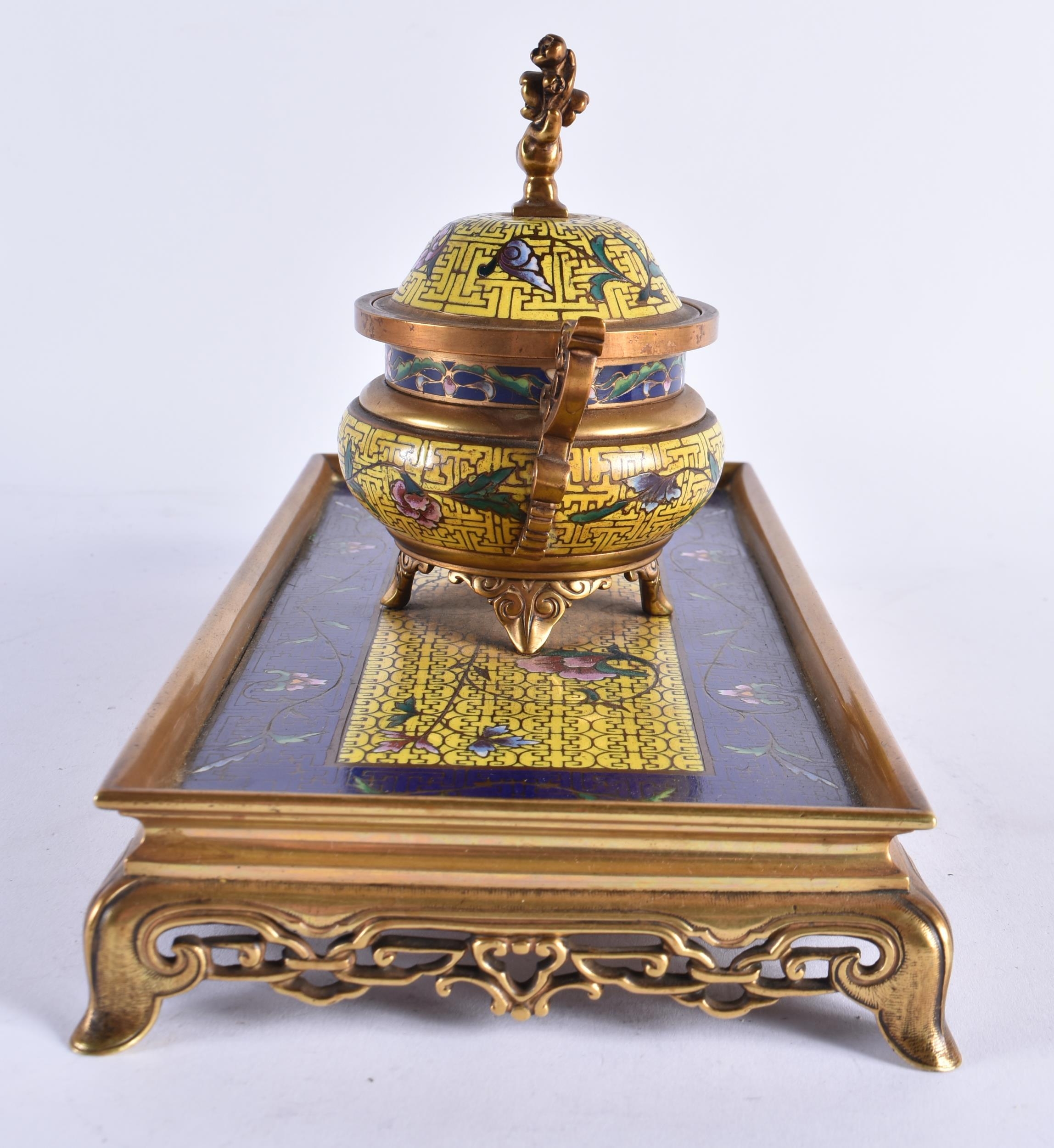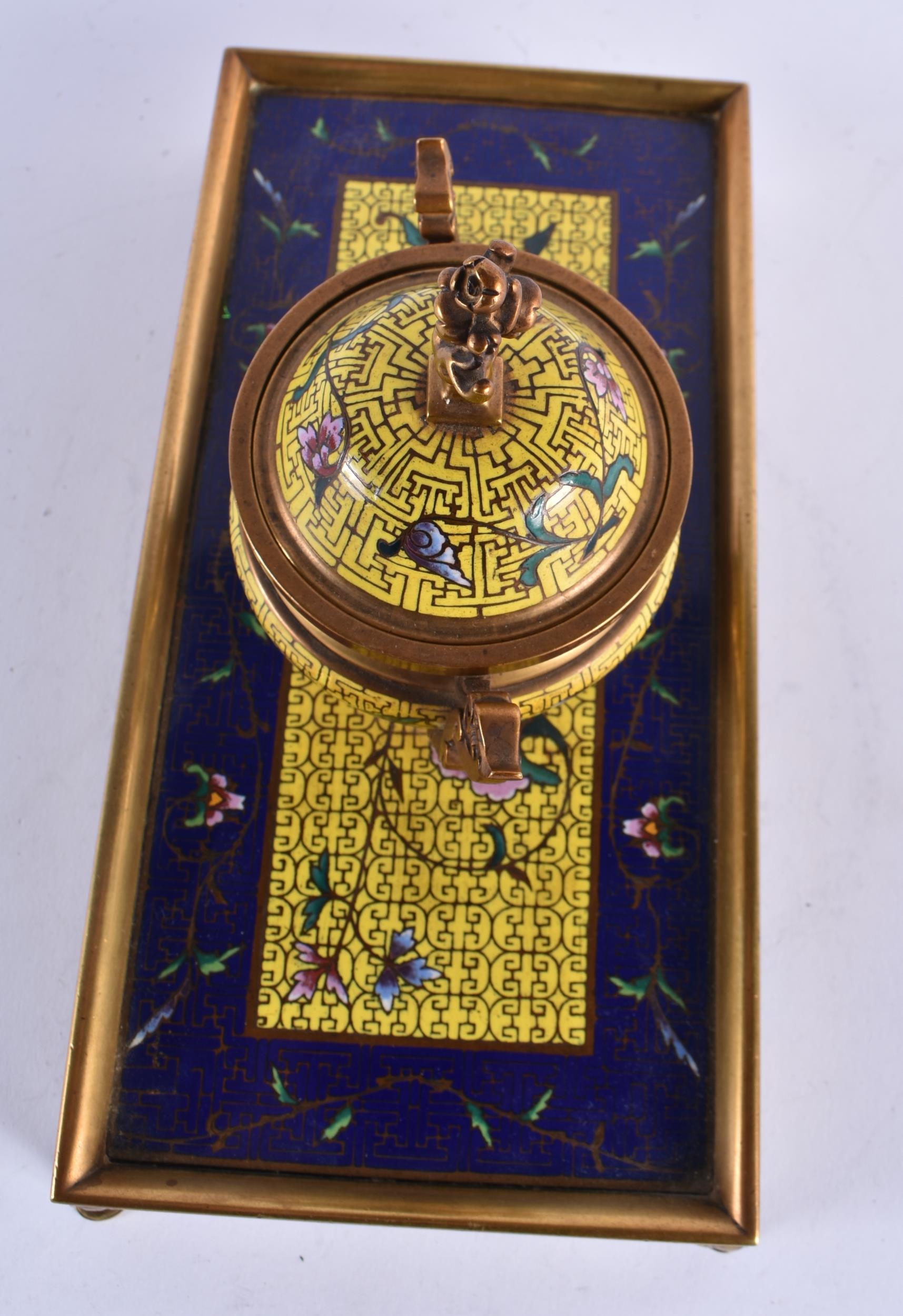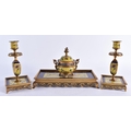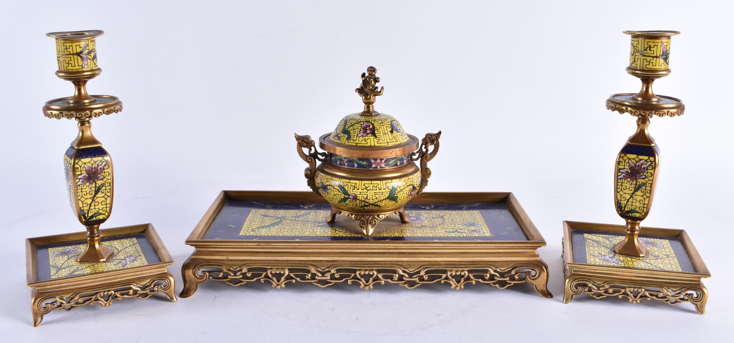 A FINE 19TH CENTURY FRENCH BRONZE AND CHAMPLEVE ENAMEL DESK GARNITURE in the manner of Barbedienne, decorated with foliage and vines. Largest 26 cm x 12 cm. (3) Note: Champlevé is an enamelling technique in the decorative arts, or an object made by that process, in which troughs or cells are carved, etched, die struck, or cast into the surface of a metal object, and filled with vitreous enamel. The piece is then fired until the enamel fuses, and when cooled the surface of the object is polished. The uncarved portions of the original surface remain visible as a frame for the enamel designs; typically they are gilded in medieval work. The name comes from the French for "raised field", "field" meaning background, though the technique in practice lowers the area to be enamelled rather than raising the rest of the surface.