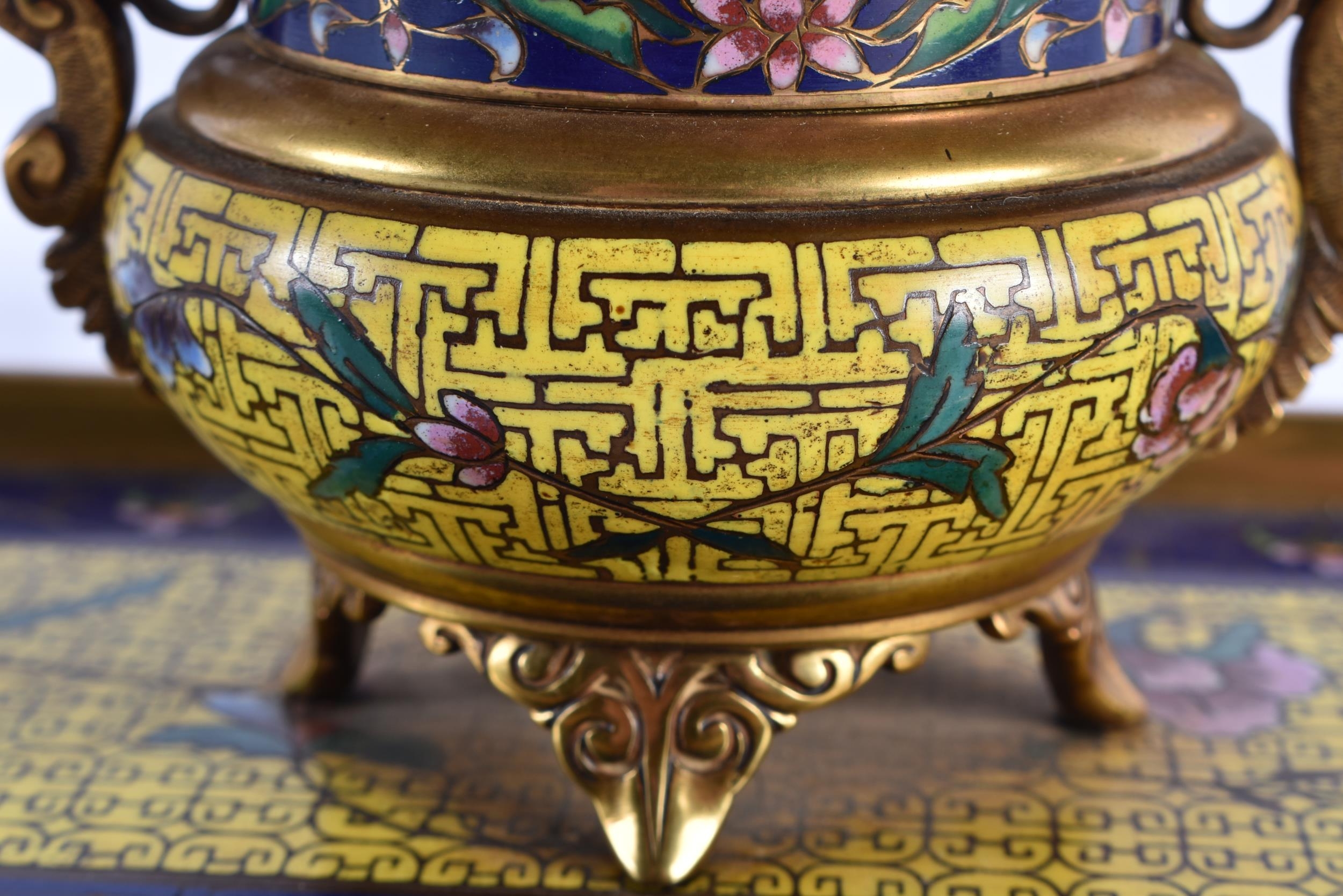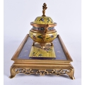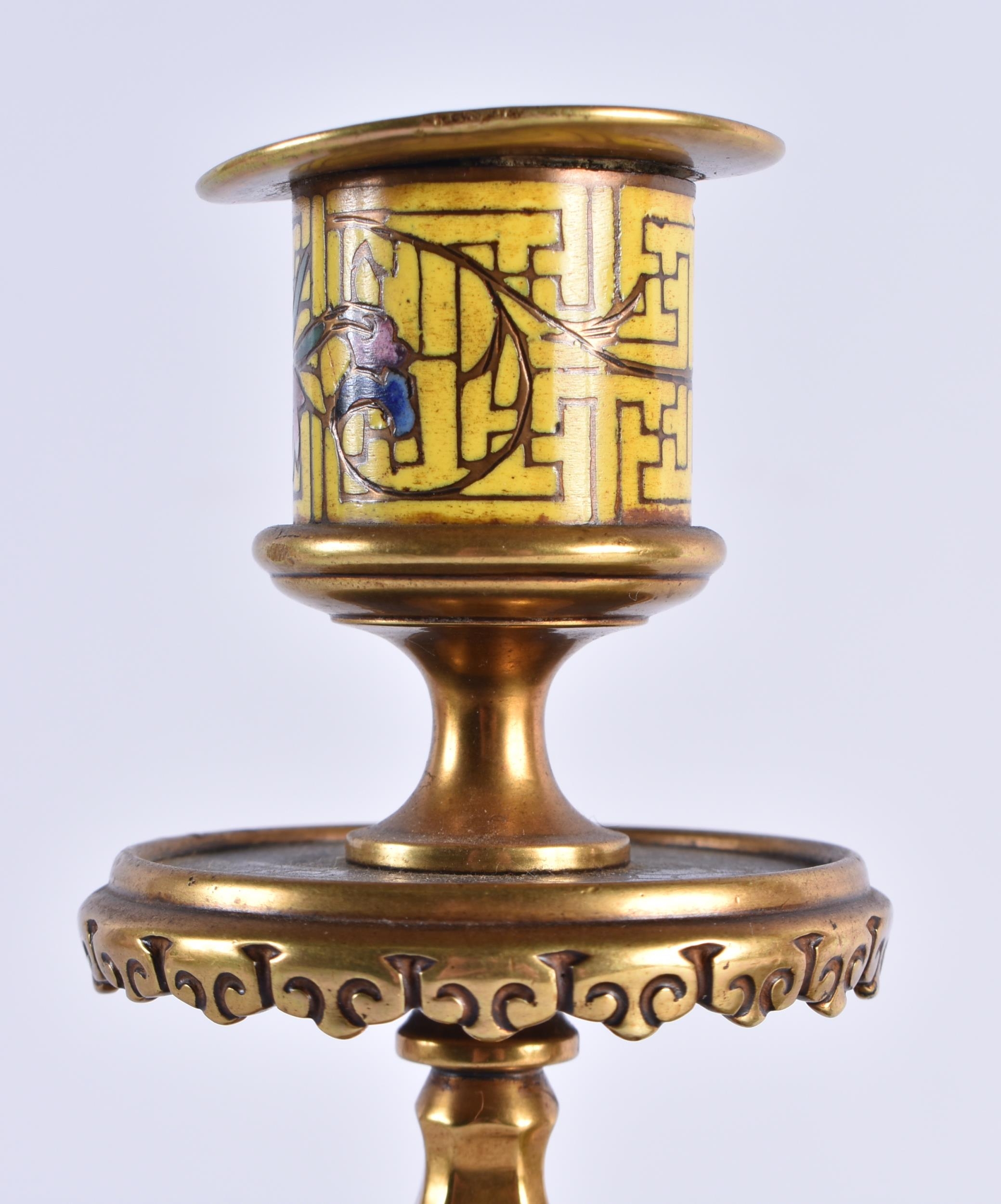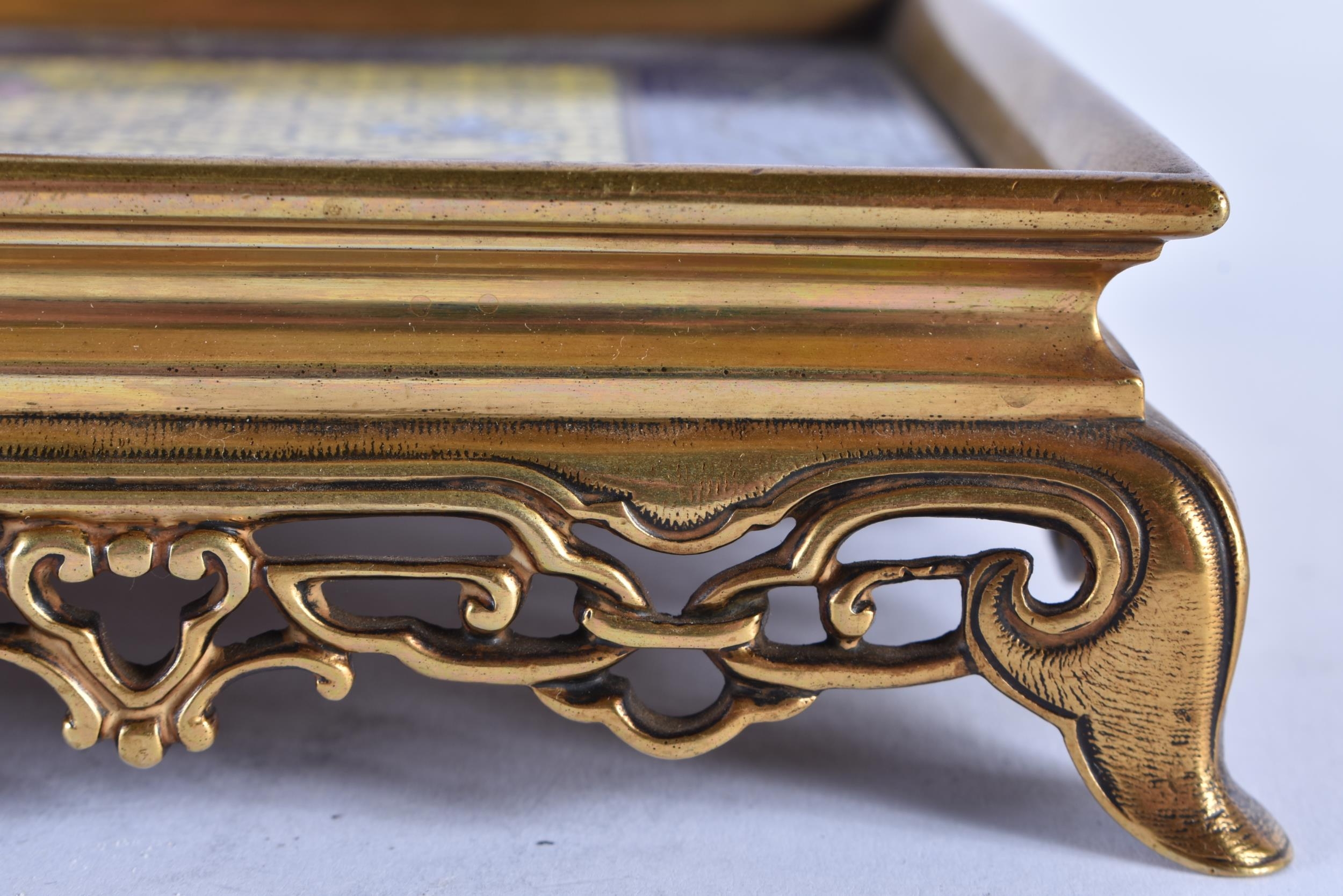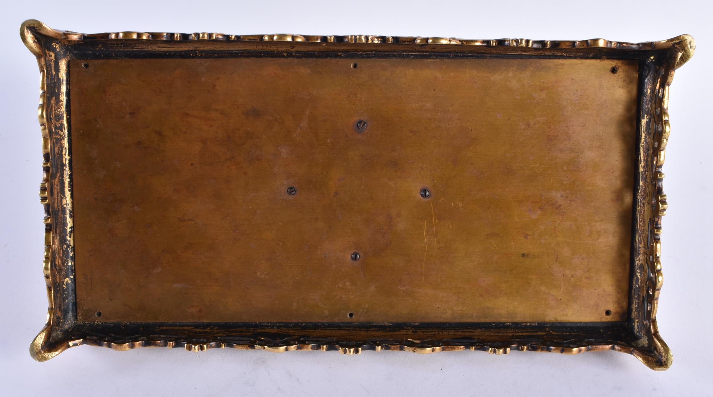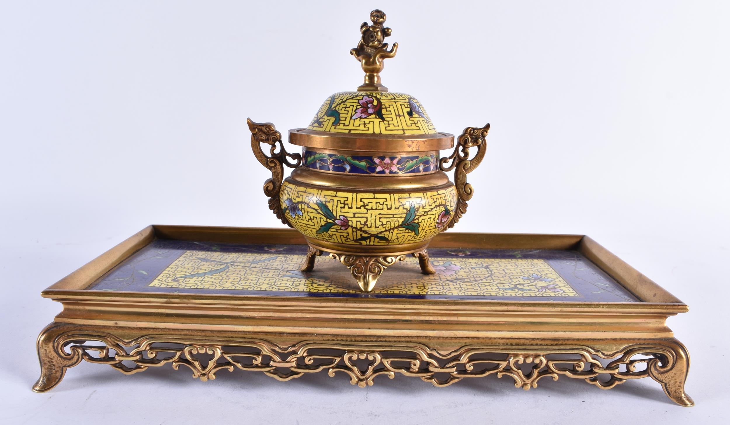 A FINE 19TH CENTURY FRENCH BRONZE AND CHAMPLEVE ENAMEL DESK GARNITURE in the manner of Barbedienne, decorated with foliage and vines. Largest 26 cm x 12 cm. (3) Note: Champlevé is an enamelling technique in the decorative arts, or an object made by that process, in which troughs or cells are carved, etched, die struck, or cast into the surface of a metal object, and filled with vitreous enamel. The piece is then fired until the enamel fuses, and when cooled the surface of the object is polished. The uncarved portions of the original surface remain visible as a frame for the enamel designs; typically they are gilded in medieval work. The name comes from the French for "raised field", "field" meaning background, though the technique in practice lowers the area to be enamelled rather than raising the rest of the surface.