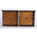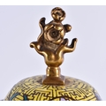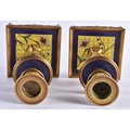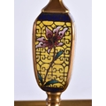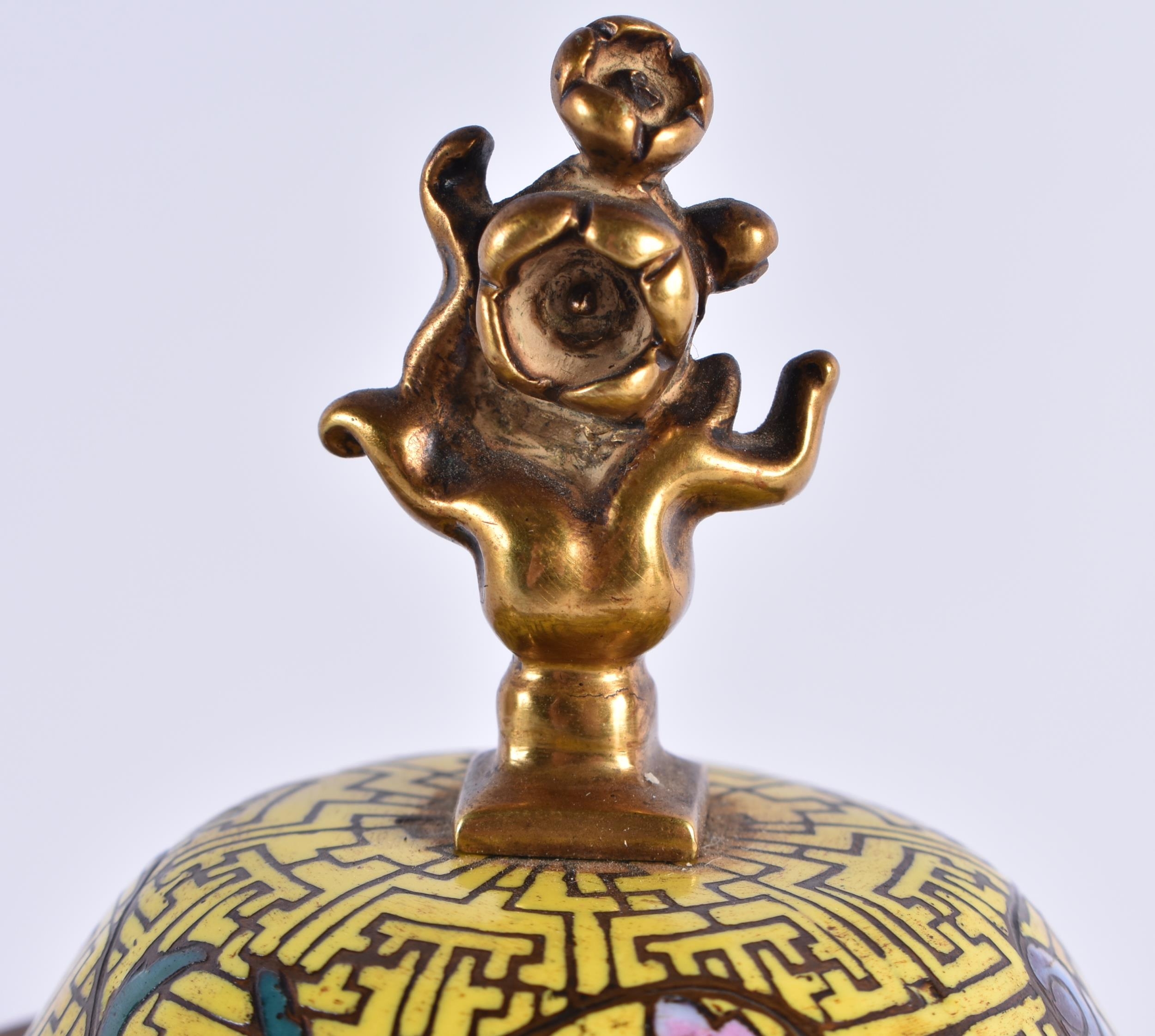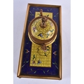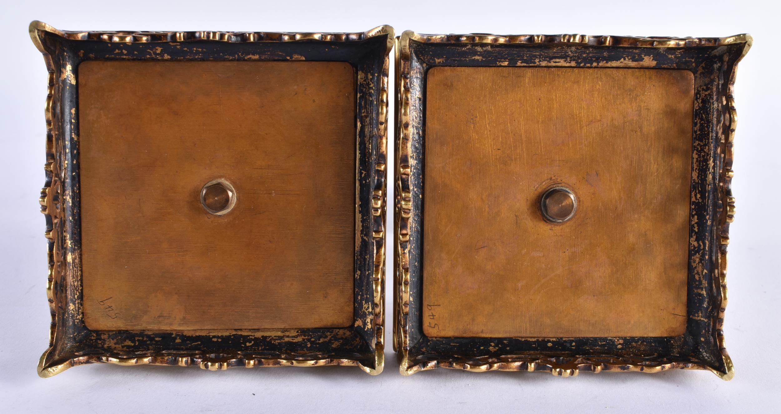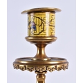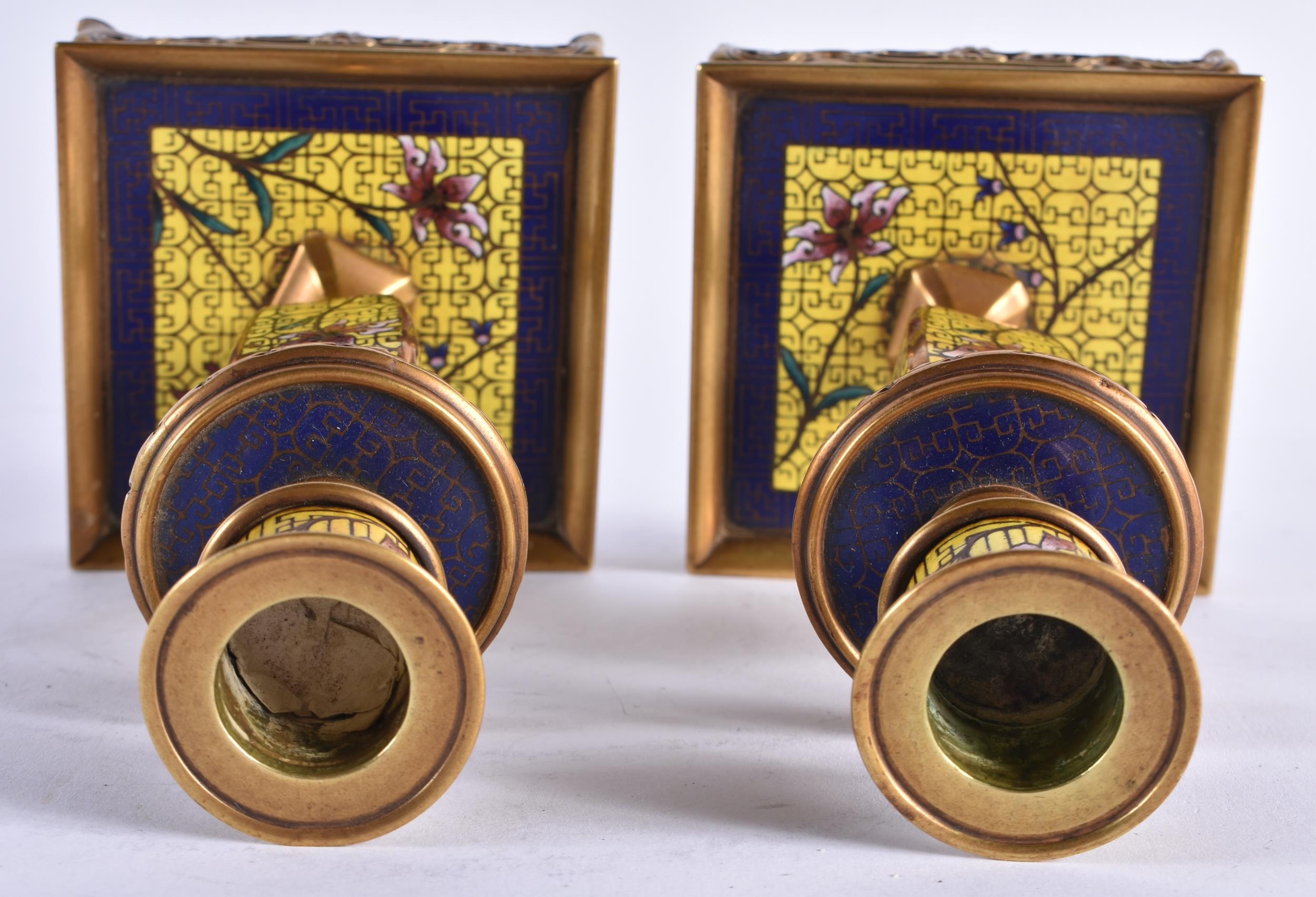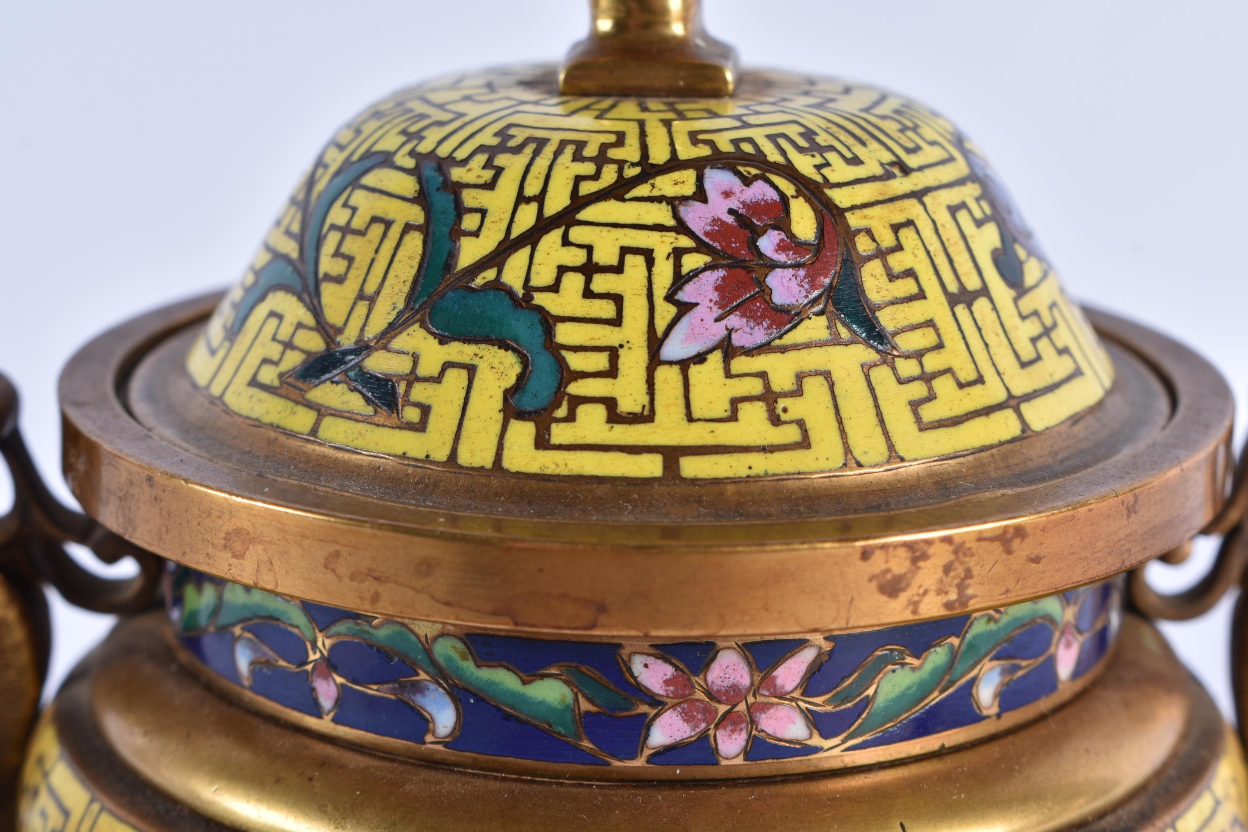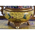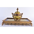 A FINE 19TH CENTURY FRENCH BRONZE AND CHAMPLEVE ENAMEL DESK GARNITURE in the manner of Barbedienne, decorated with foliage and vines. Largest 26 cm x 12 cm. (3) Note: Champlevé is an enamelling technique in the decorative arts, or an object made by that process, in which troughs or cells are carved, etched, die struck, or cast into the surface of a metal object, and filled with vitreous enamel. The piece is then fired until the enamel fuses, and when cooled the surface of the object is polished. The uncarved portions of the original surface remain visible as a frame for the enamel designs; typically they are gilded in medieval work. The name comes from the French for "raised field", "field" meaning background, though the technique in practice lowers the area to be enamelled rather than raising the rest of the surface.