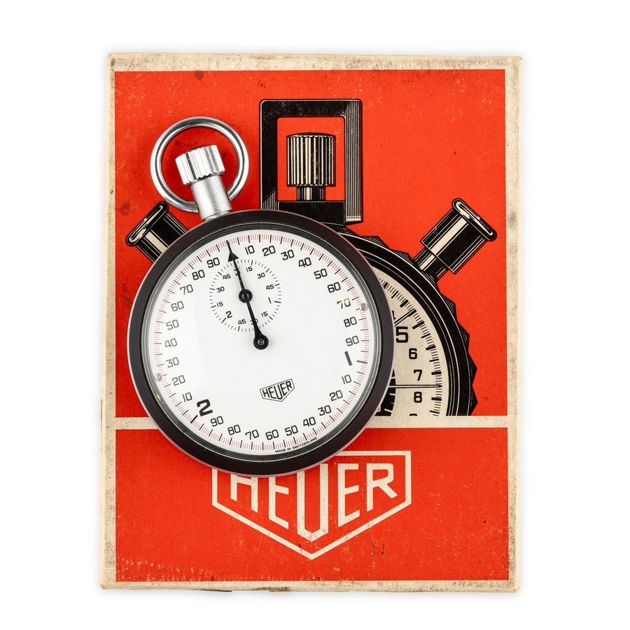 HEUER, CRONOMETRO CENTESIMALE DA GARA CON SCATOLA ORIGINALE, NUOVO FONDO DI MAGAZZINO, SVIZZERA 1960 CIRCA