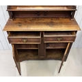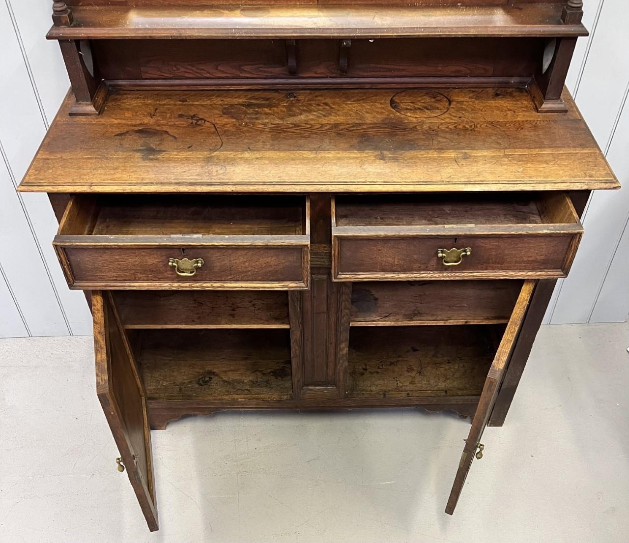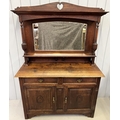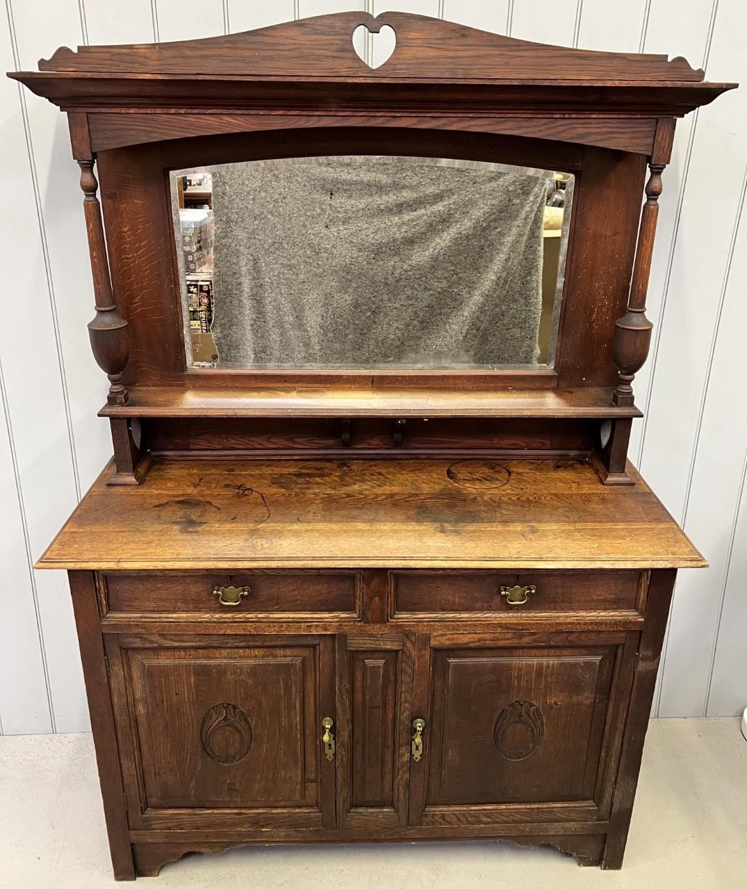 A brass handled, oak dresser with carved detailed doors and bevelled-edged mirror.