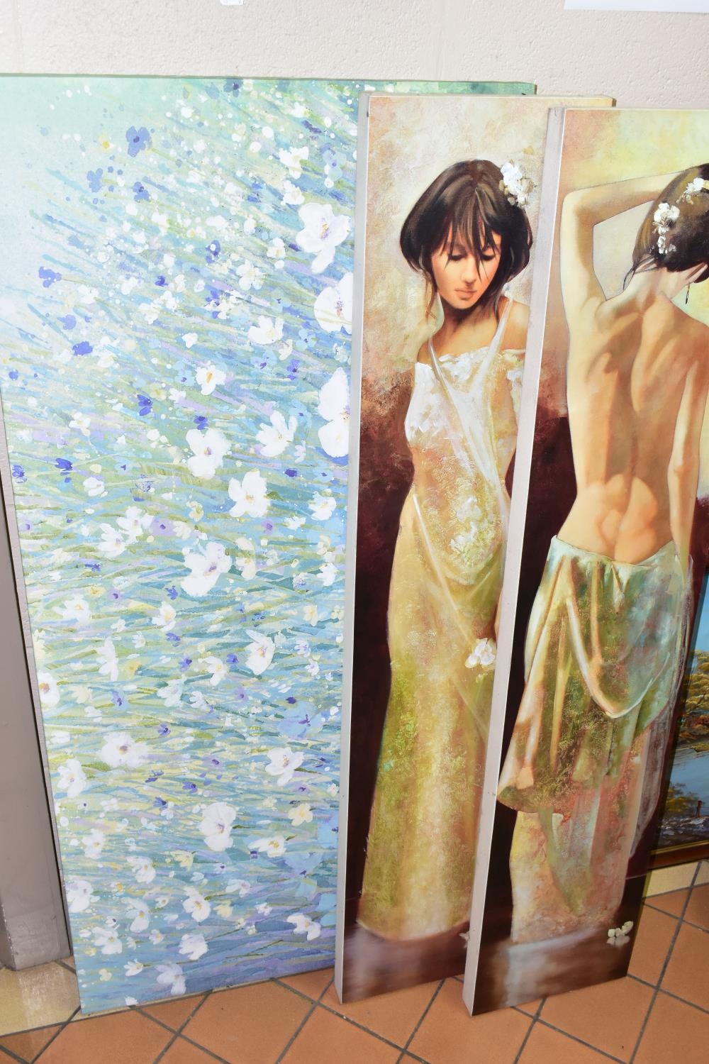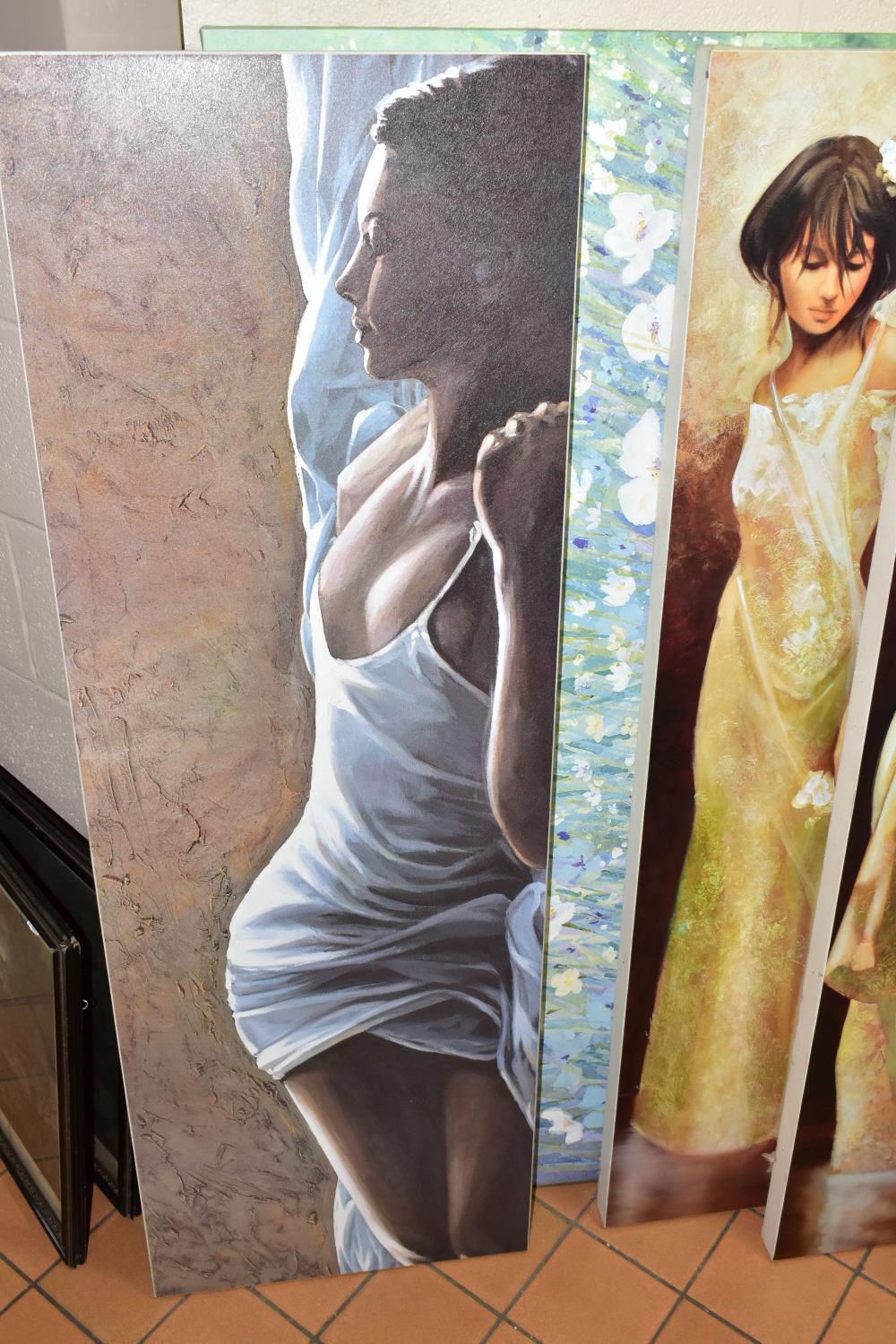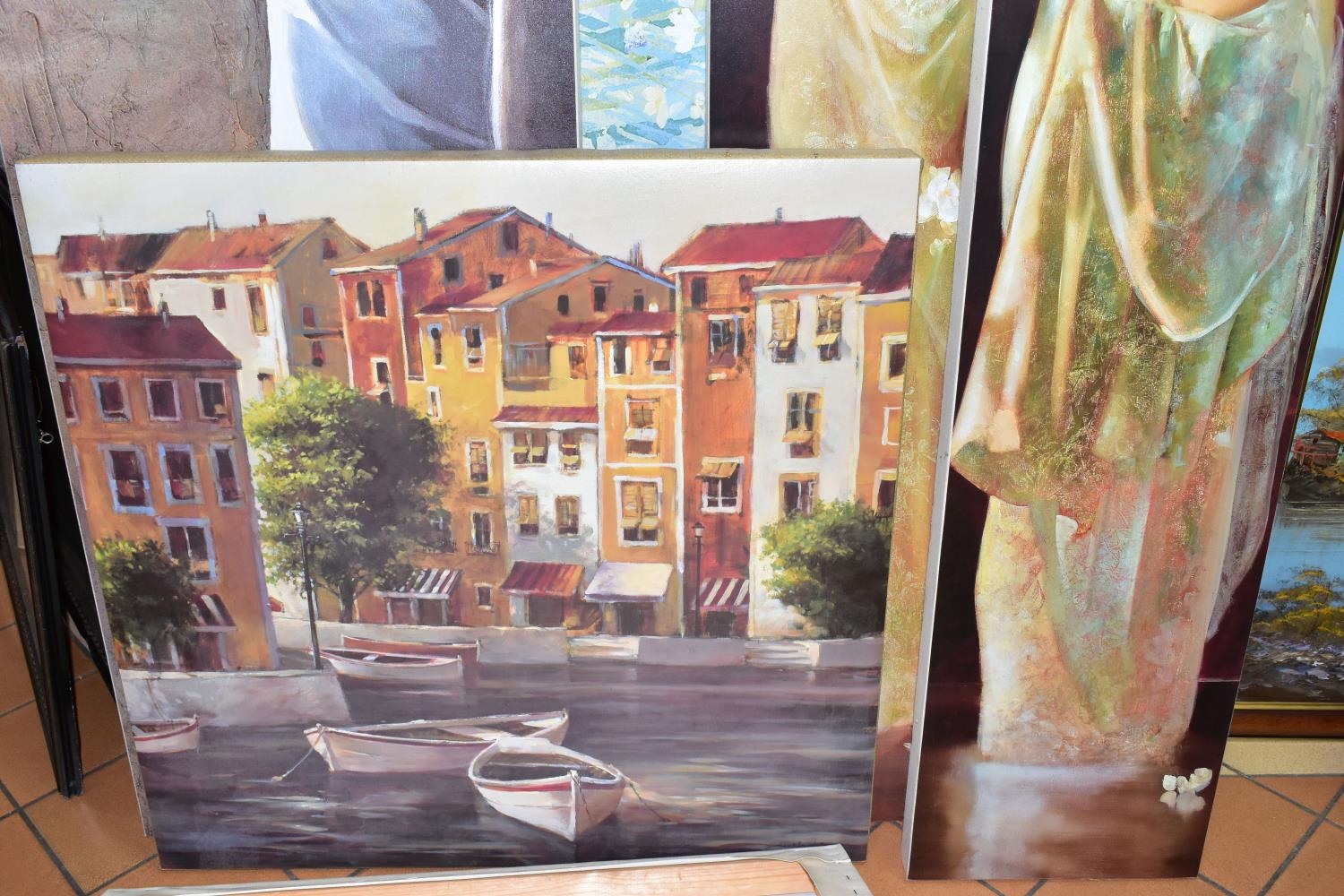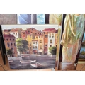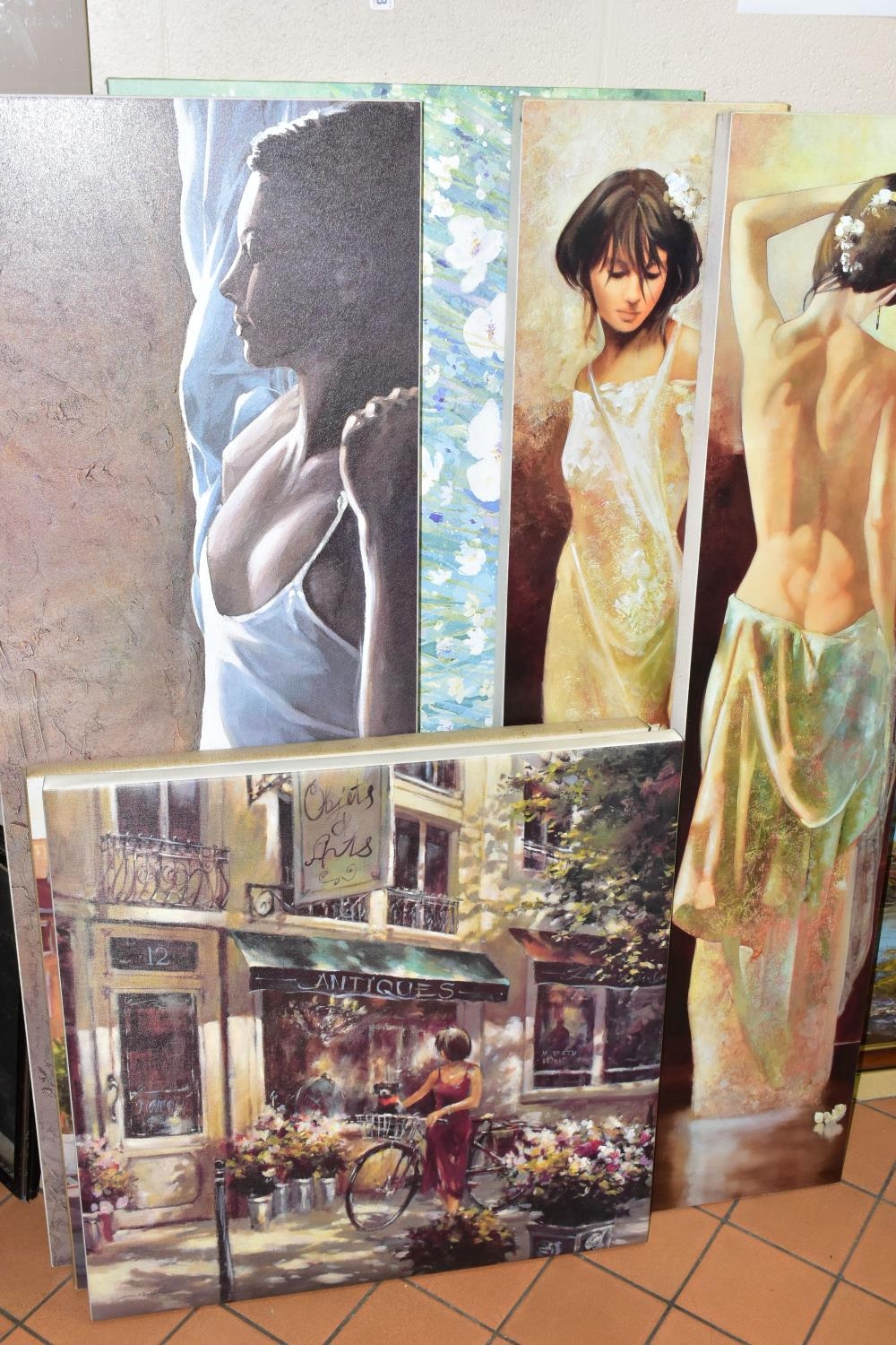 MODERN DECORATIVE WALL ART TO INCLUDE PRINTS BY ARTKO, comprising 'Calle Som Breda ii' a continental street view by Louis Du Var, 'Hazy Daisies' by C. Stephanson, 'Sognando' a female figure in repose by Giorgio Mariani, 'Objets D'Arts' a street view by Brent Heighton, an unsigned continental canal view and two unsigned full length portraits of female figures, largest size approximately 60cm x 136cm, smallest 50cm x 60cm, all in good condition (7)
