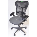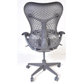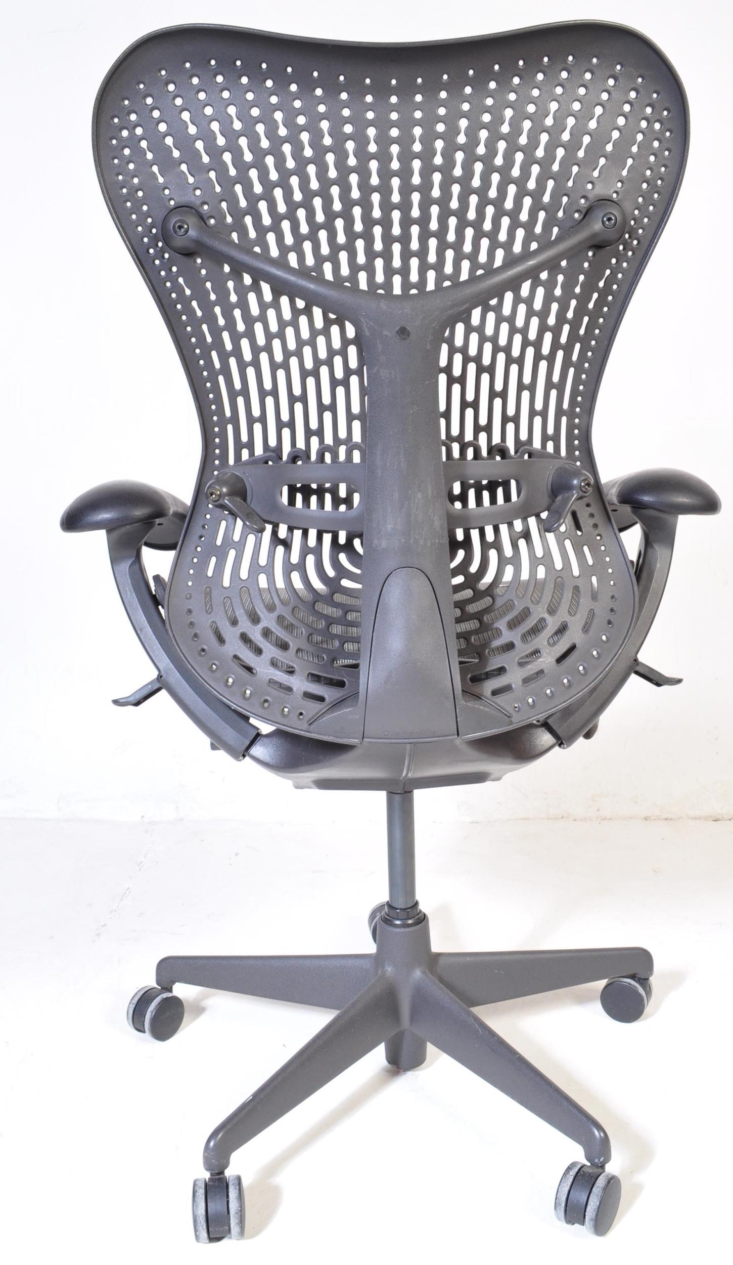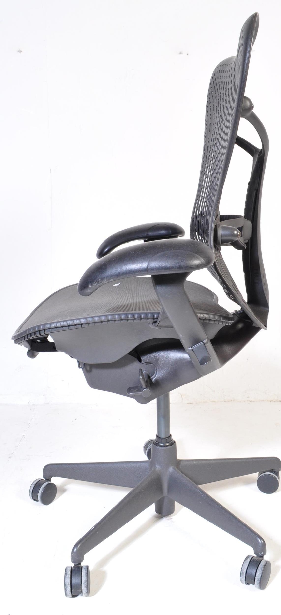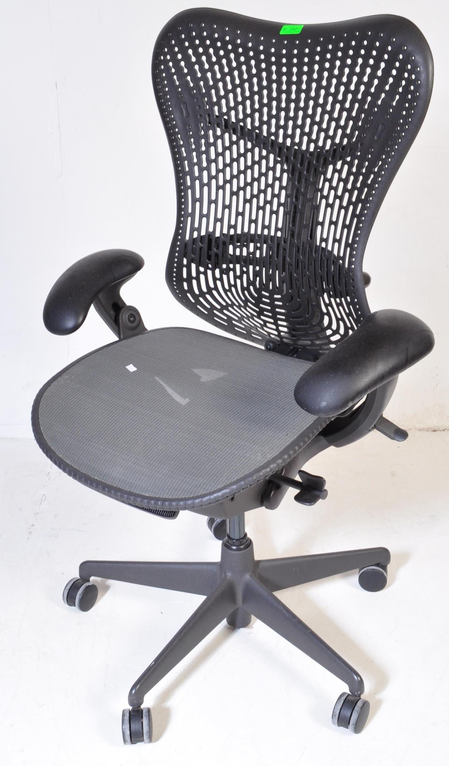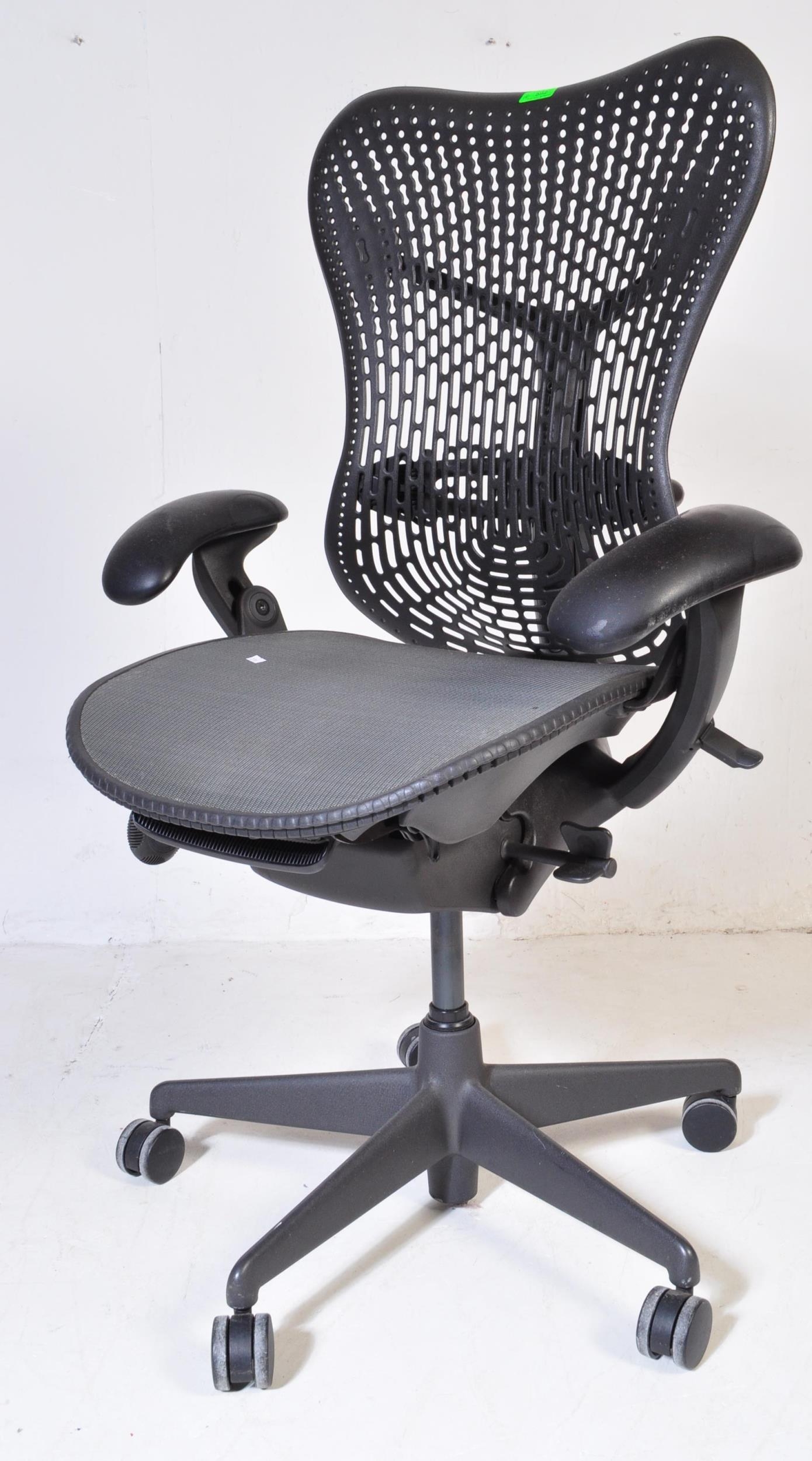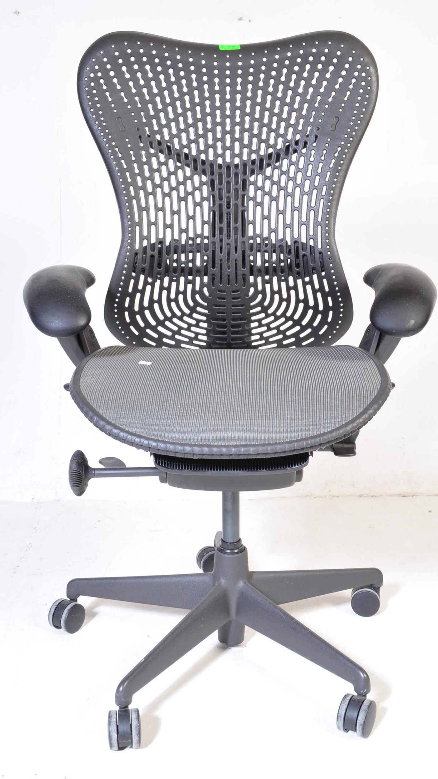 Studio 7.5 - Herman Miller - Mirra 2 - A retro late 20th Century swivel desk office chair having adjustable positioning for posture. The armchair raised on a five point star base and castors finished in black. Mould marks for Herman Miller to the back. Measures approx.; 102cm x 73cm.