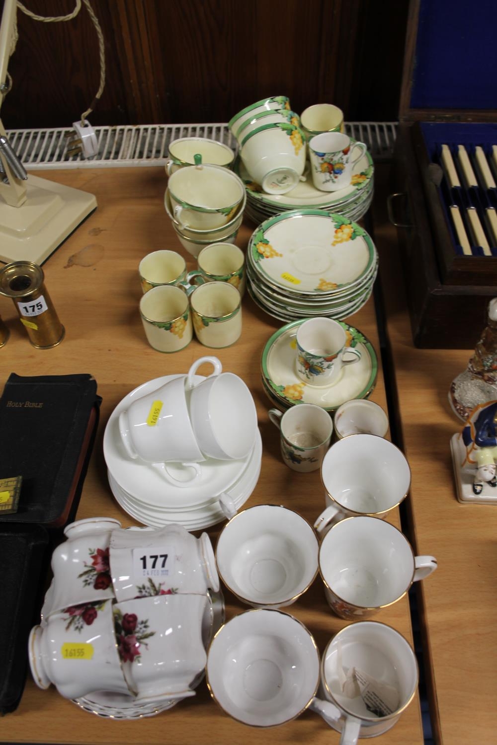 Crown Staffordshire part coffee set, commemorative beakers, Wedgwood tea ware, etc.