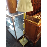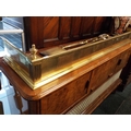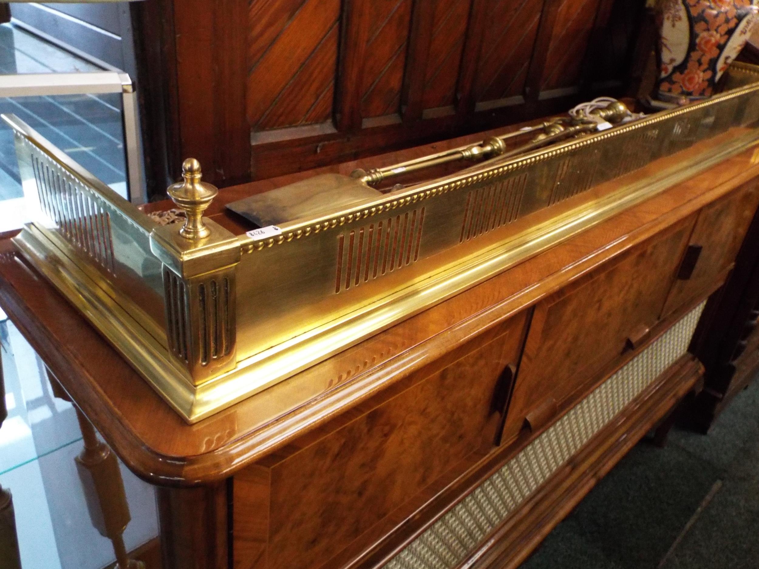 A brass fire fender 56” long together with four brass fireside tools